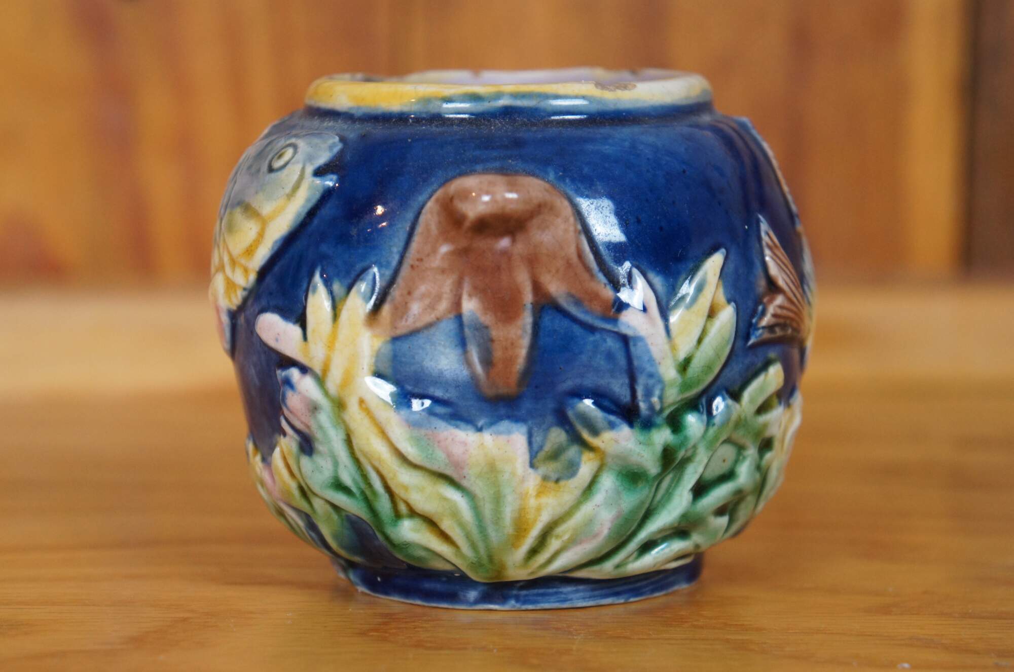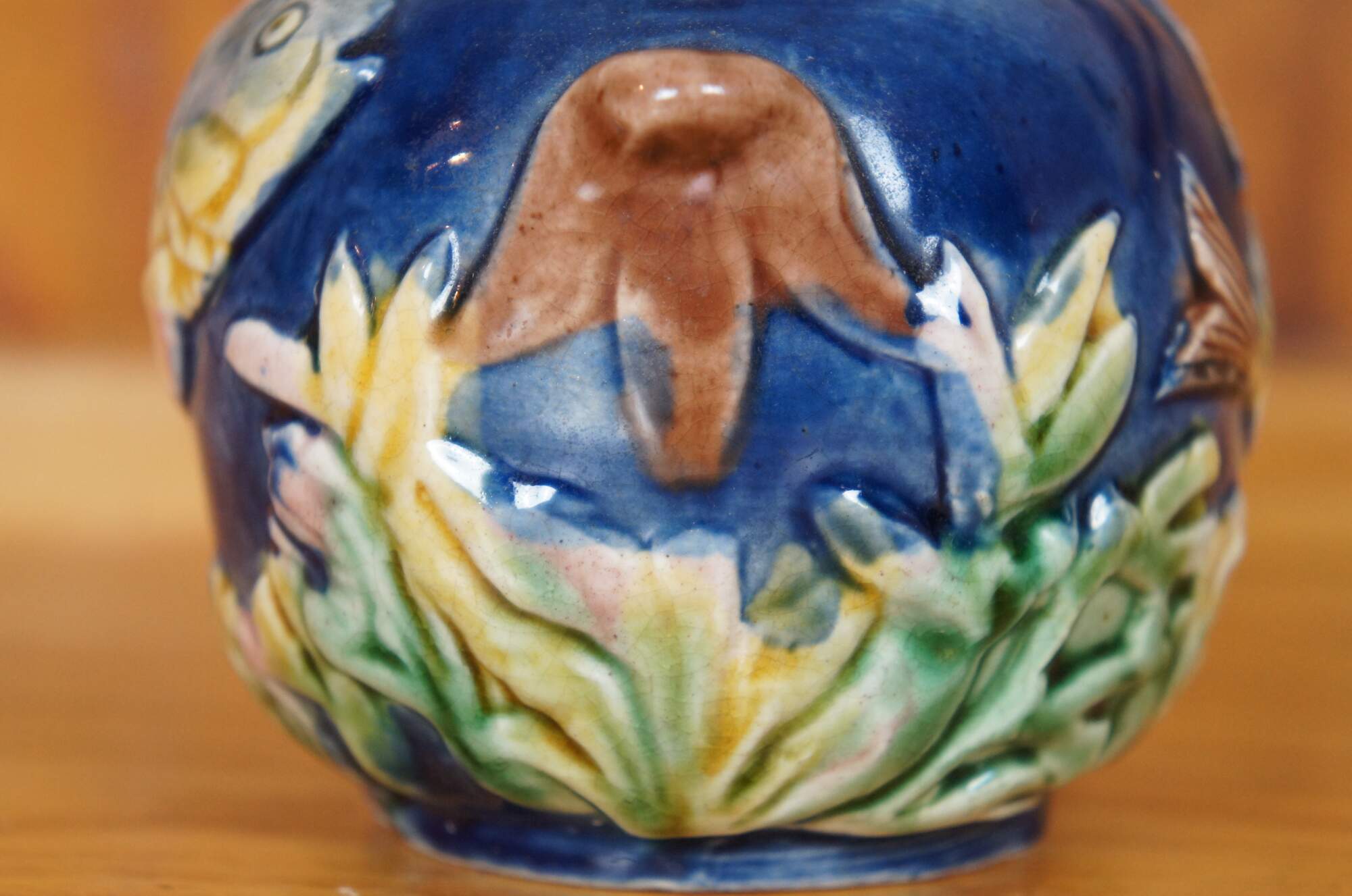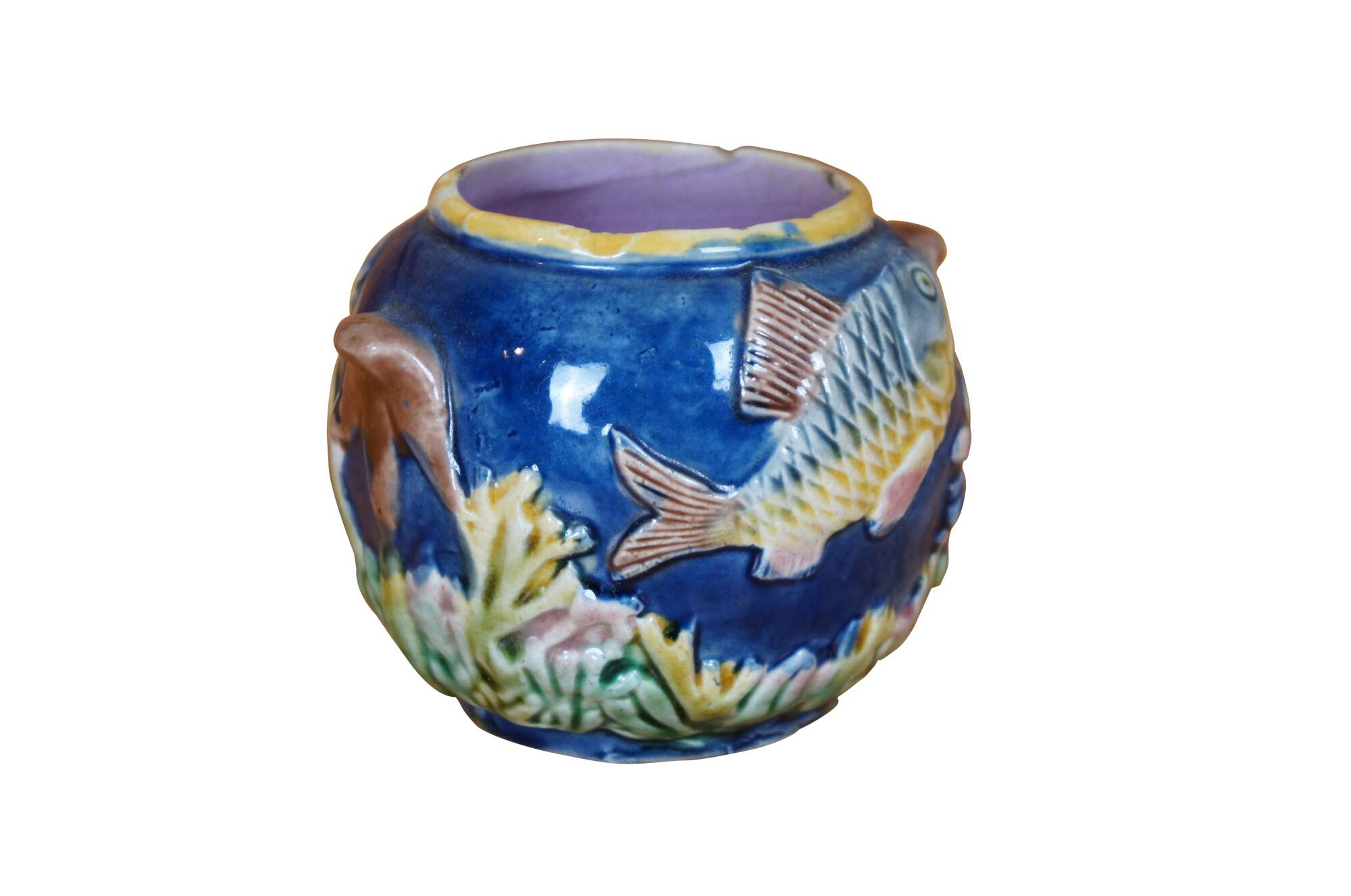 Antique Majolica nautical ocean theme sugar bowl featuring fish and seaweed against a blue ground.