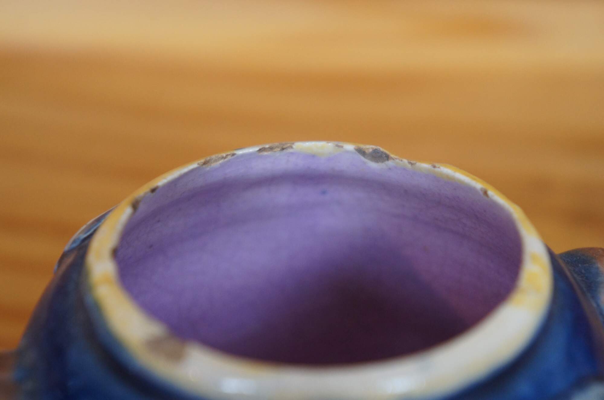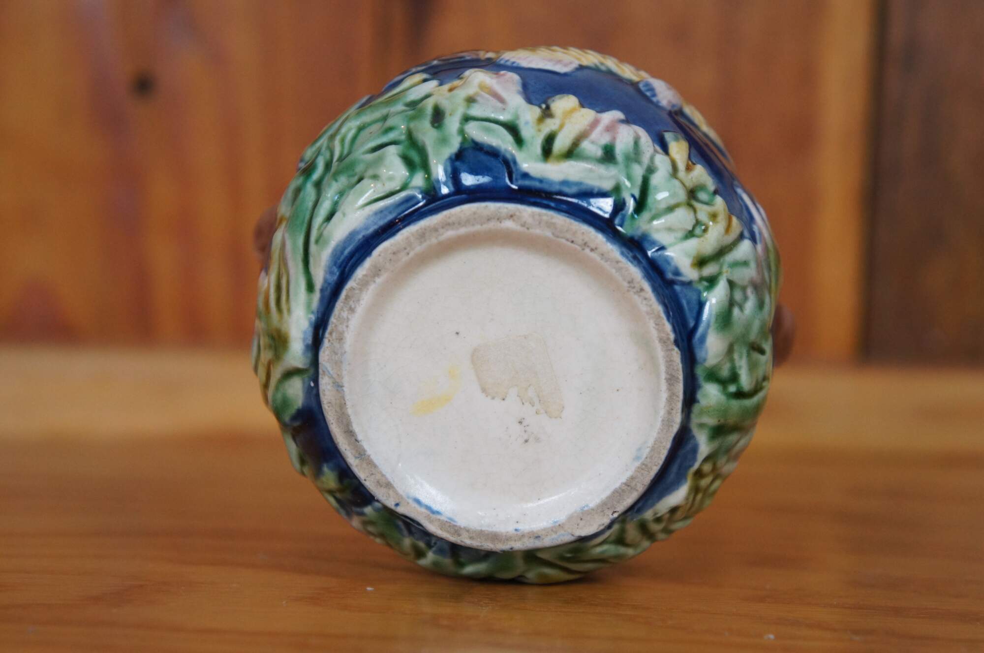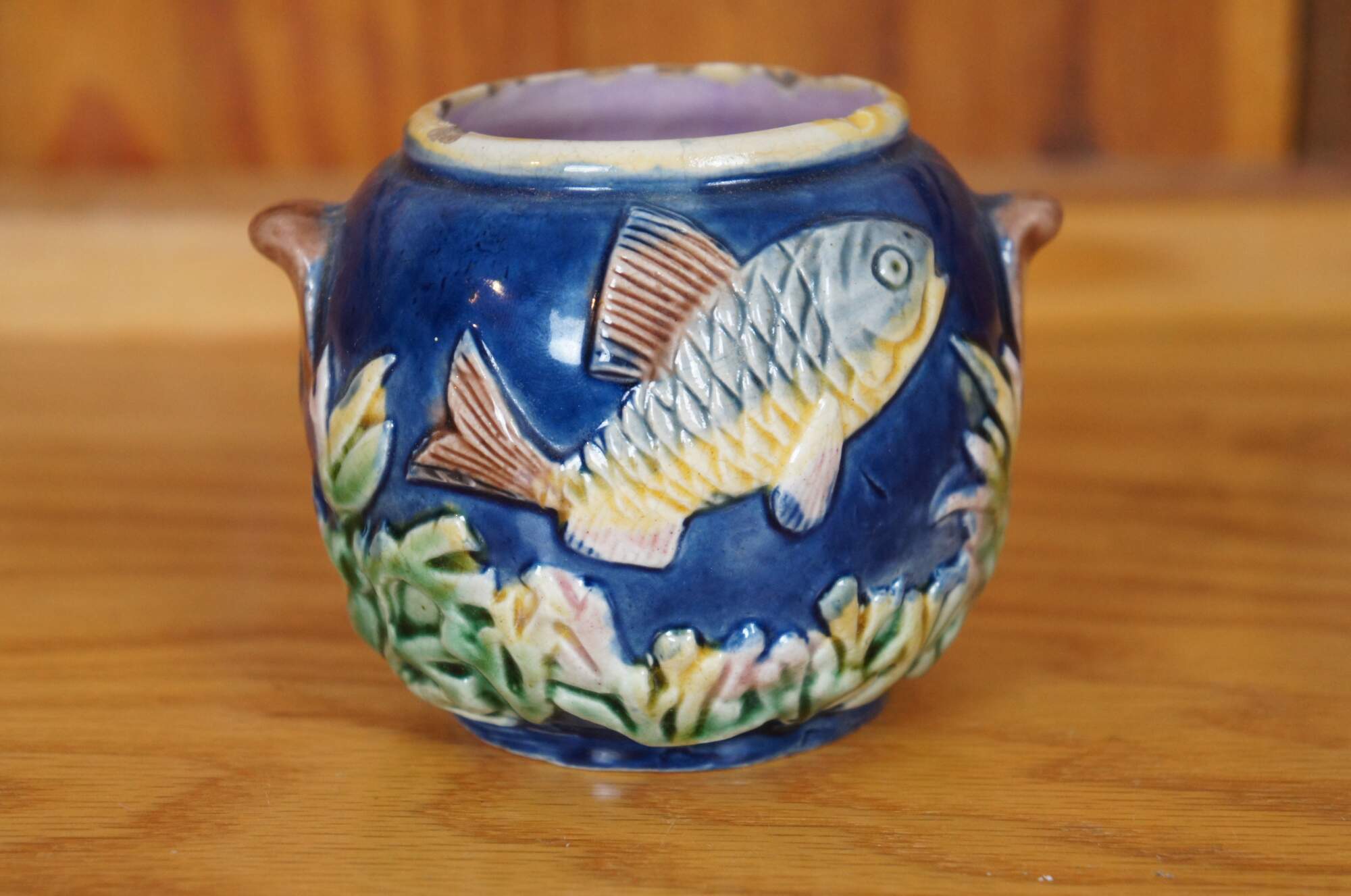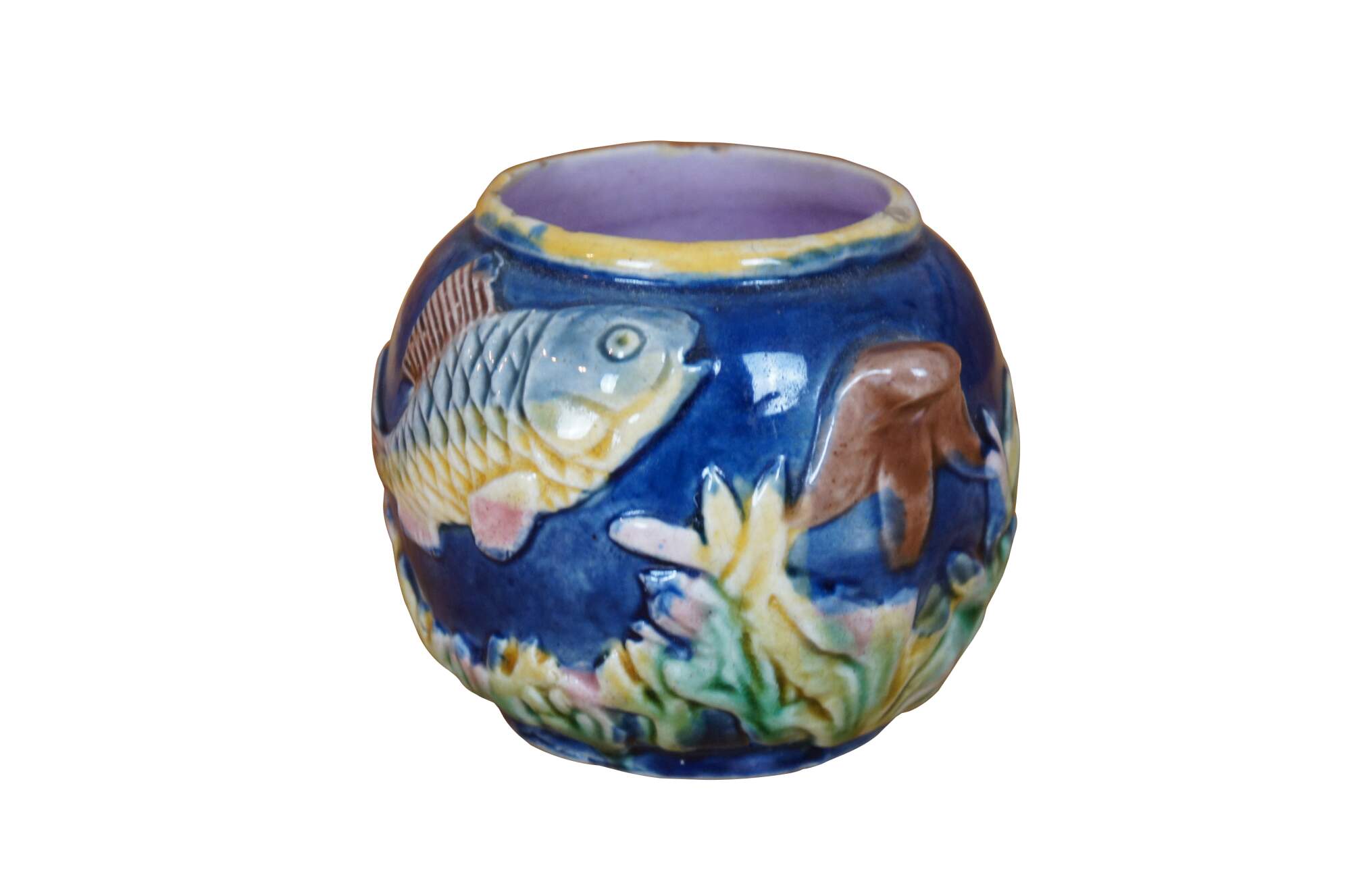 Antique Majolica nautical ocean theme sugar bowl featuring fish and seaweed against a blue ground.