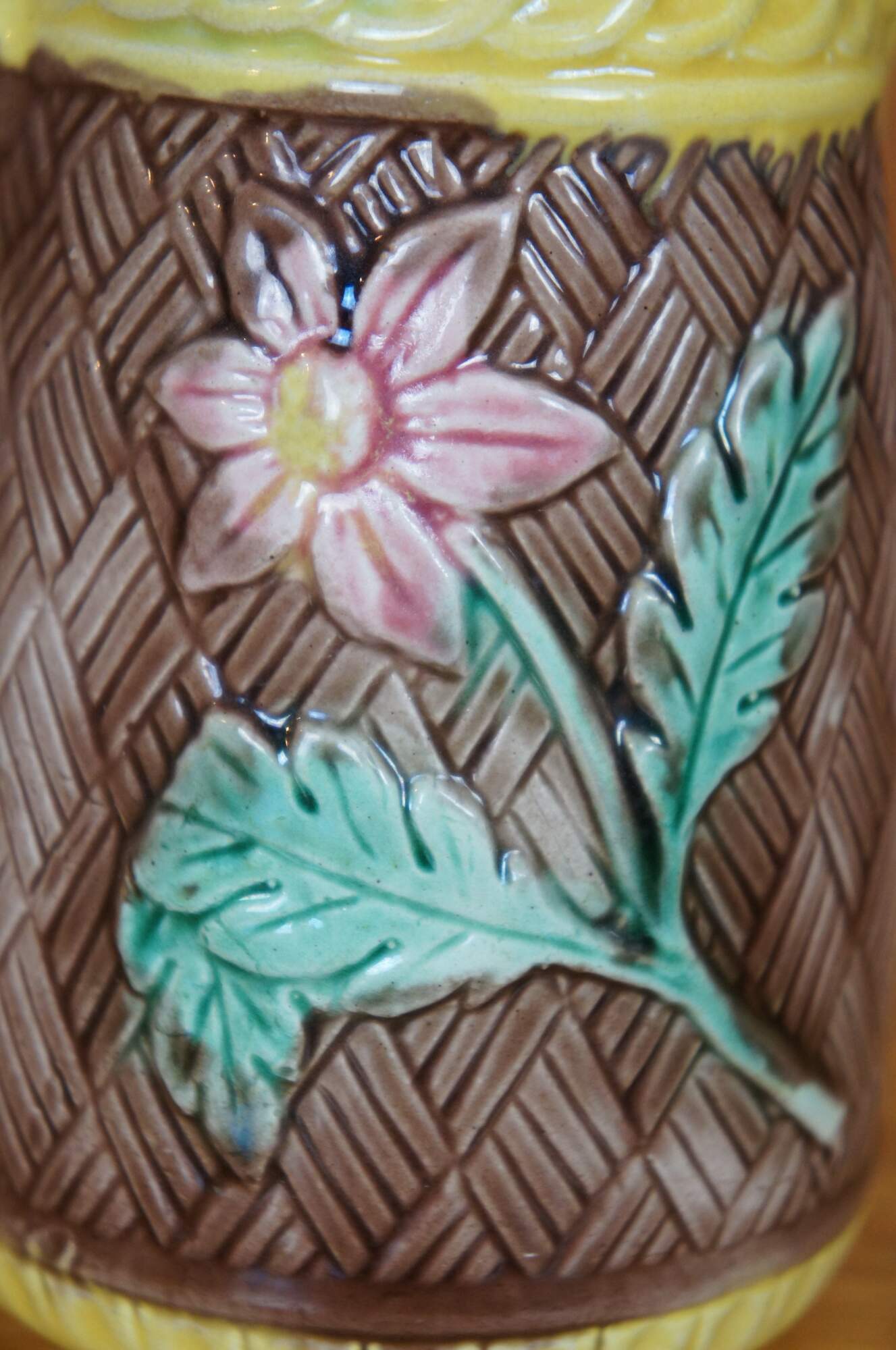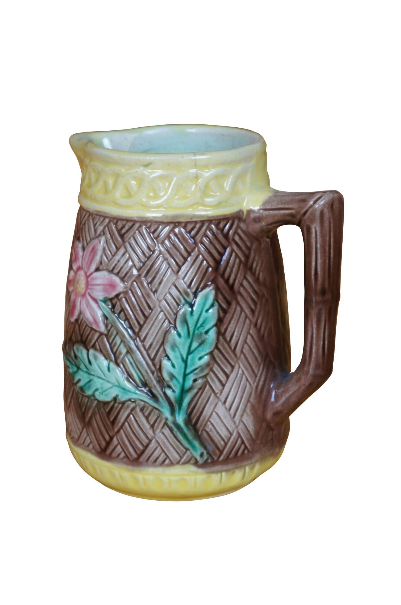 Antique Majolica creamer pitcher featuring a brown basketweave and flower design.