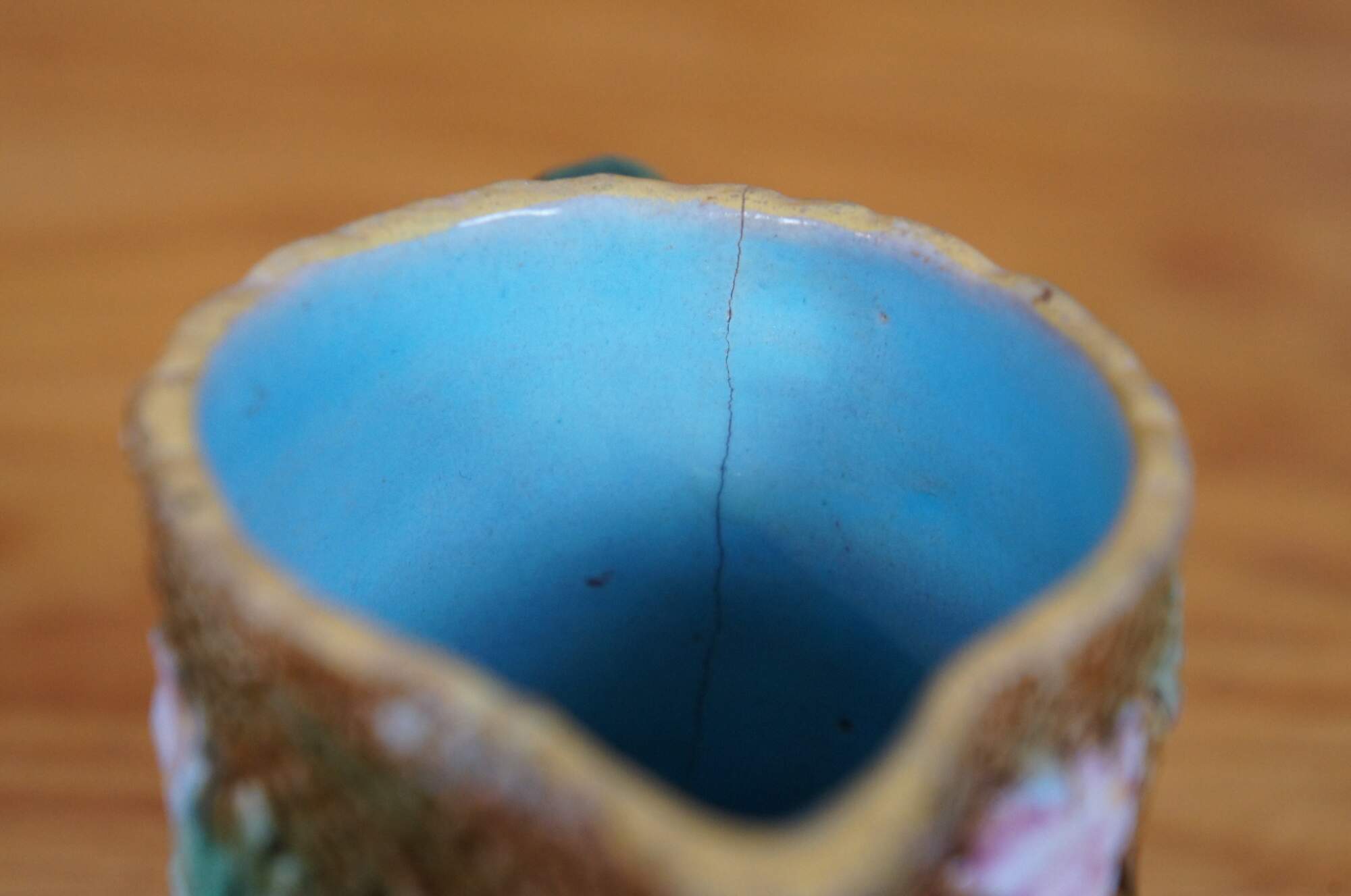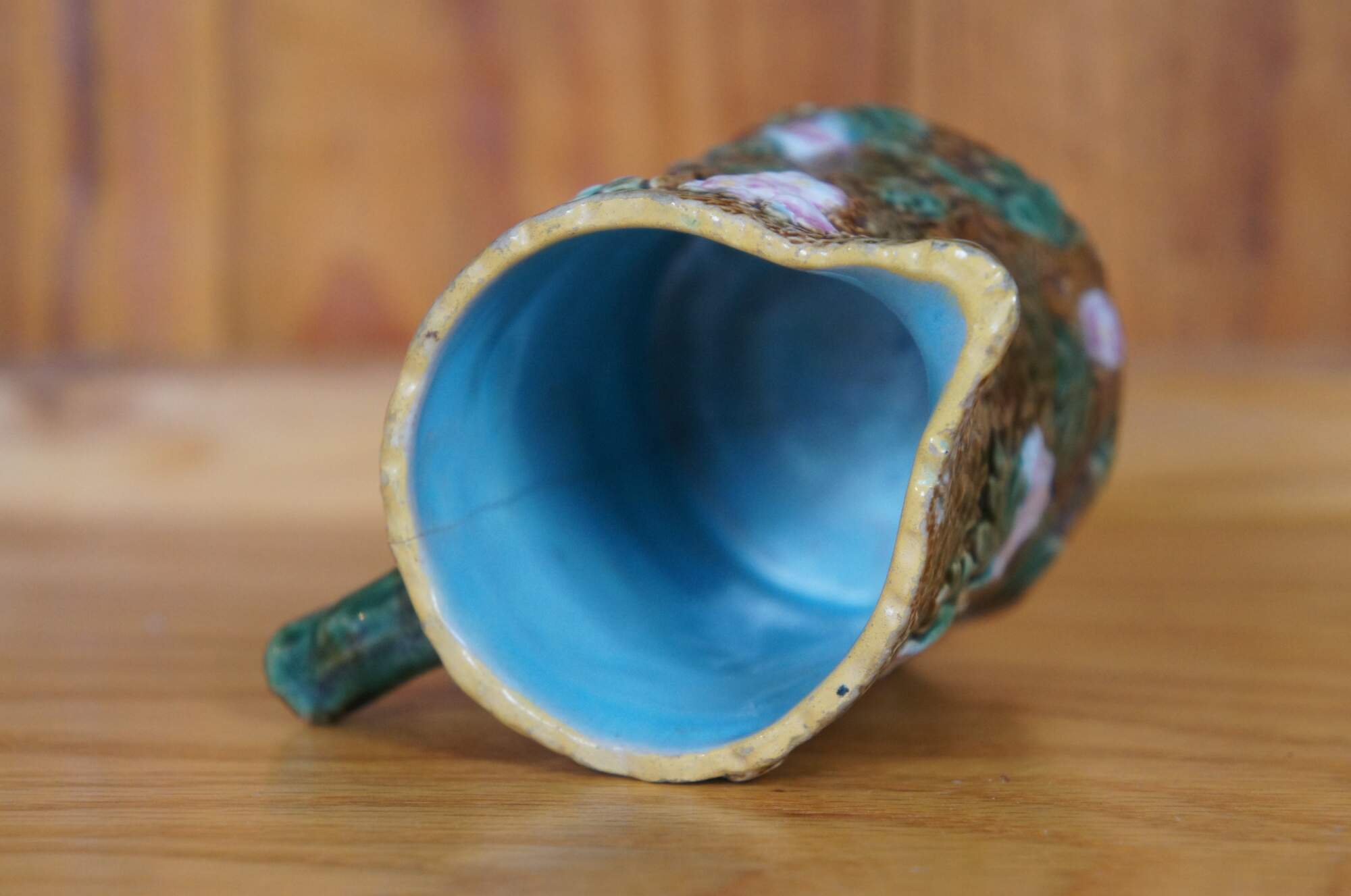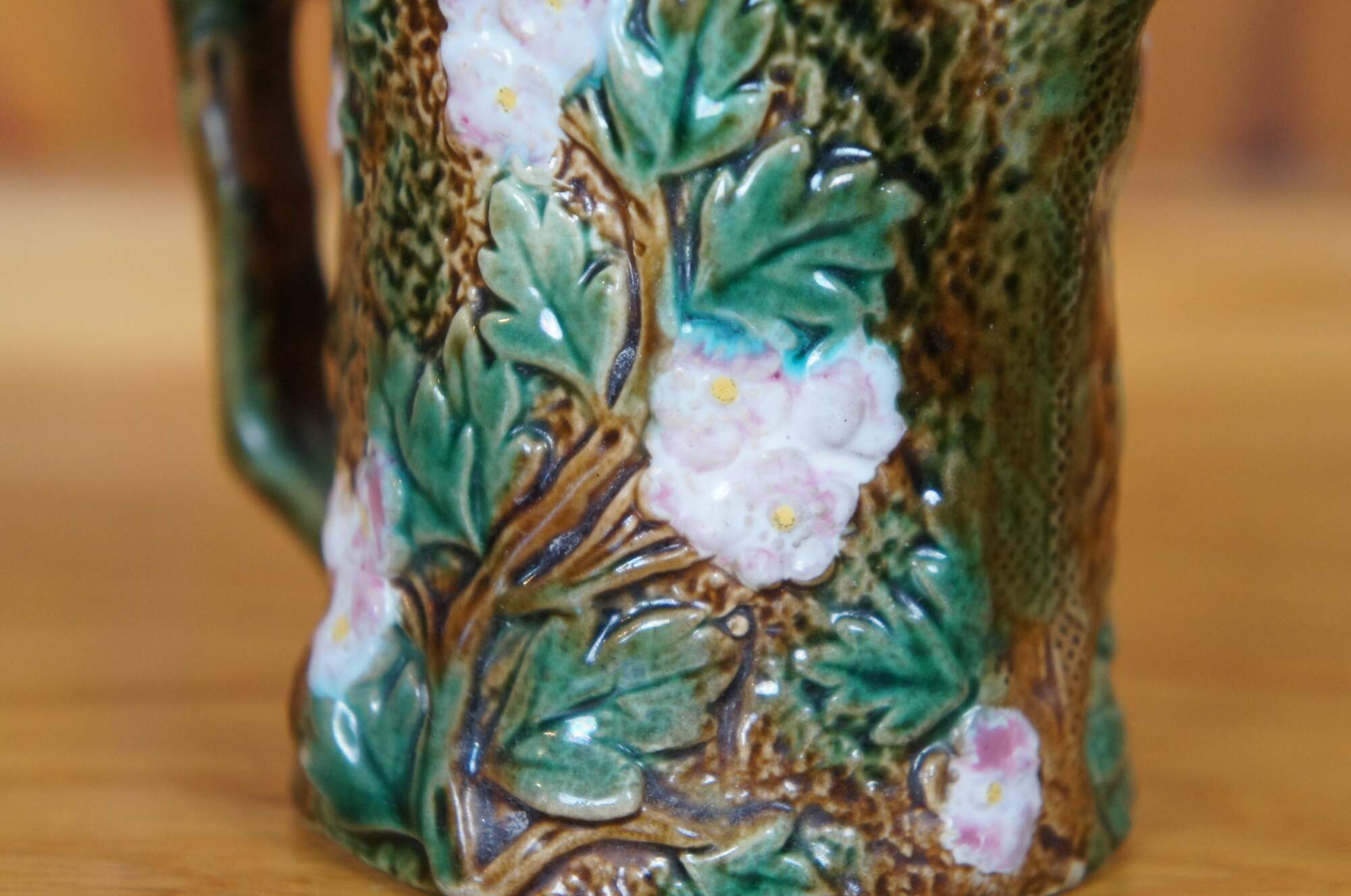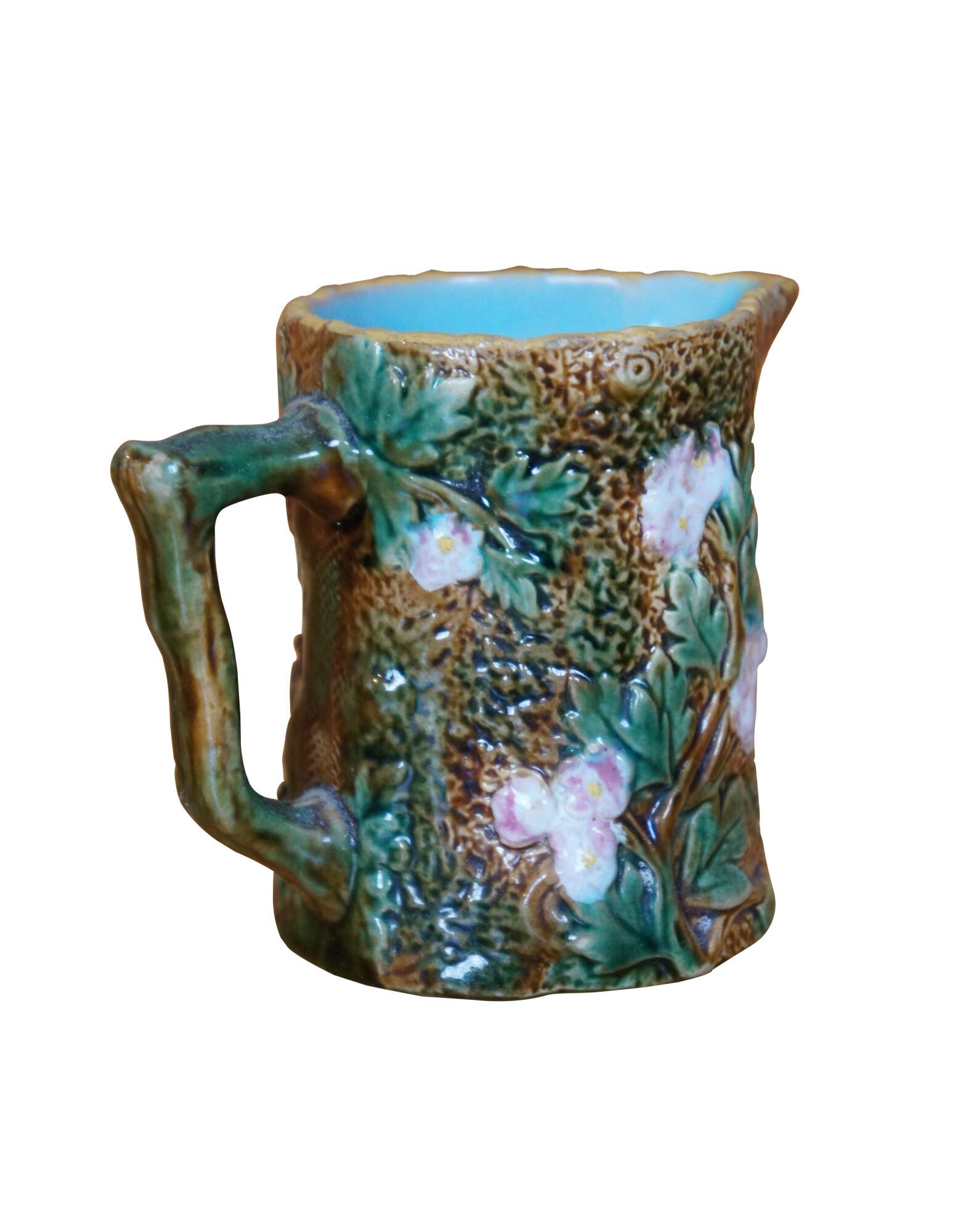 Antique Majolica George Jones creamer pitcher featuring a rustic tree / bark theme with mayflower / hawthorn tree / flower blossoms and branch handle. Marked 3368.