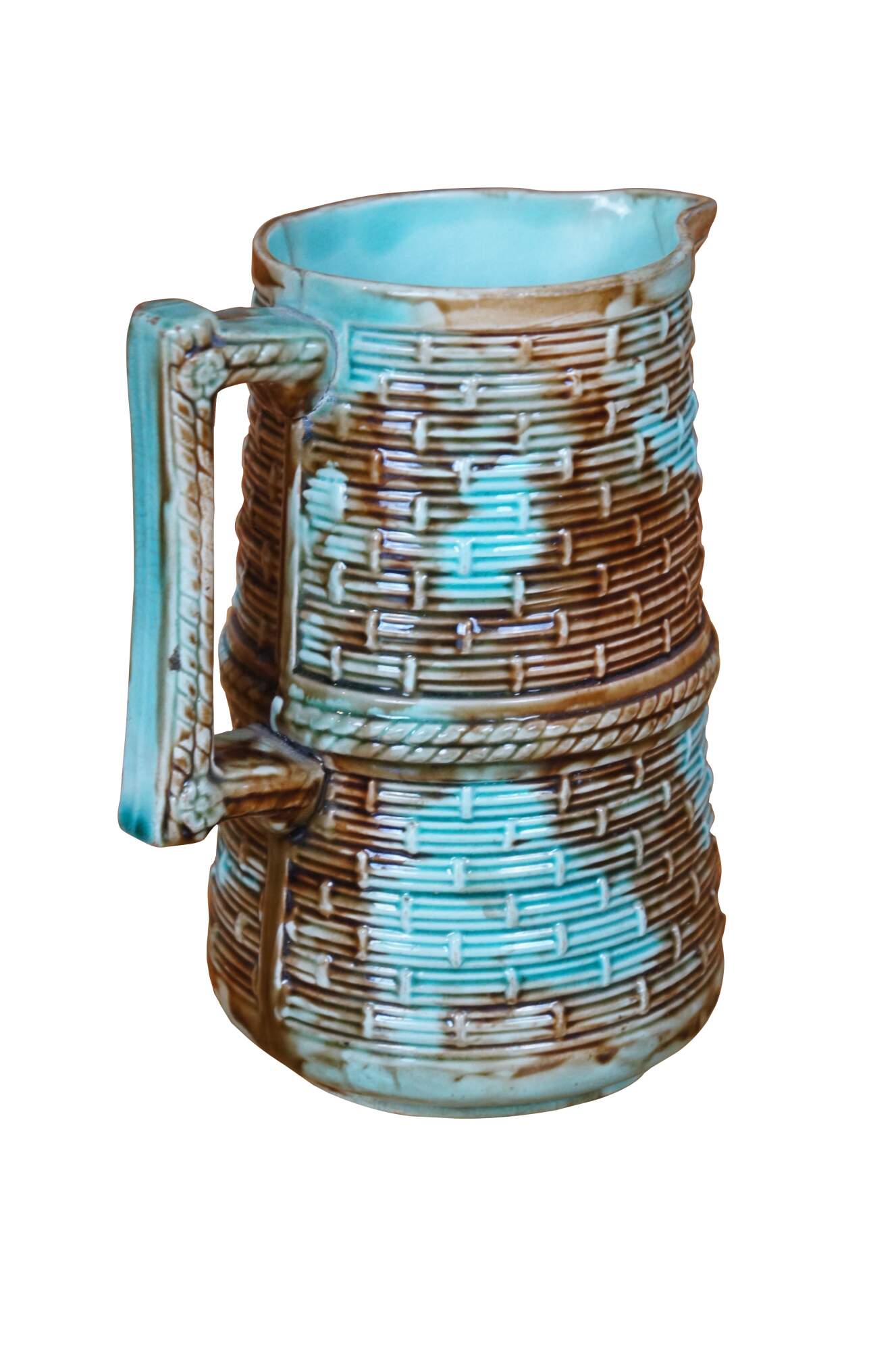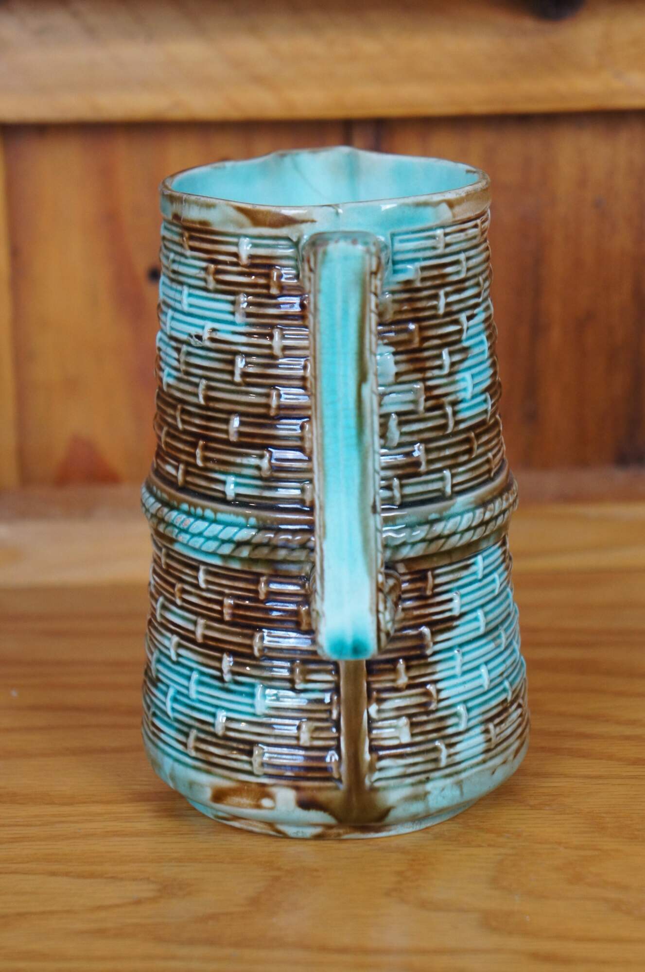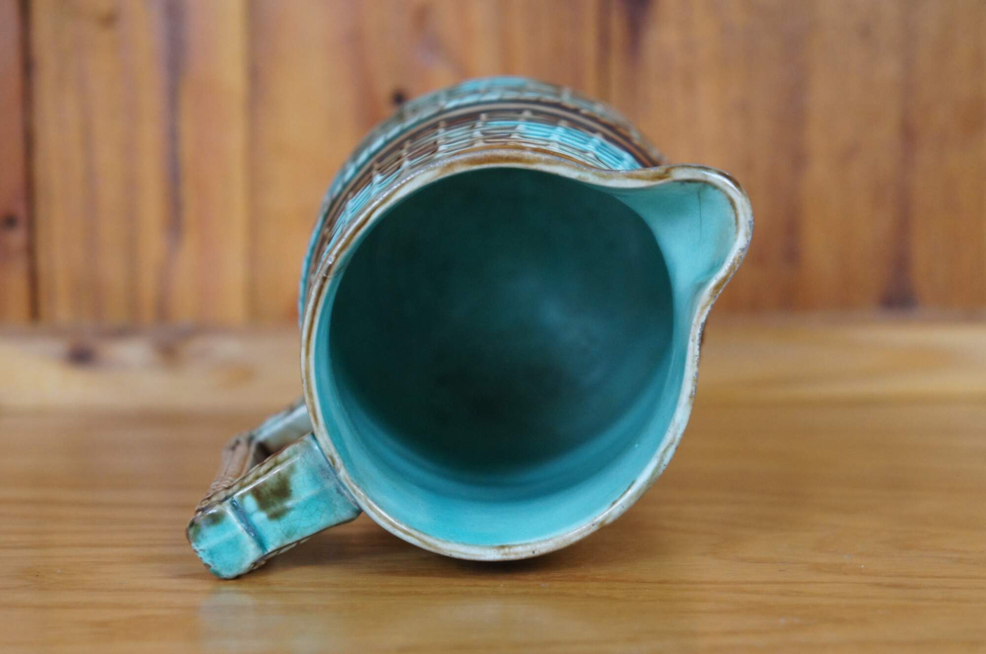 Antique Majolica basketweave creamer pitcher or jug featuring a woven basket design in Southwestern turquoise blue and mottled brown.