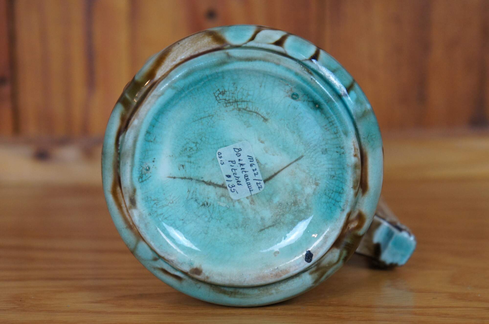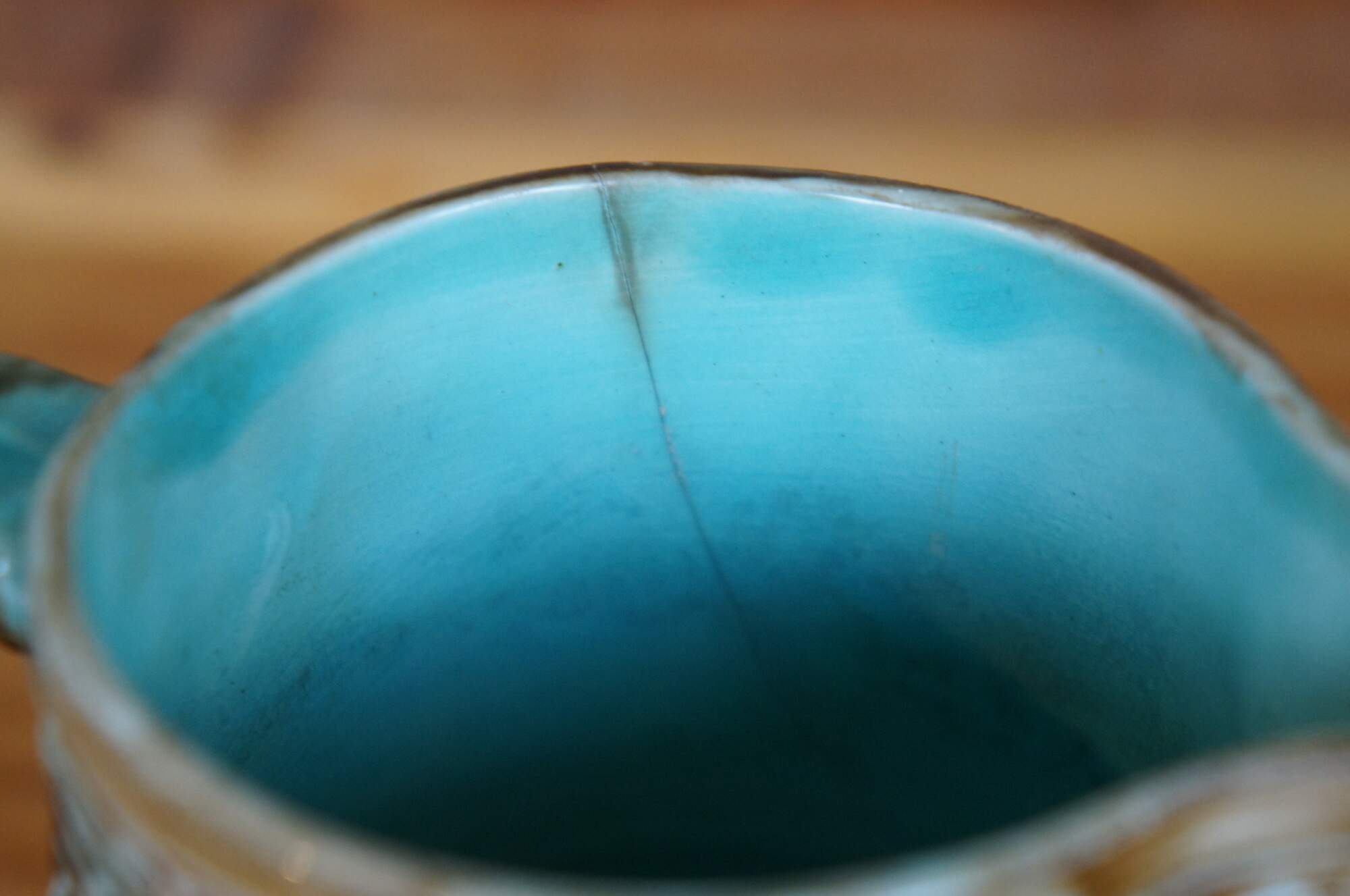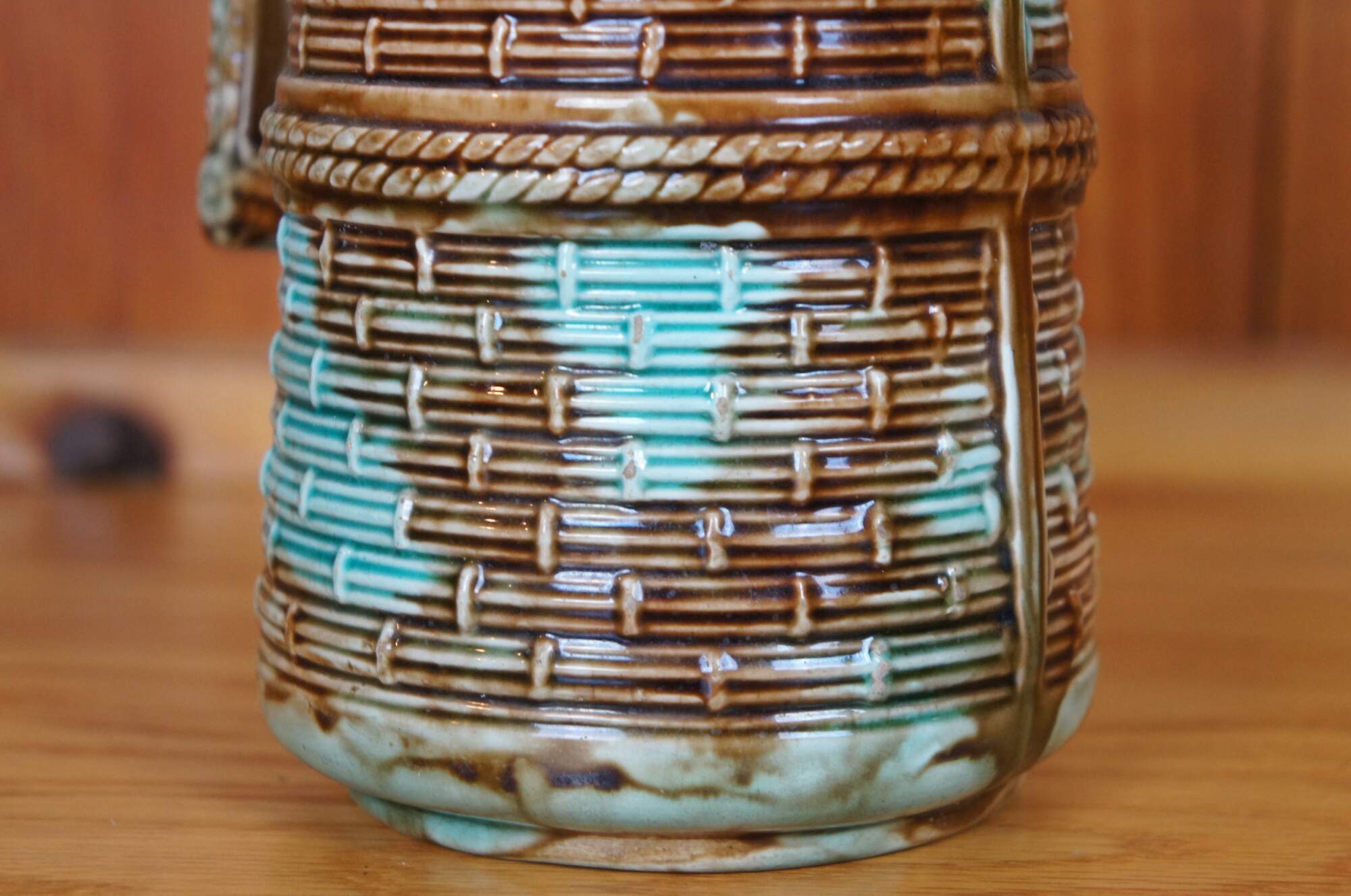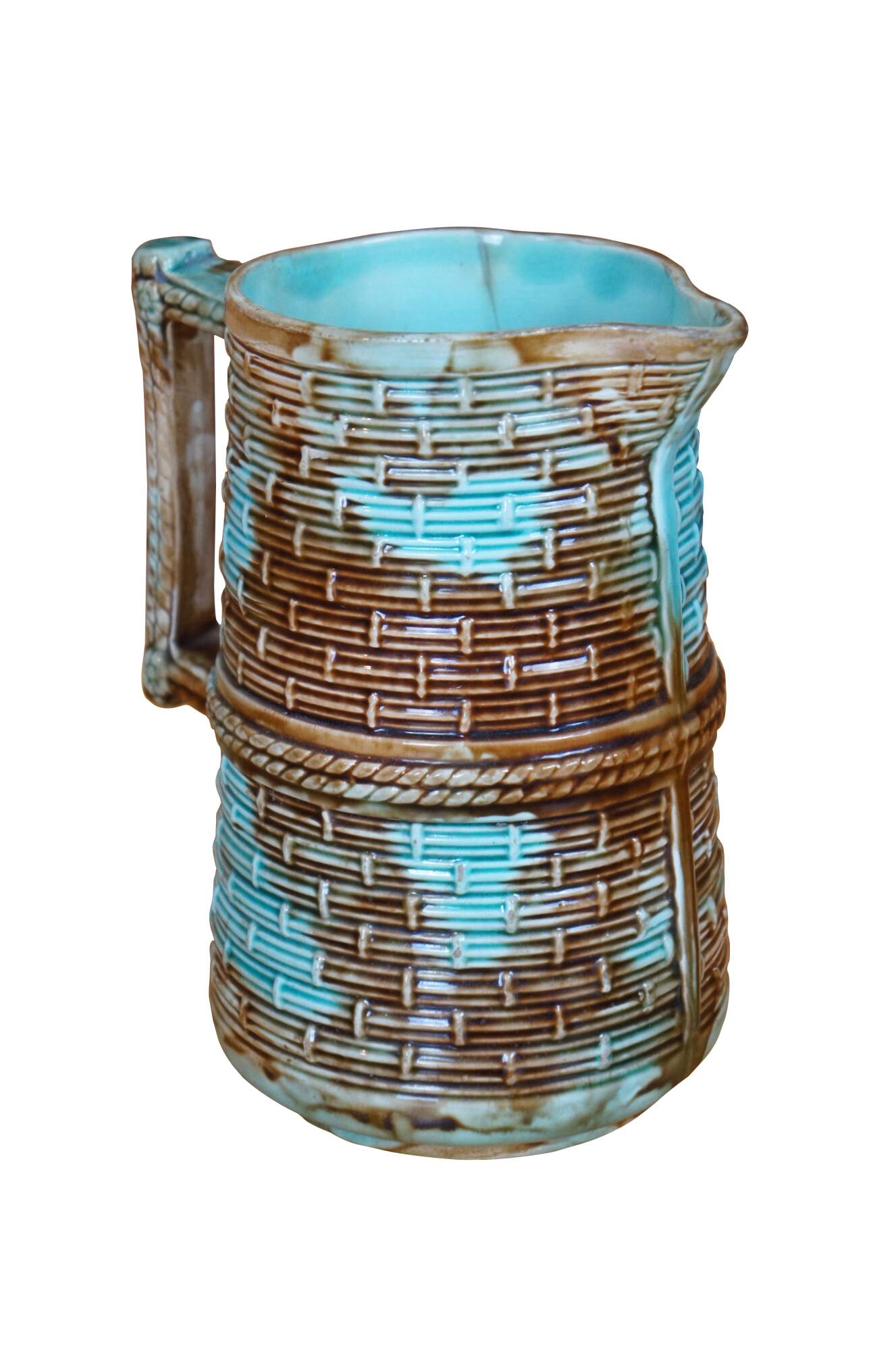 Antique Majolica basketweave creamer pitcher or jug featuring a woven basket design in Southwestern turquoise blue and mottled brown.