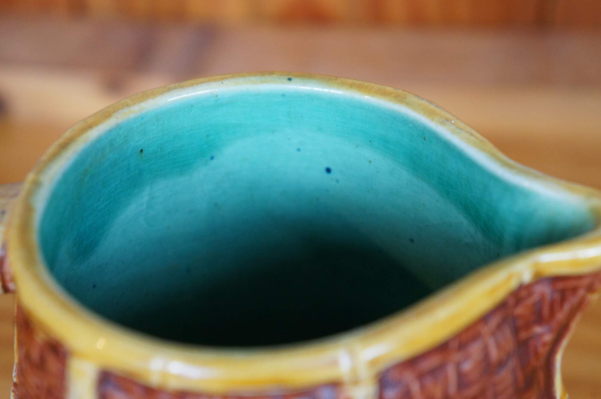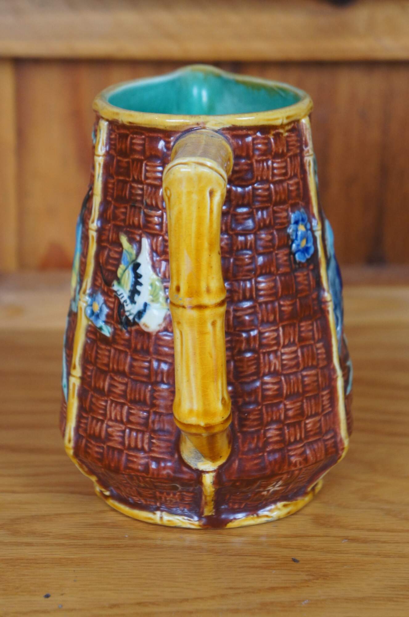 Antique English Aesthetic movement Majolica pitcher or jug featuring a bamboo and basketweave design with hummingbirds, butterfly and flowers, turquoise interior. British Registration mark on base.
