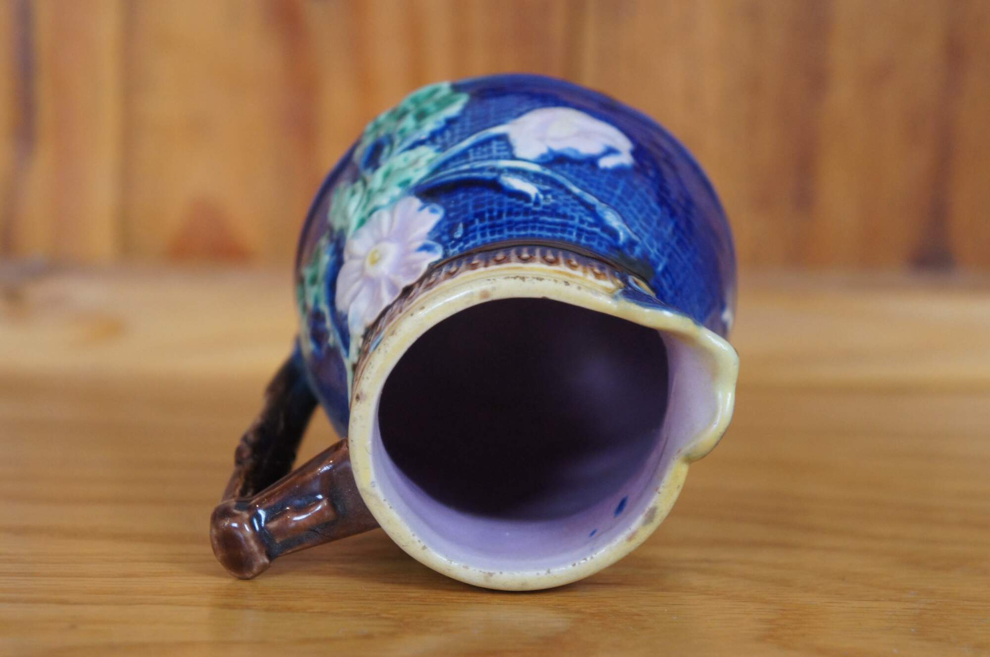 Antique Griffin Smith Hill Etuscan Majolica creamer pitcher featuring a floral theme with dogwoods flowers and butterfly spout, accented with basketweave base.