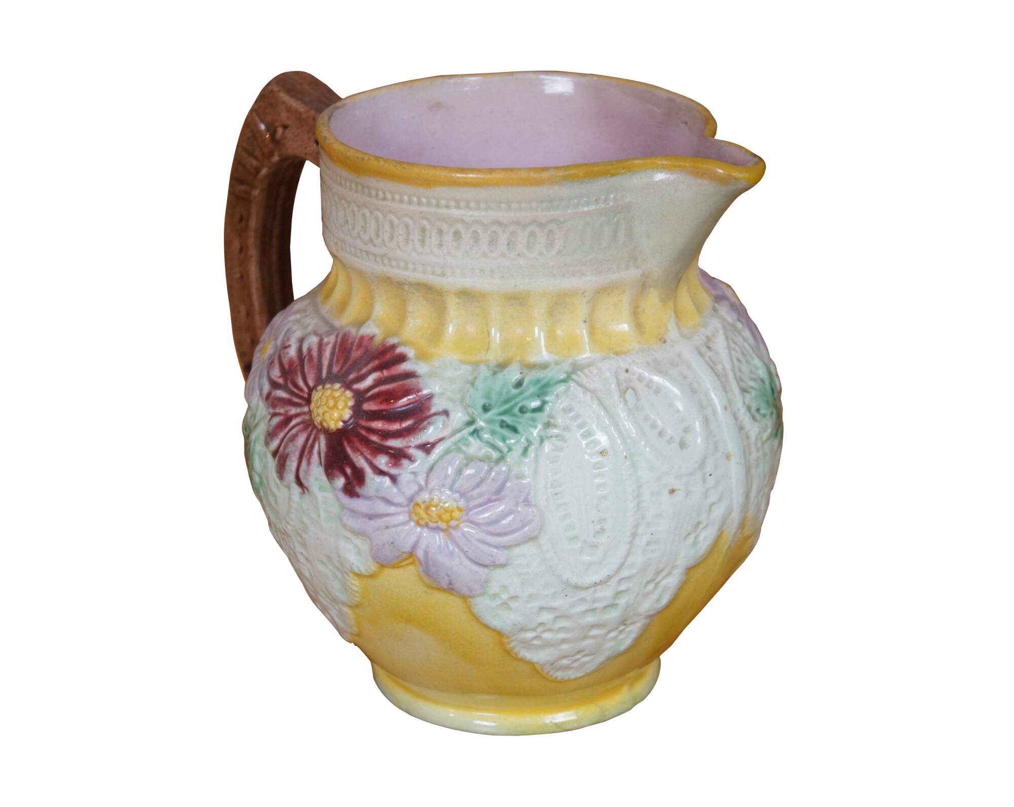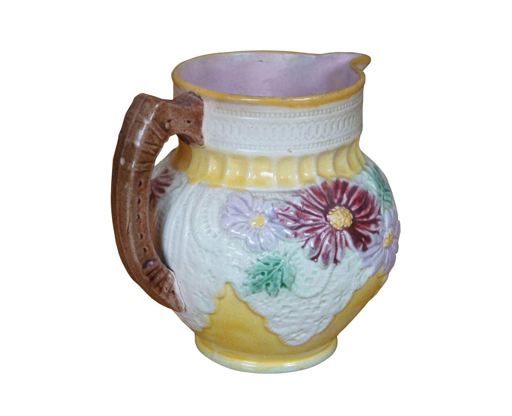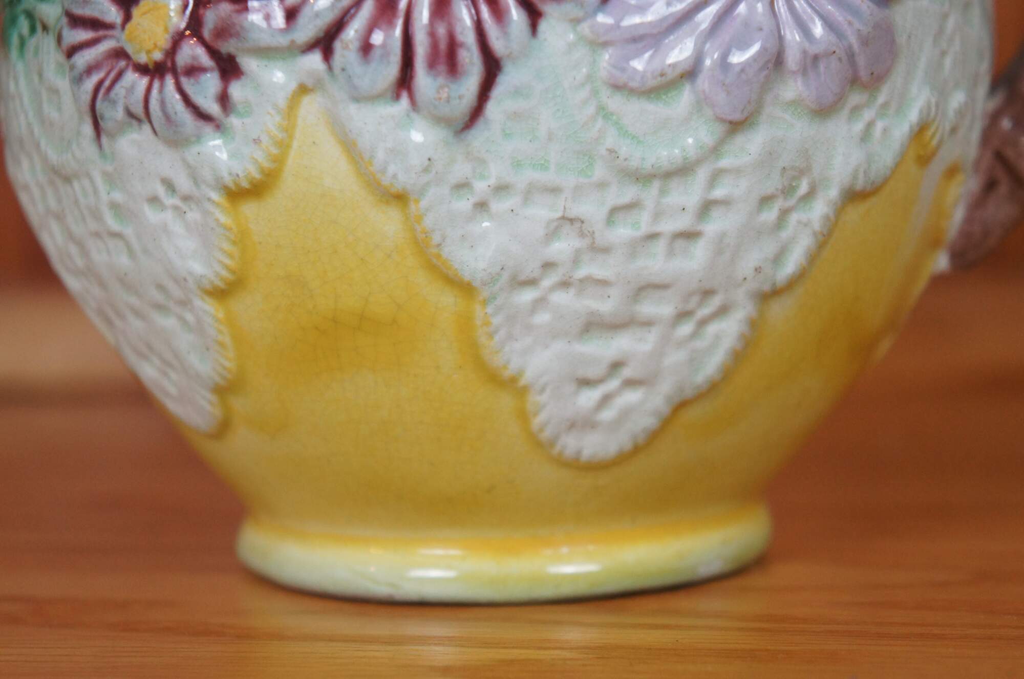 Antique Majolica pitcher / jug / carafe featuring a design of daisies and lace.