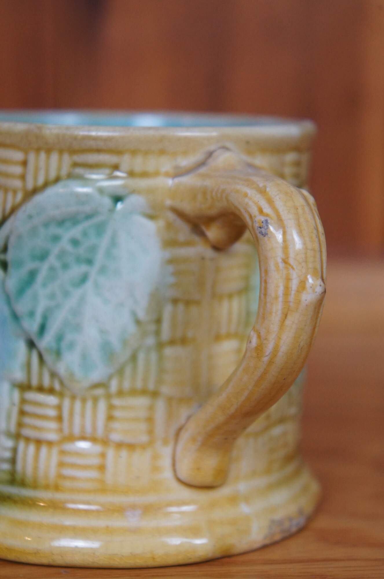 Antique Majolica mug or cup featuring a basketweave motif with Begonia / fern leaves and rustic branch / twig handle.