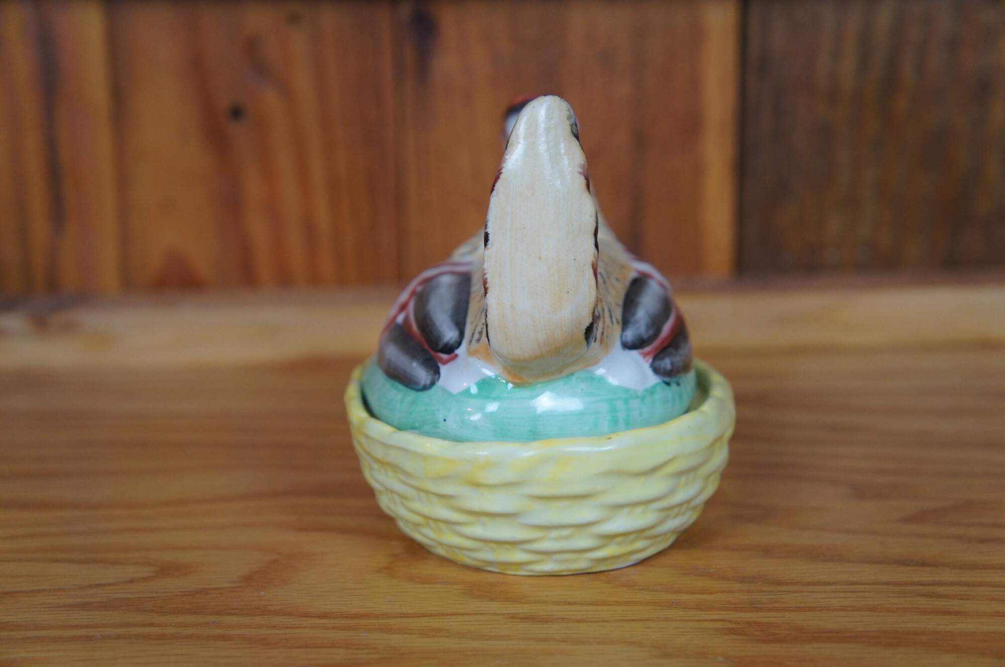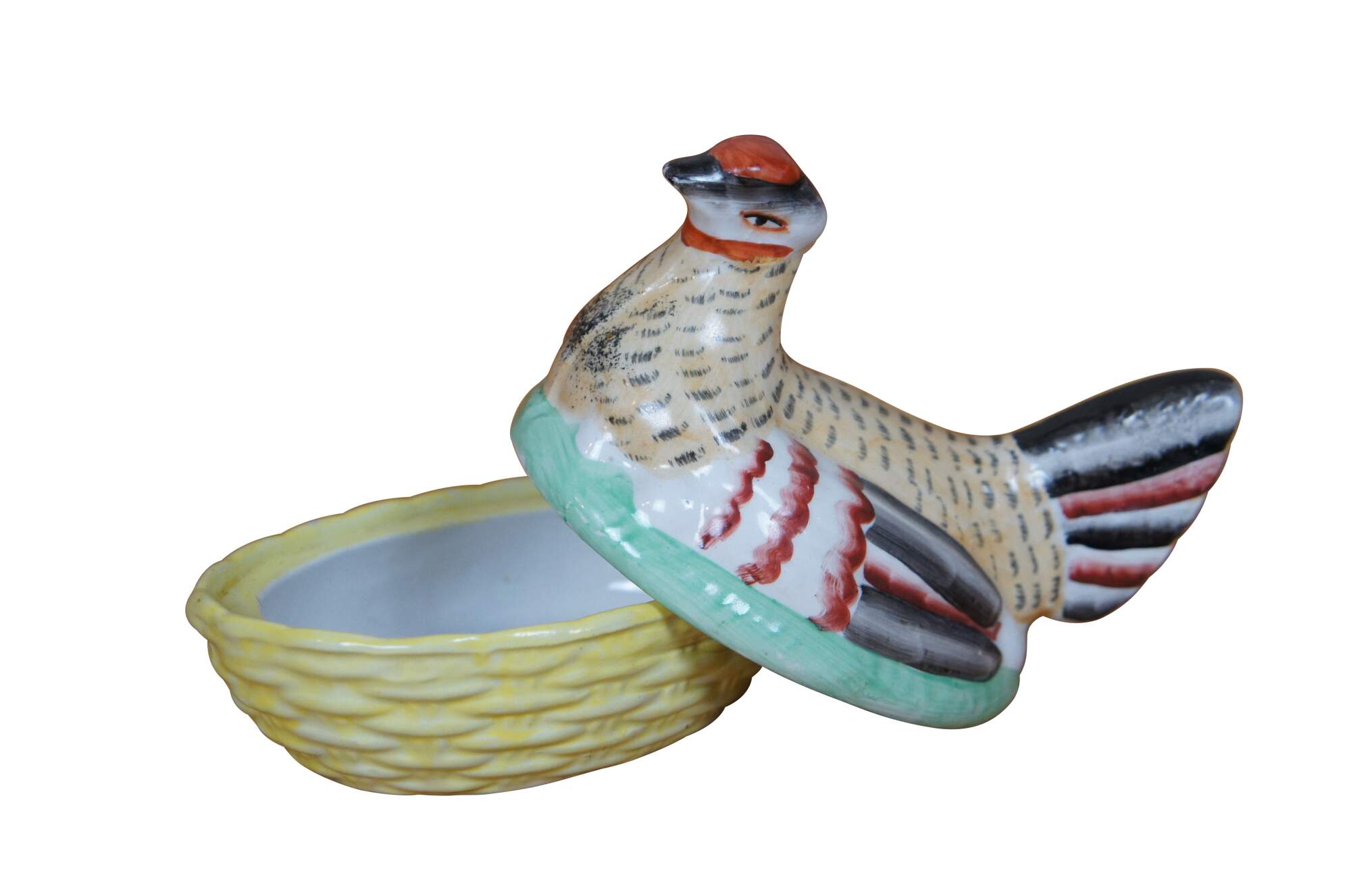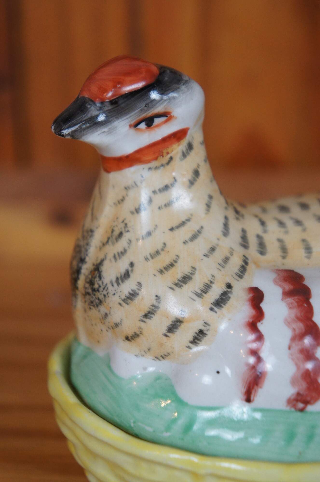 Old Staffordshire England lidded trinket dish or compote featuring a Hen / Pheasant / Grouse on a nest of eggs over a basket.