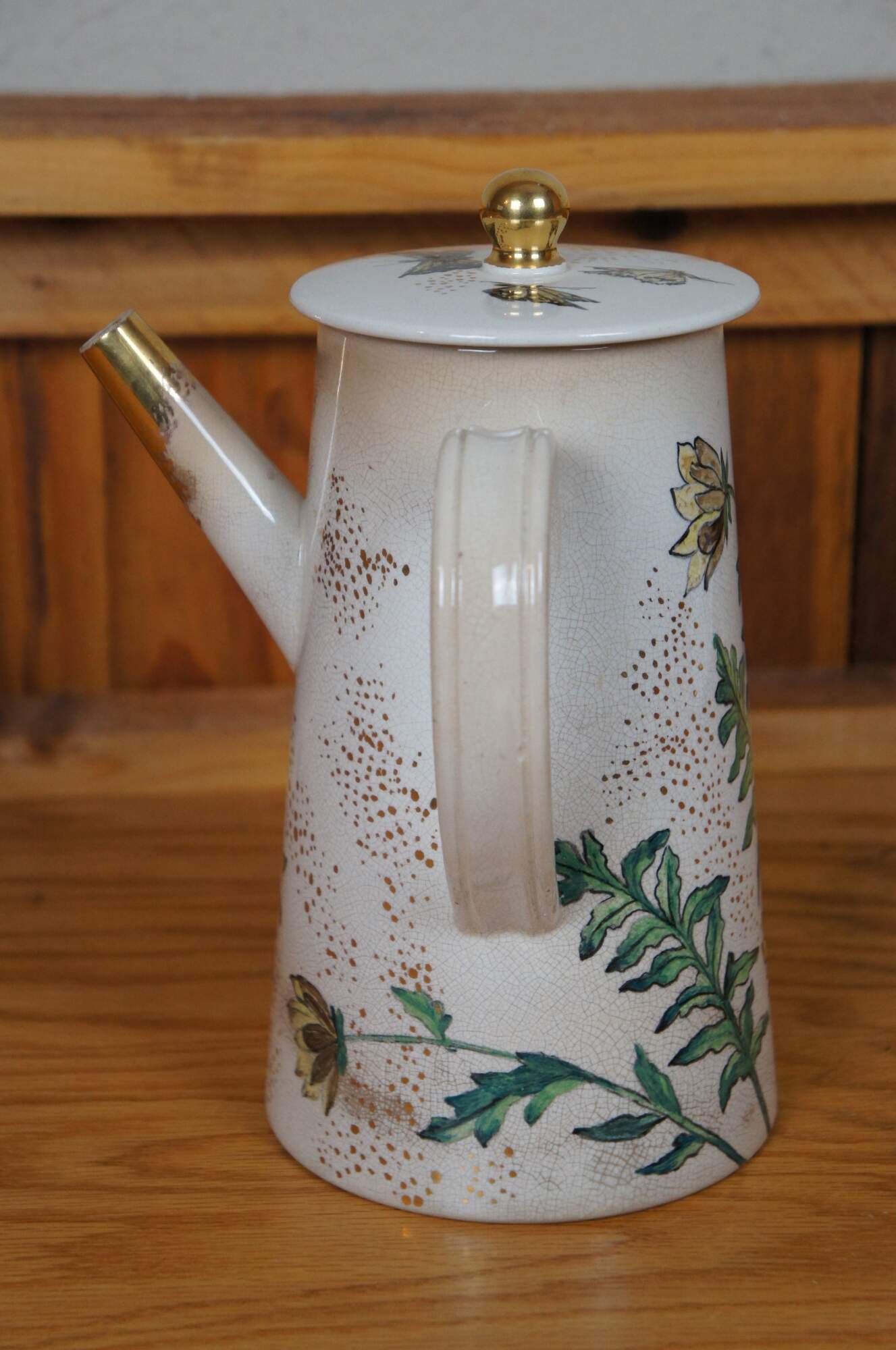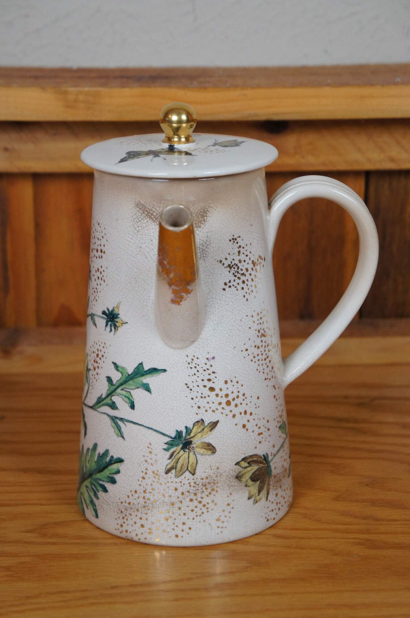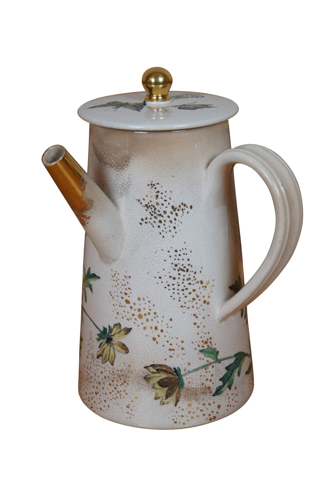 Rare antique early 1881 Rookwood chocolate pot / teapot / coffee pot or pitcher featuring a floral and butterfly motif with lid and handle. Accompanying paperwork attributes this pitcher to E.P. Cranch, however, the initials do appear to read LPG or LPC, with Cranch not noted to work for the company until 1882.