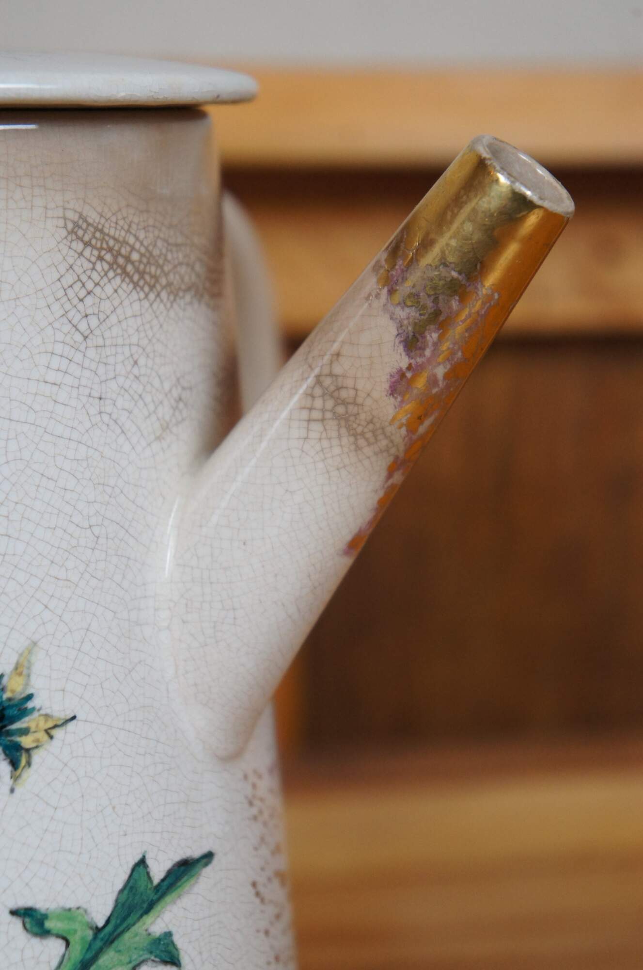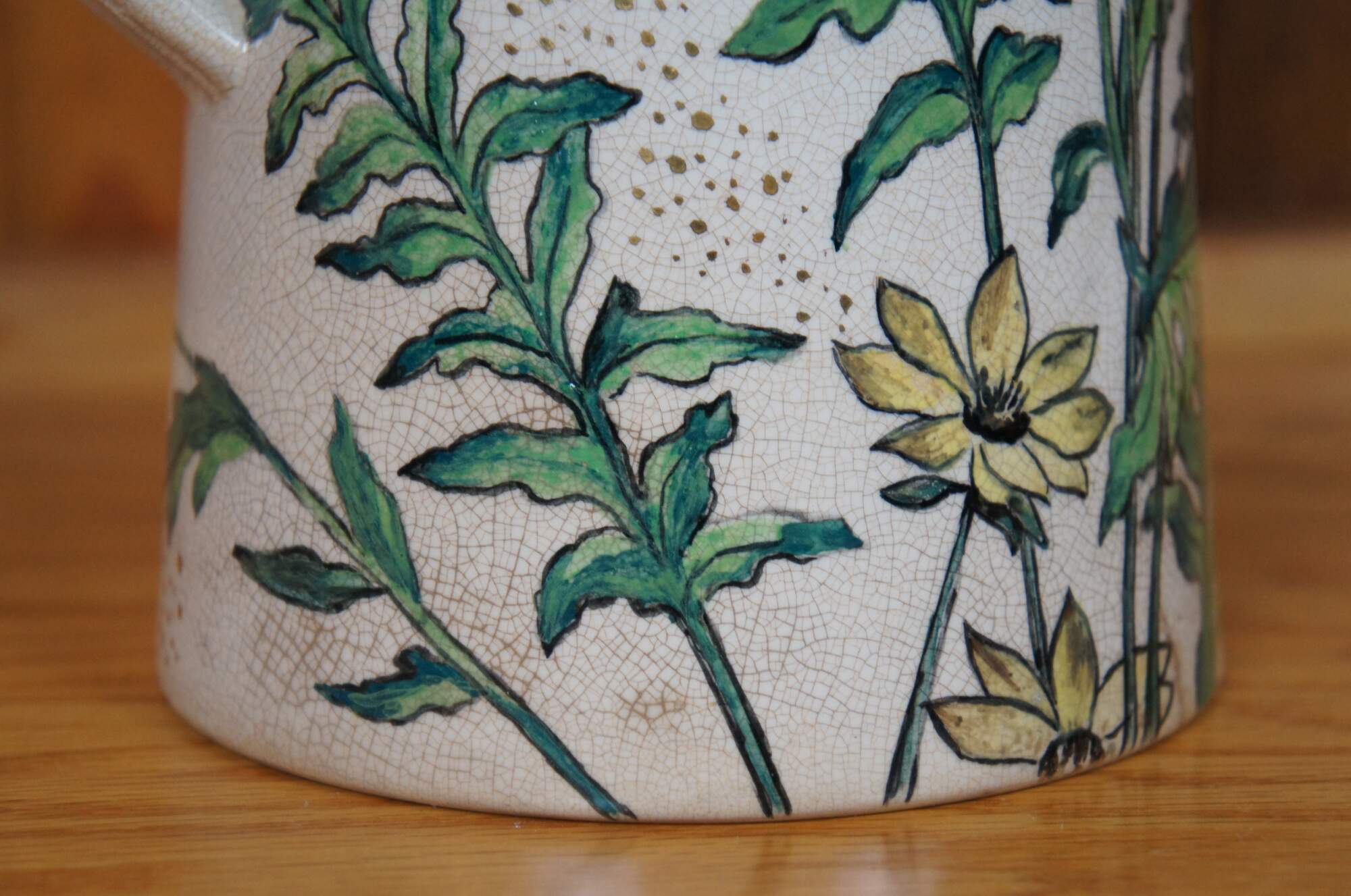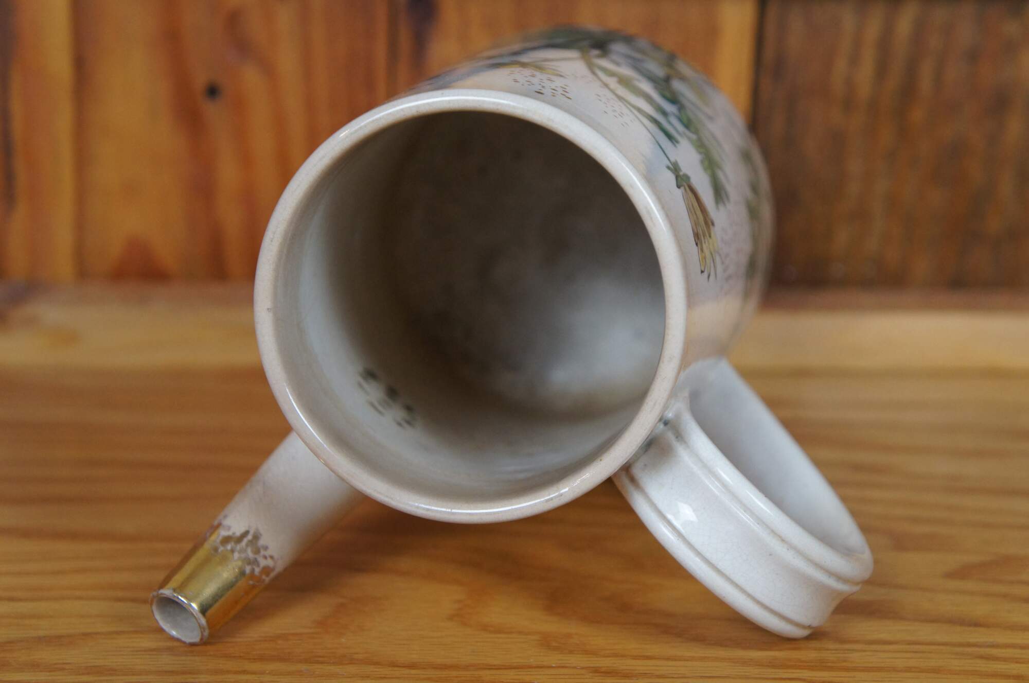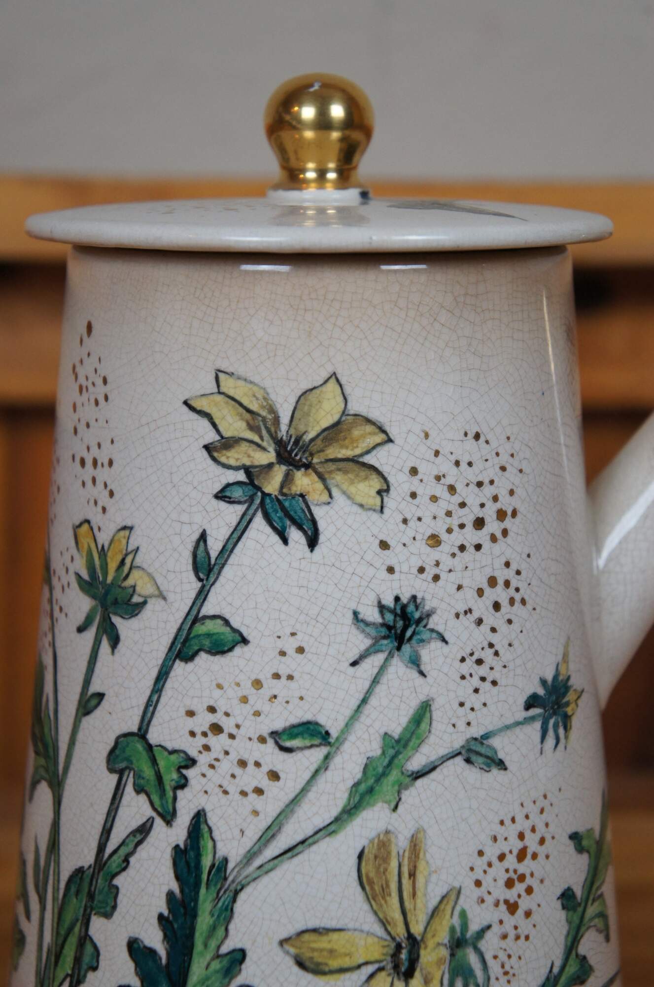 Rare antique early 1881 Rookwood chocolate pot / teapot / coffee pot or pitcher featuring a floral and butterfly motif with lid and handle. Accompanying paperwork attributes this pitcher to E.P. Cranch, however, the initials do appear to read LPG or LPC, with Cranch not noted to work for the company until 1882.