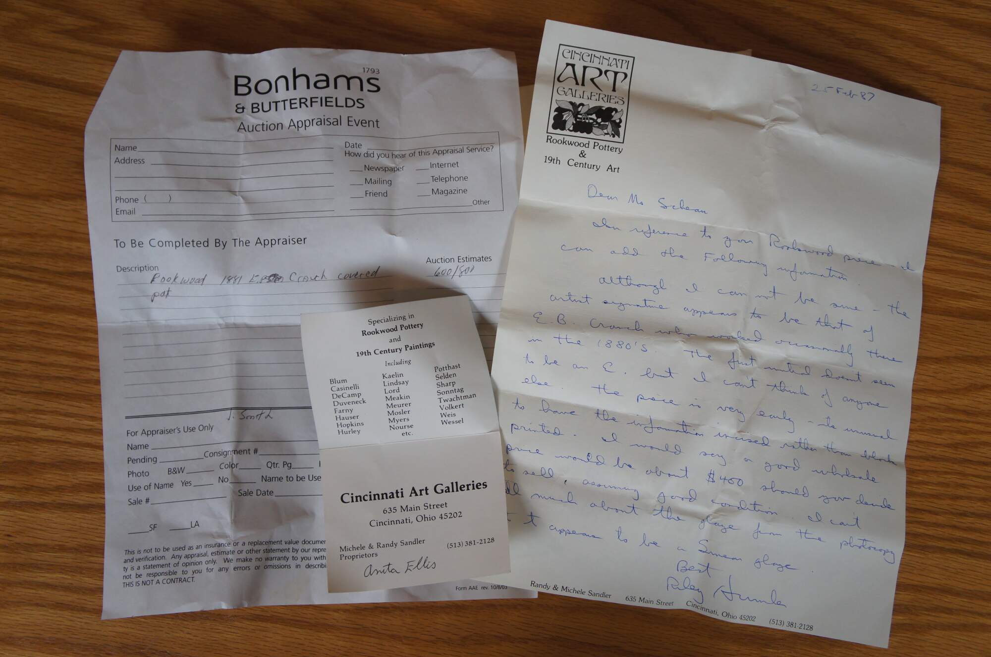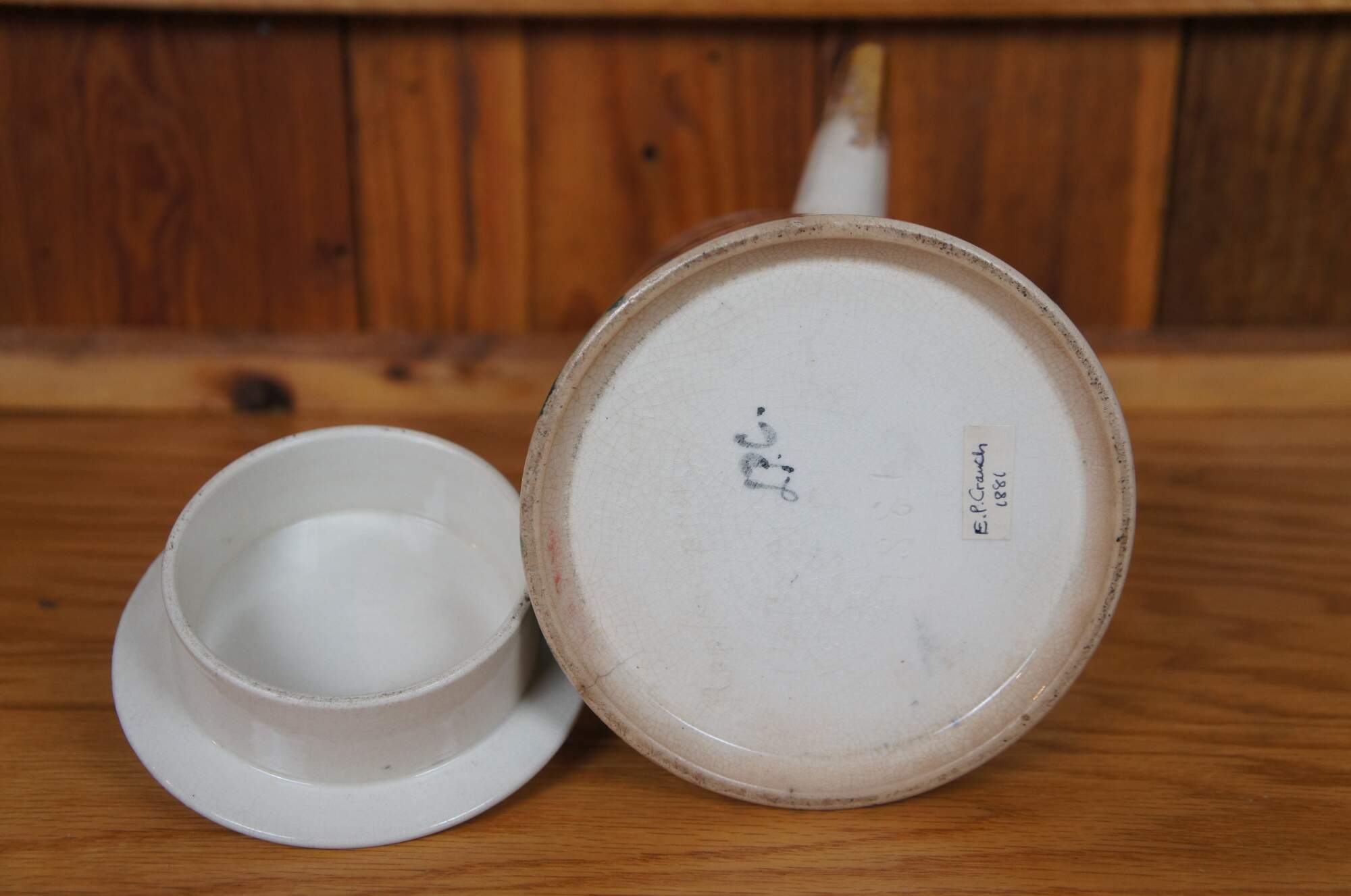 If it was Edward Pope Cranch, he was born in Washington DC on May 29, 1809, and moved to Cincinnati around 1831. He was an attorney by trade, but also an accomplished illustrator and lecturer. He occasionally decorated pottery for Rookwood between 1882 until his death in 1892. His artwork tends towards a single-colored outline, including farm scenes, owls, and vultures. His work is normally found on utility-ware such as dishes, mugs, tankards, and pitchers. His work is considered to have average collector value.