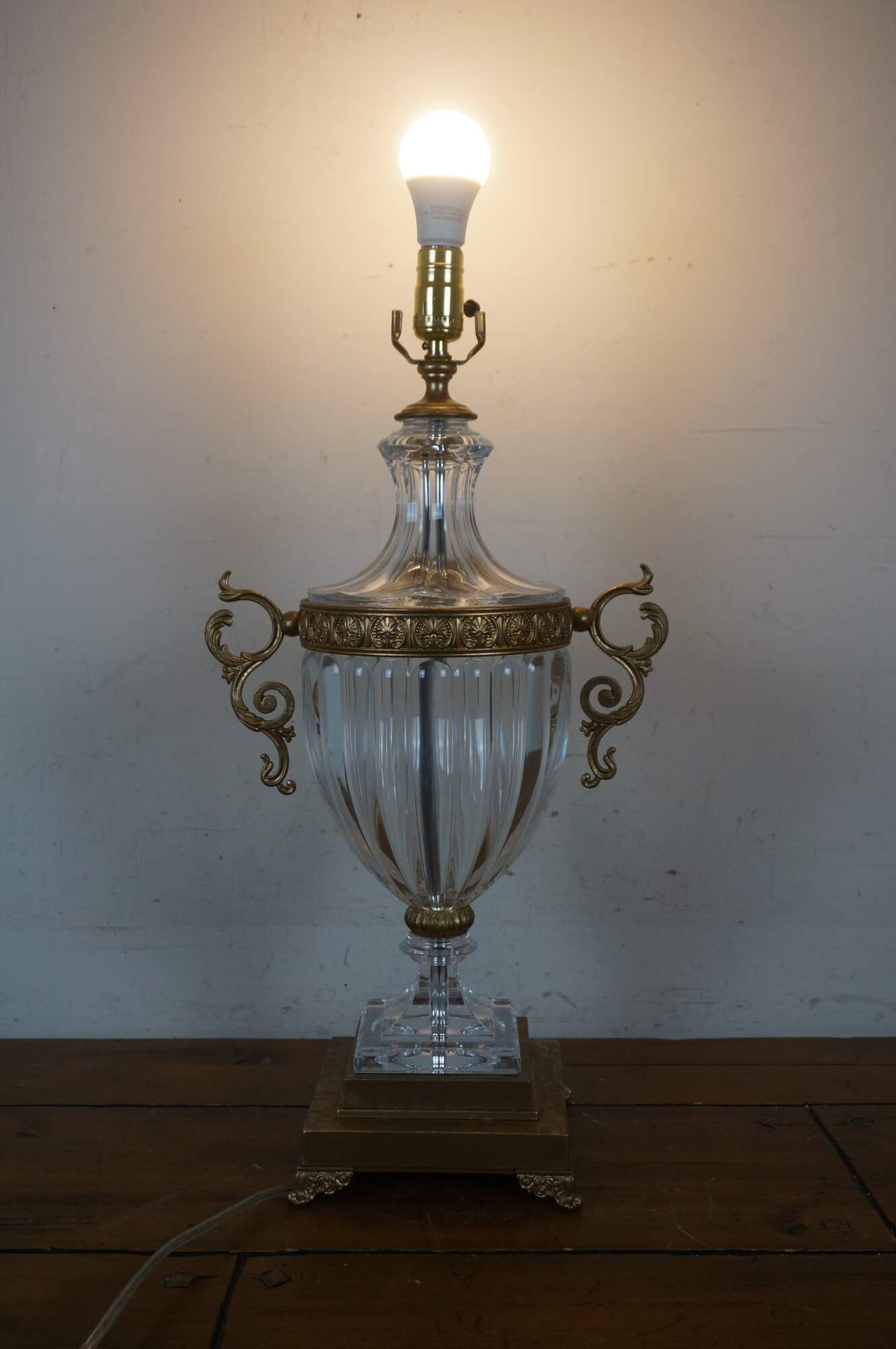 A large and impressive late 20th century fluted crystal trophy urn shaped table lamp featuring a square brass base with foliate feet, a scallop shell patterned band and scrolling foliate handles.
