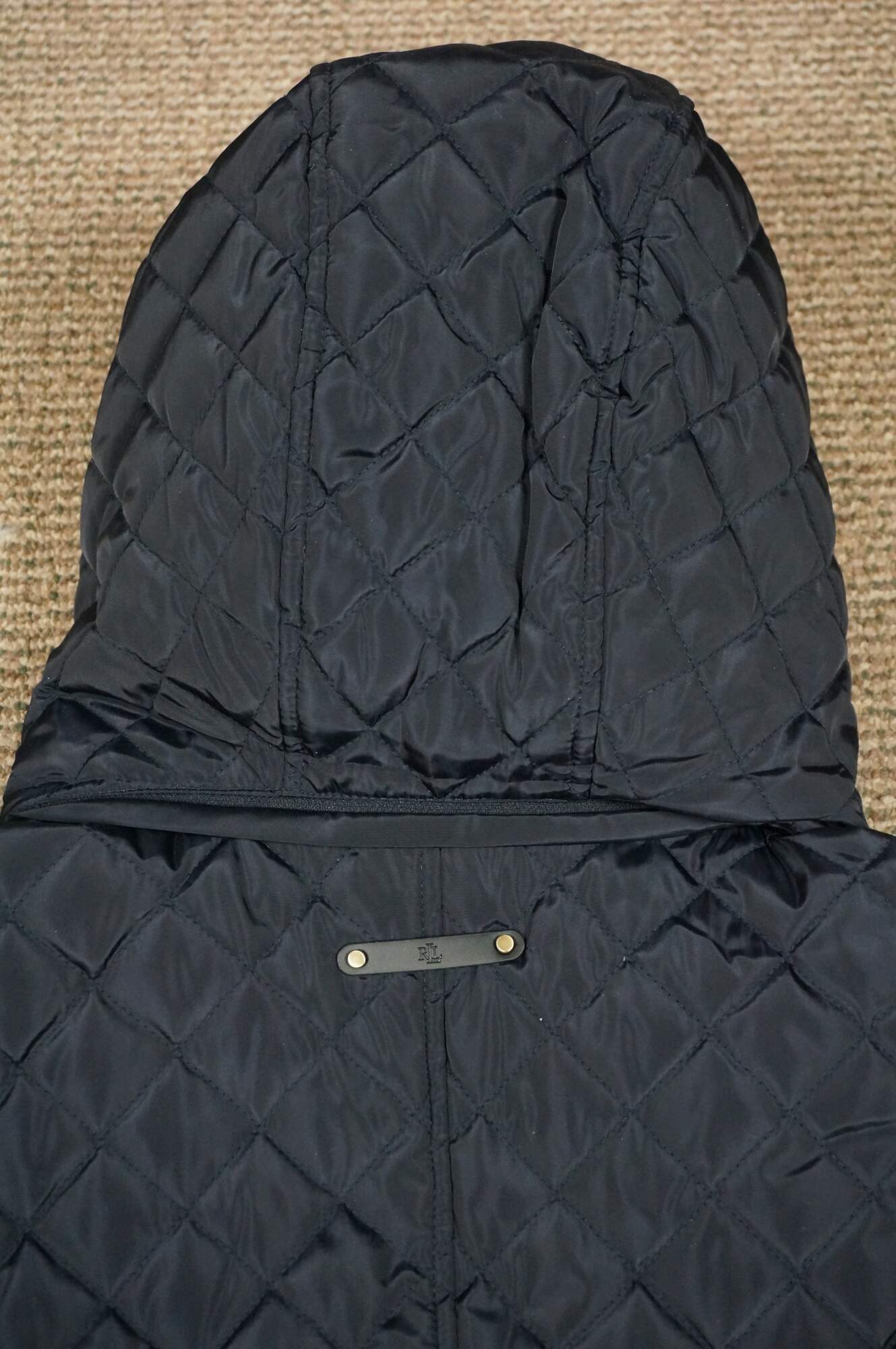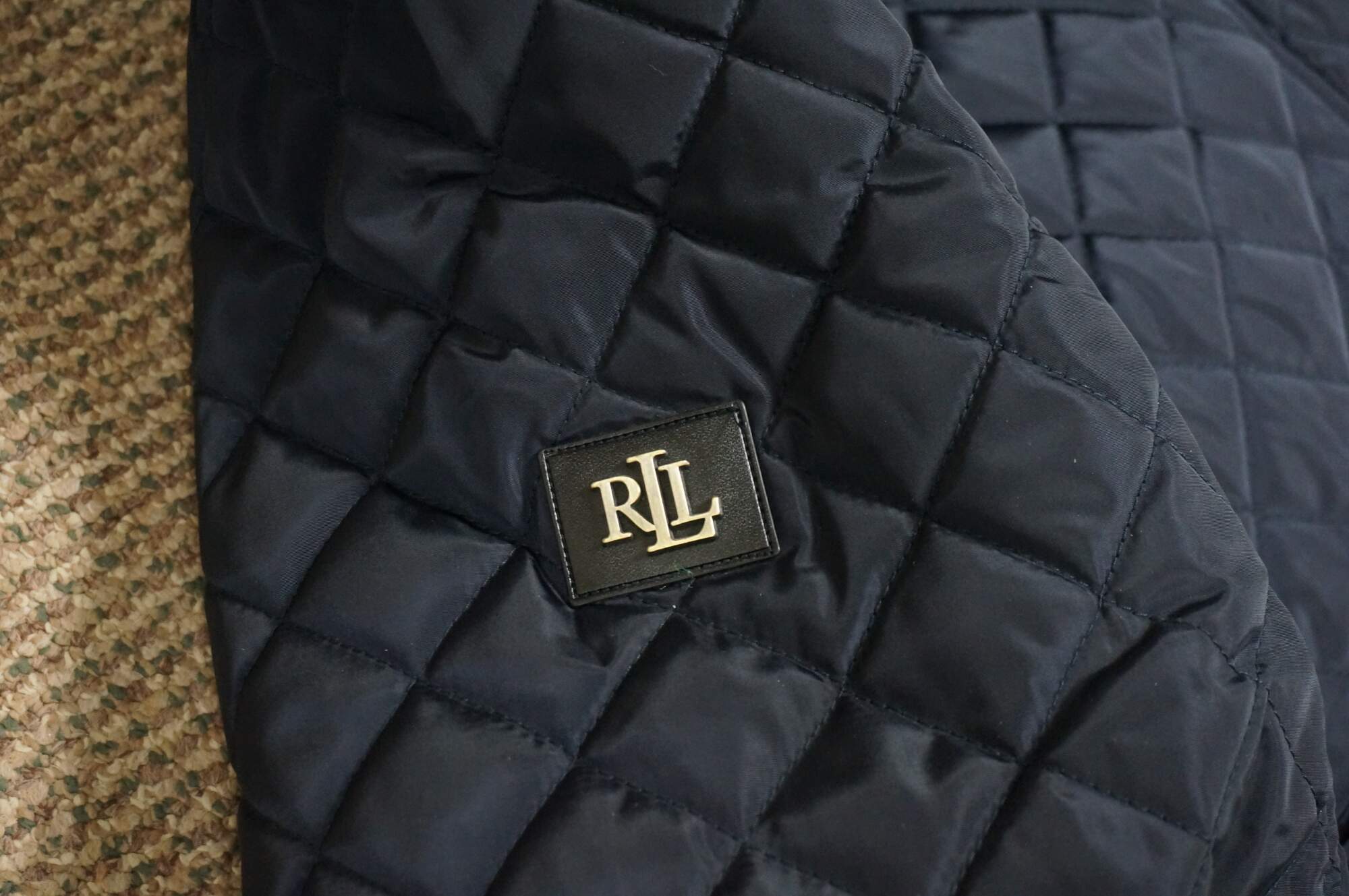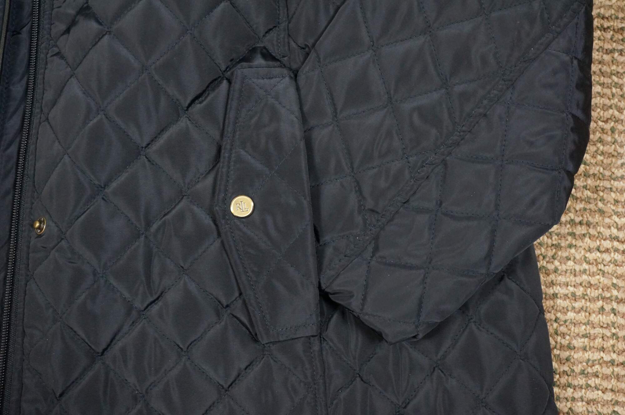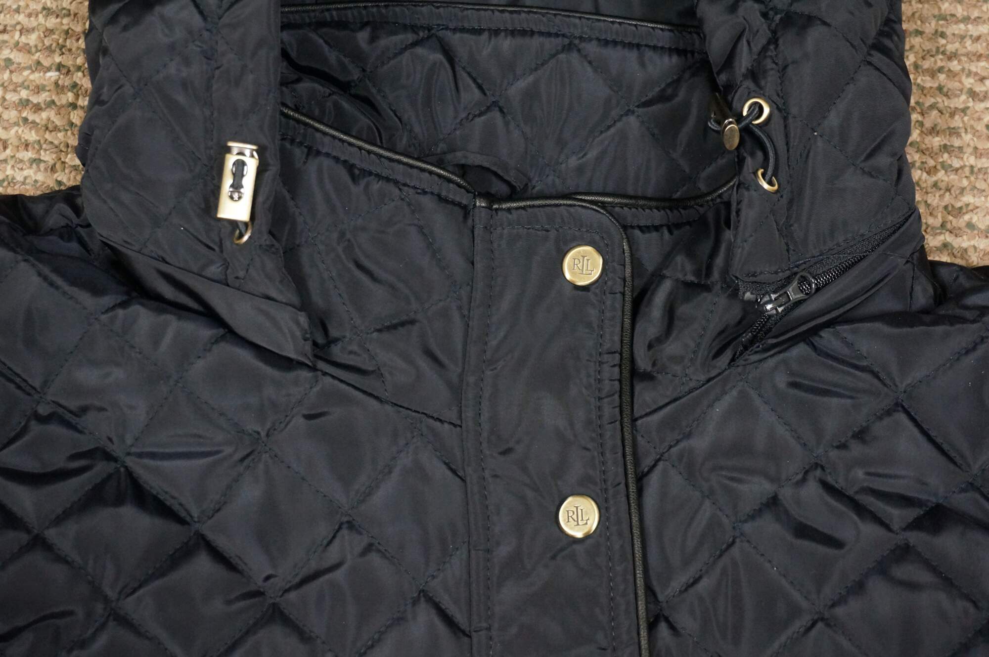 Lauren Ralph Lauren women's diamond quilted hooded winter jacket. Two side pockets with decorative snap flaps. Zipper and snap button double closure. Black on black equestrian pattern lining.