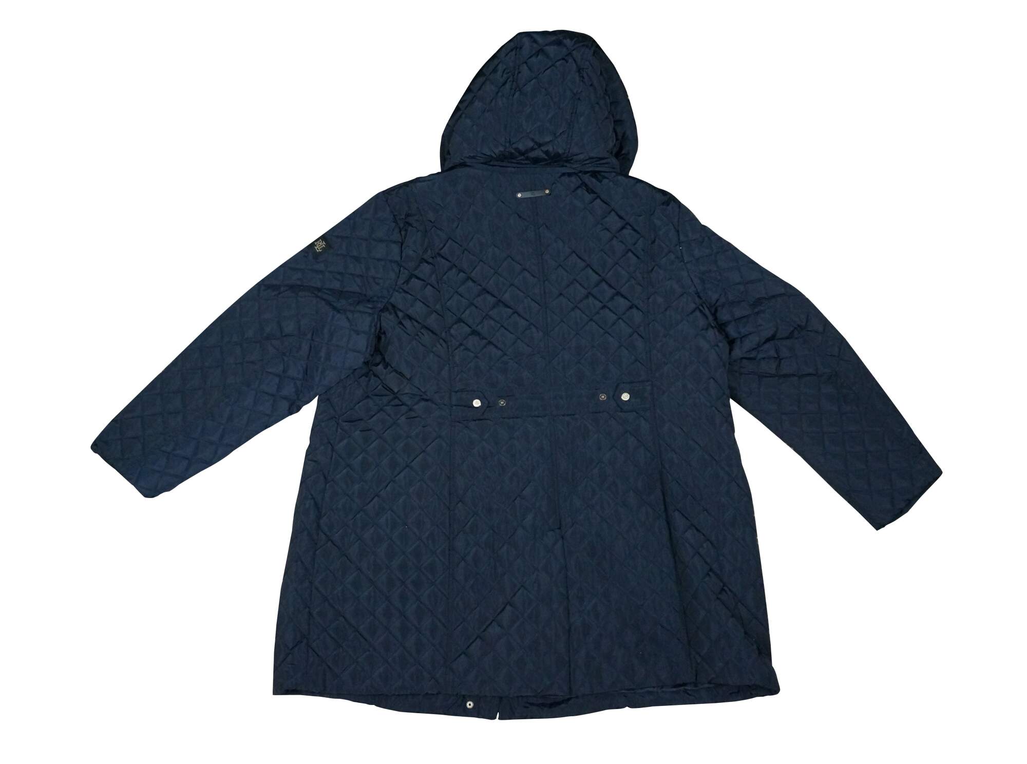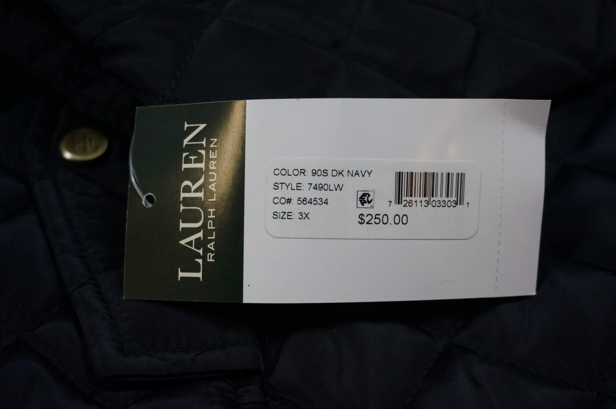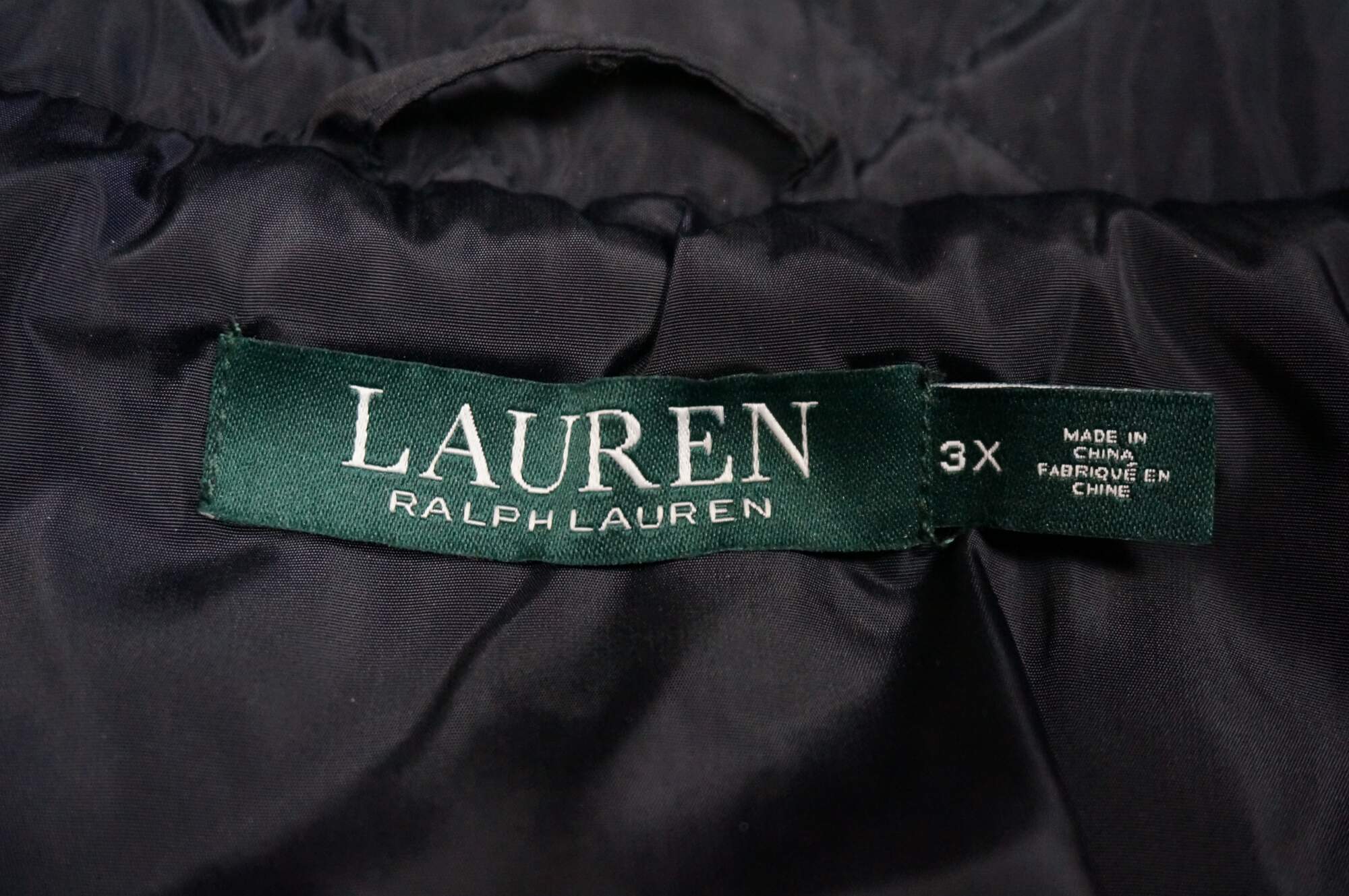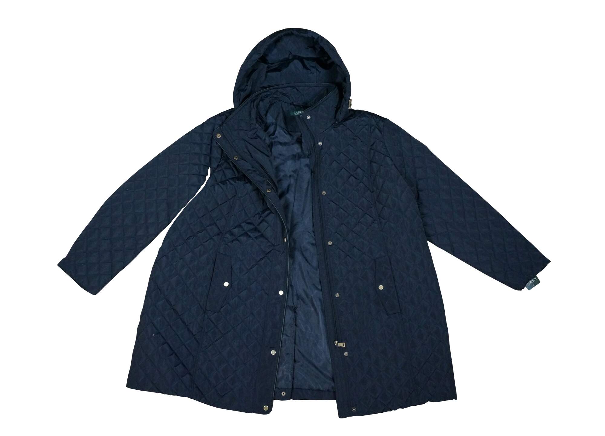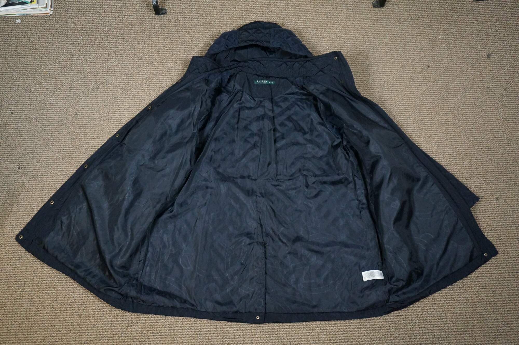 Lauren Ralph Lauren women's diamond quilted hooded winter jacket. Two side pockets with decorative snap flaps. Zipper and snap button double closure. Black on black equestrian pattern lining.