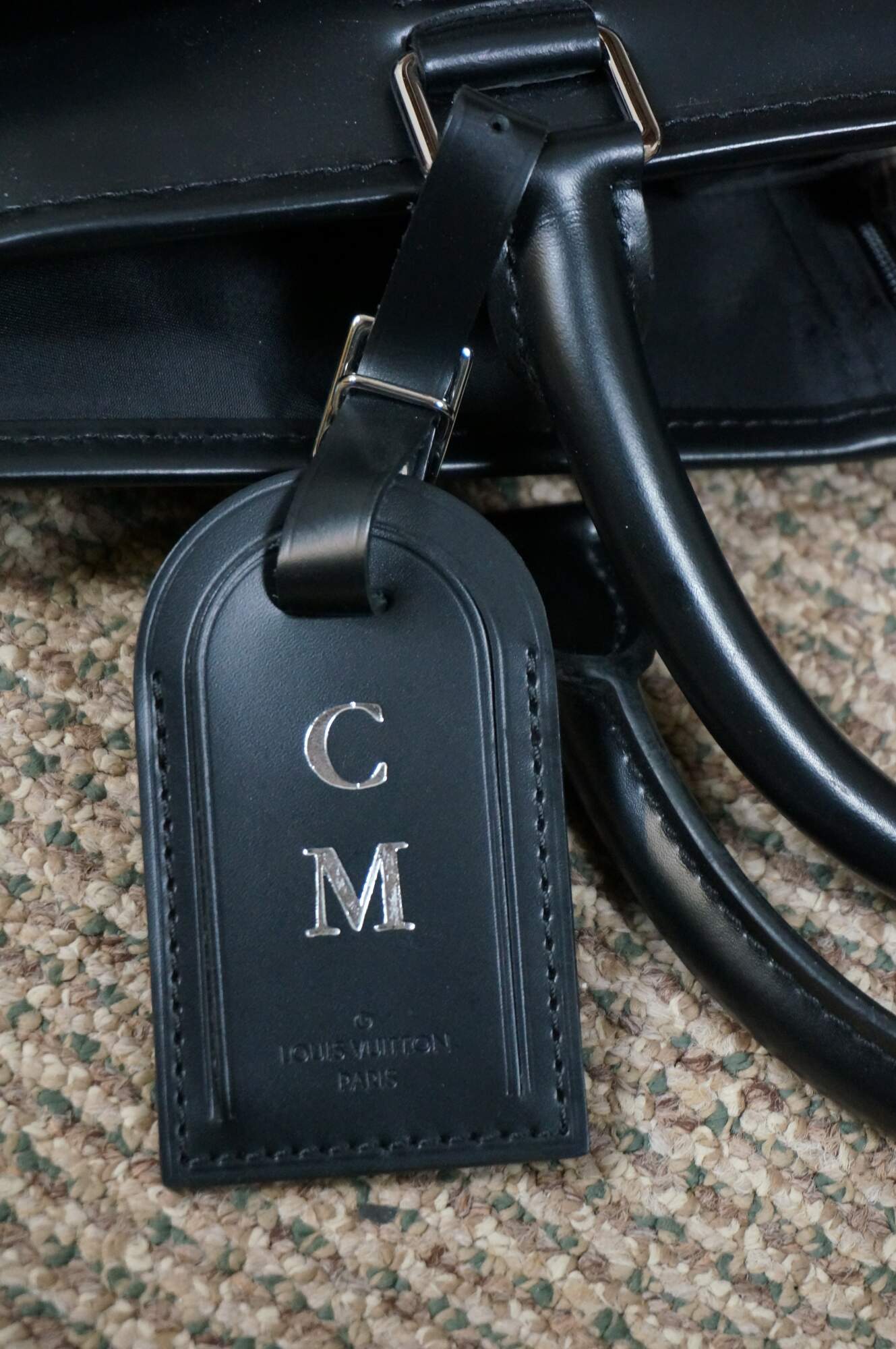 Louis Vuitton Paris hanging garment bag / suit cover. Damier Graphite canvas with leather trim, handles, and removable luggage tag (Monogrammed CM); silver hardware. Includes adjustable shoulder strap, two hangers, and dust bag. Nylon zippered interior. Date Code: BA1195. Made in France circa 2015.