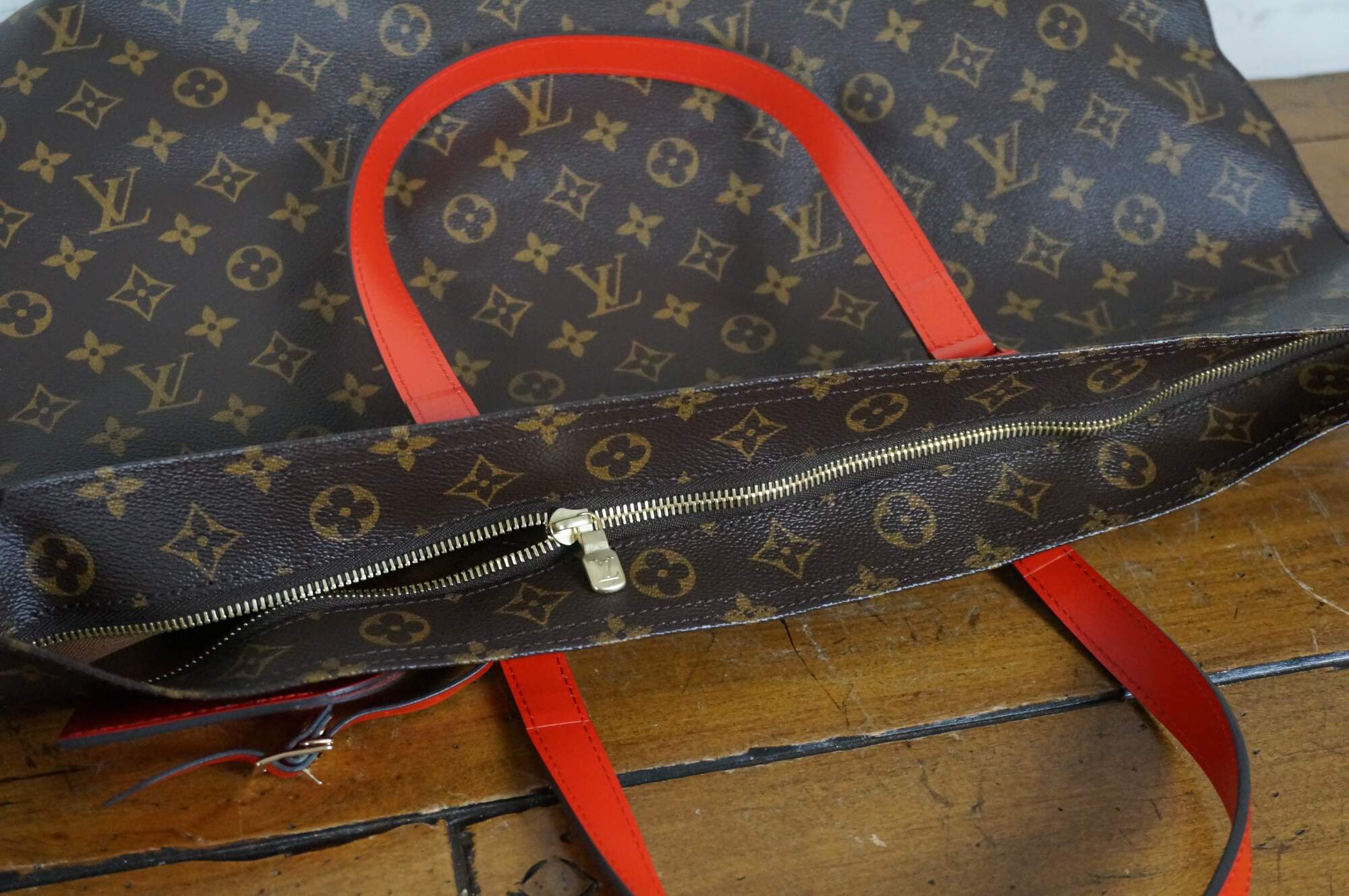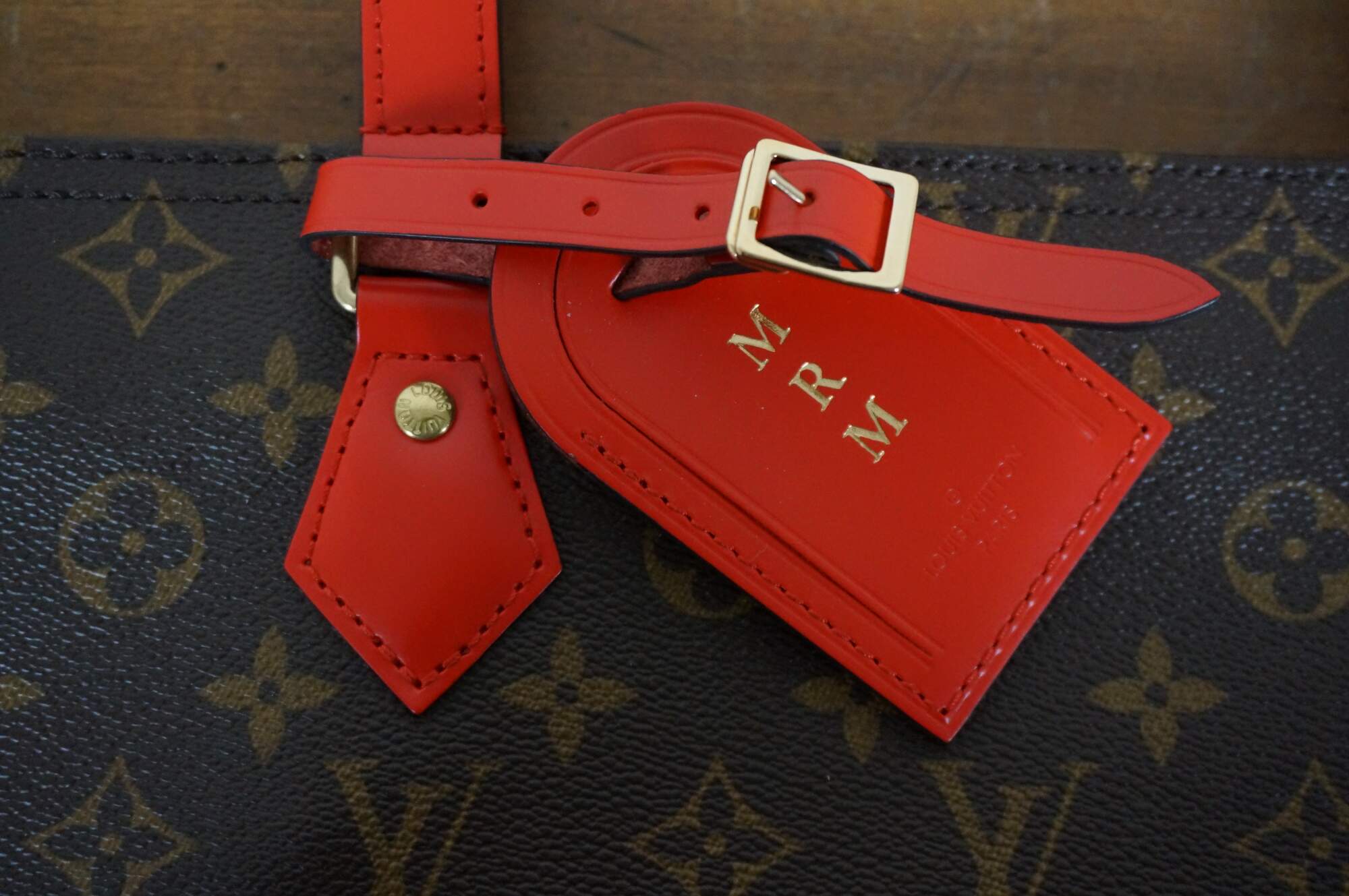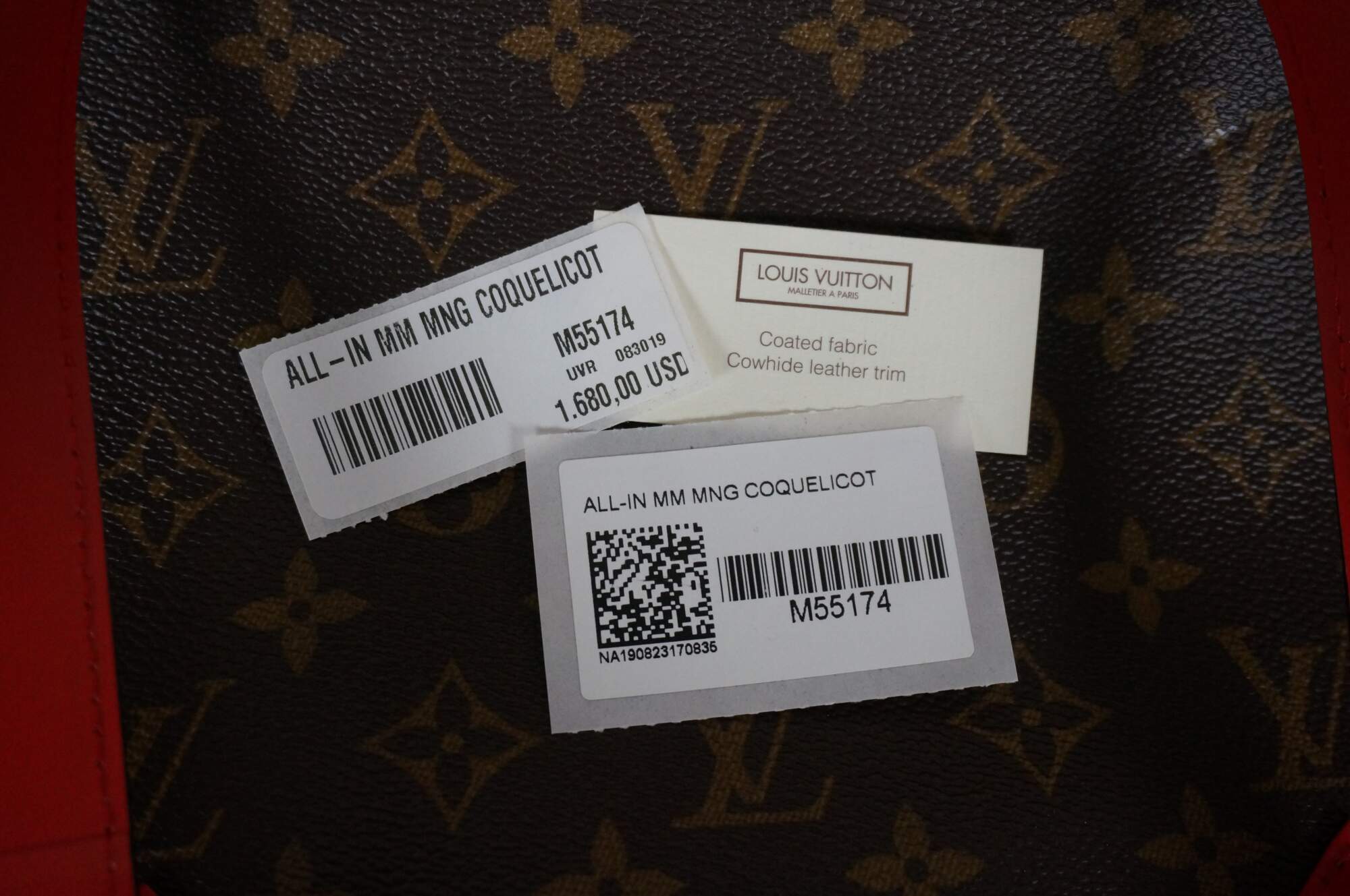 Louis Vuitton Paris All-In MM MNG Coquelicot tote bag. Monogram canvas with red leather trim, double handles, and removable luggage tag (Monogrammed MRM); gold hardware. Brown fabric lining; one interior zippered pocket. Zipper closure. M55174. Date Code: GI3139. Made in Spain circa 2019. Includes dust bag. Folds flat.