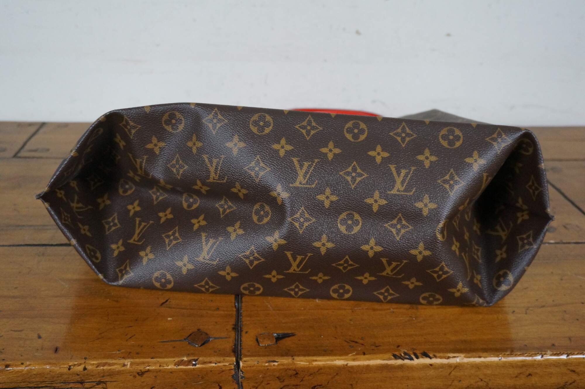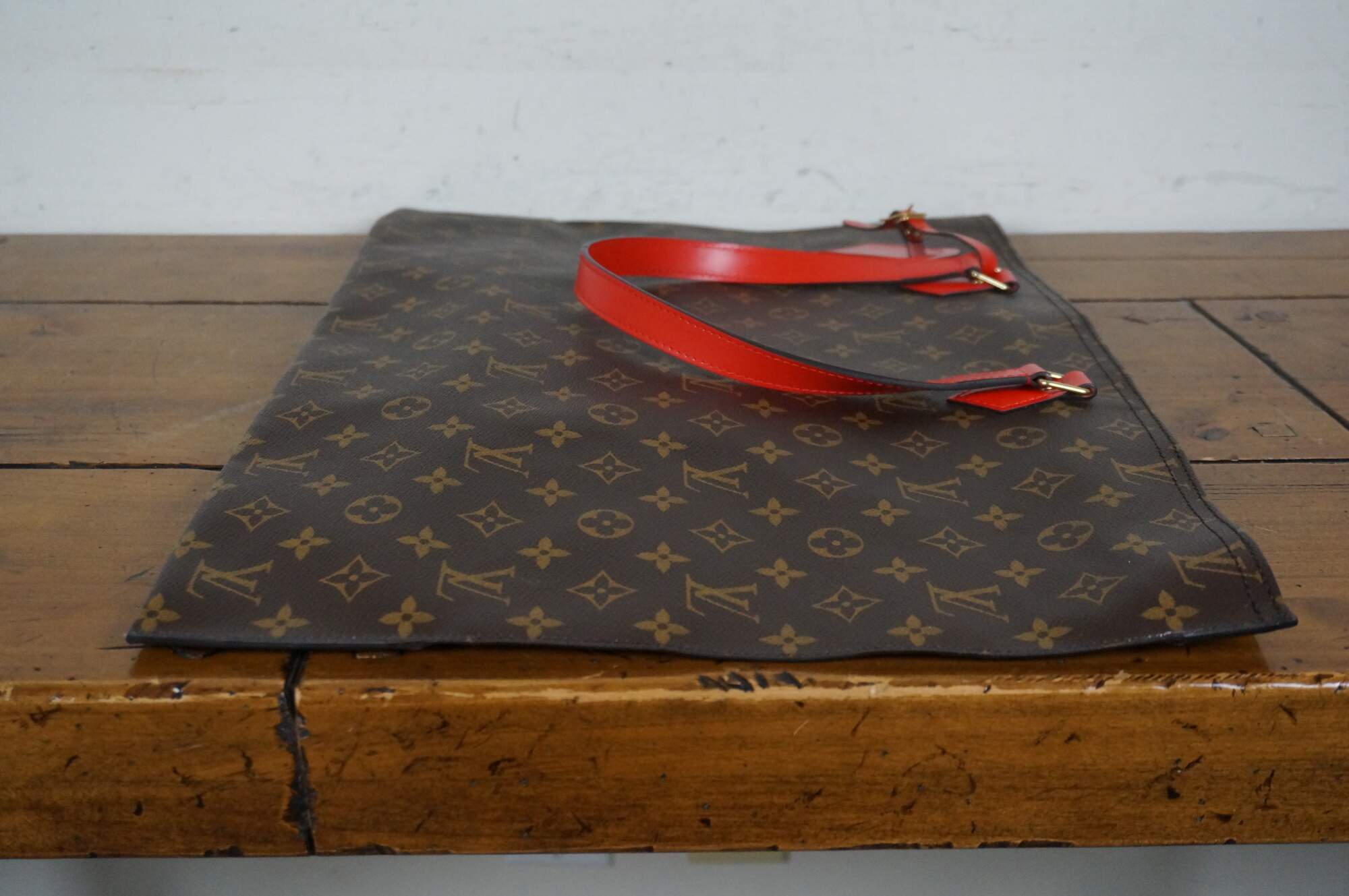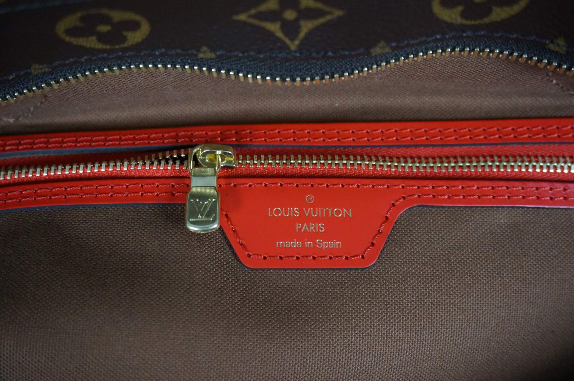 Louis Vuitton Paris All-In MM MNG Coquelicot tote bag. Monogram canvas with red leather trim, double handles, and removable luggage tag (Monogrammed MRM); gold hardware. Brown fabric lining; one interior zippered pocket. Zipper closure. M55174. Date Code: GI3139. Made in Spain circa 2019. Includes dust bag. Folds flat.