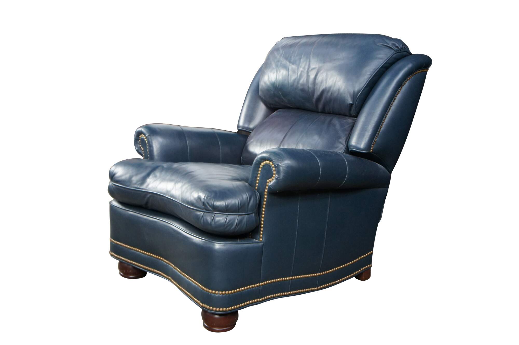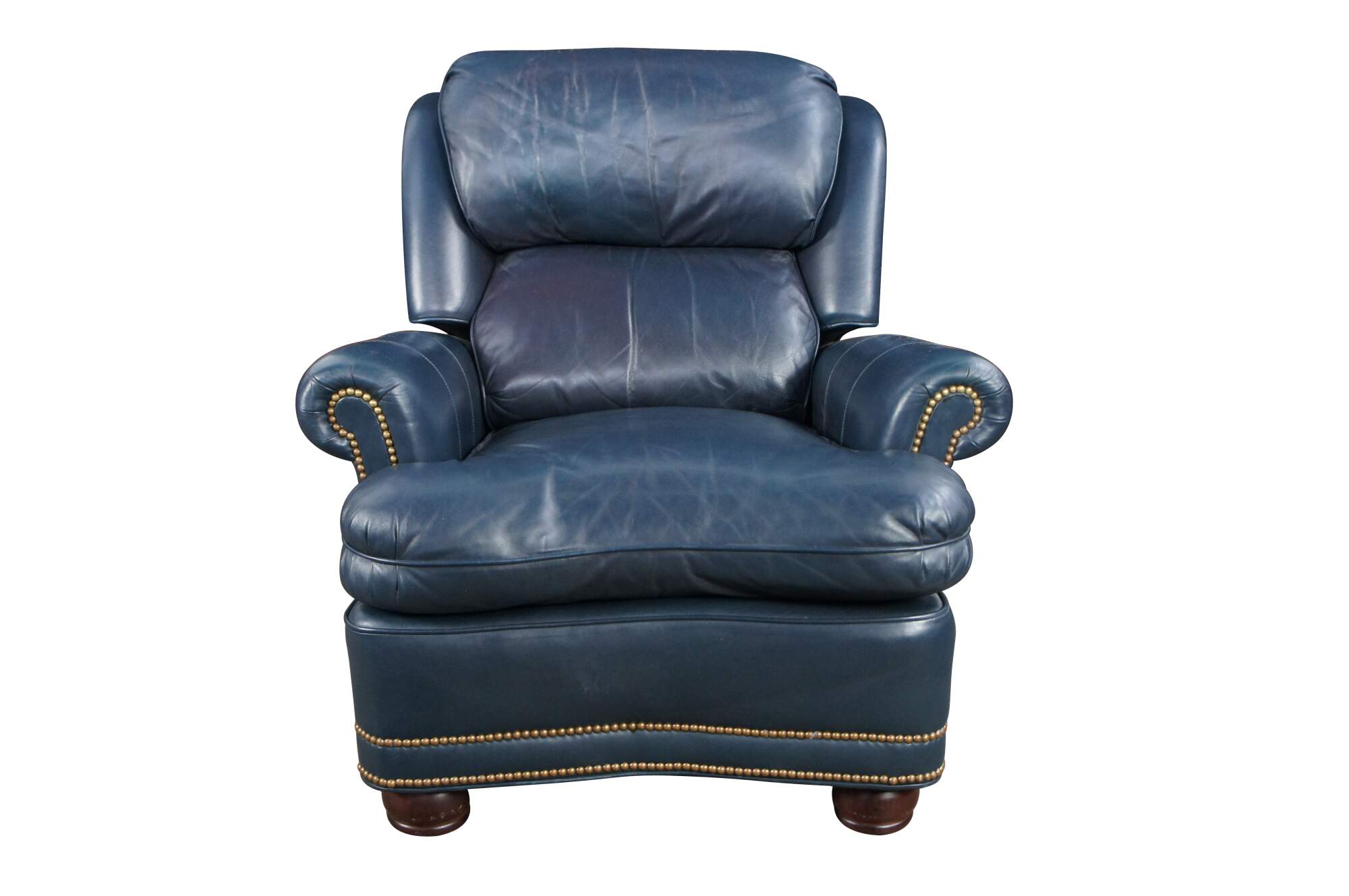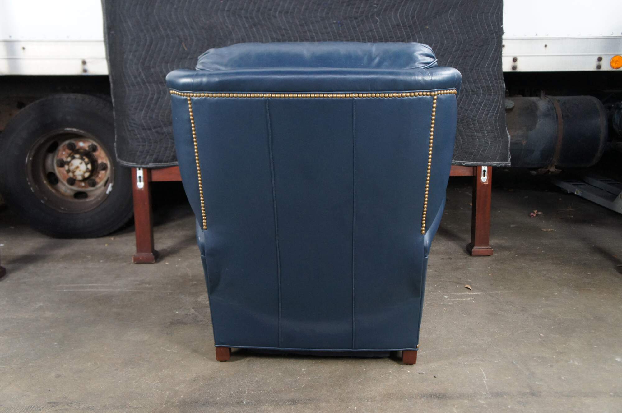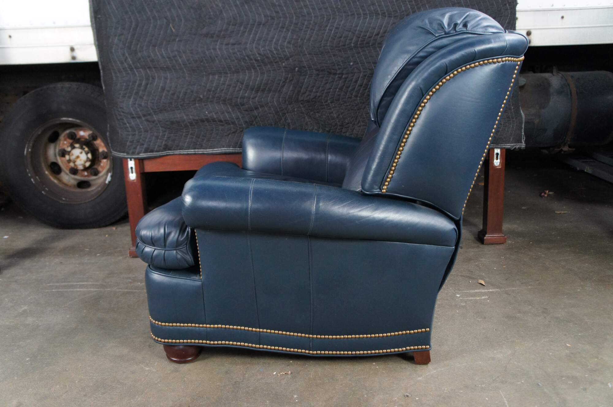 Early 21st Century Hancock & Moore Library Club Chair with Recliner. The Austin High Back features genuine Caress Dark blue leather upholstery with rolled arms, brass nailhead trim, and distressed walnut-finished bun feet. The chair reclines via a black switch on the right side beneath the arm. #2038NB