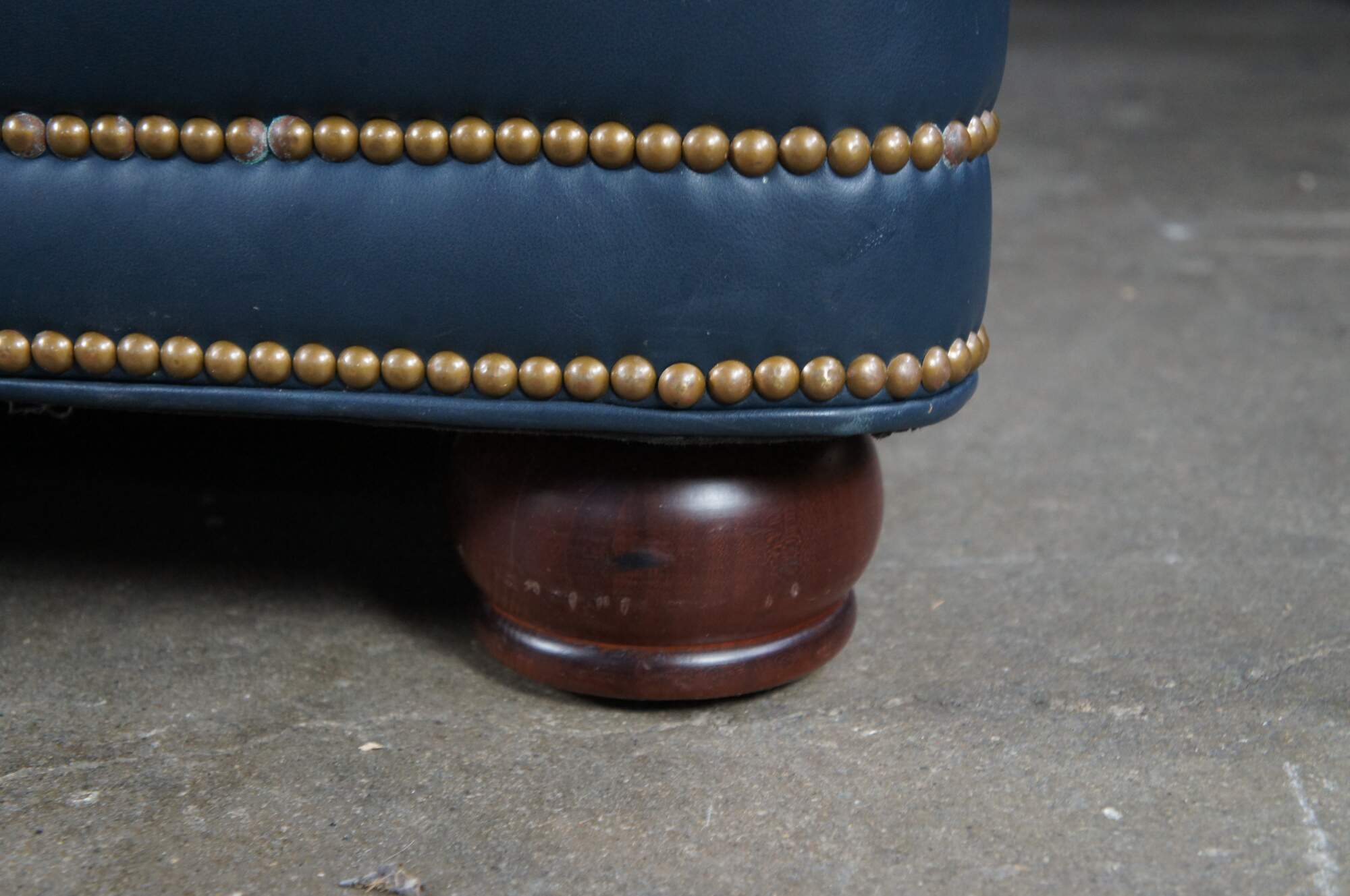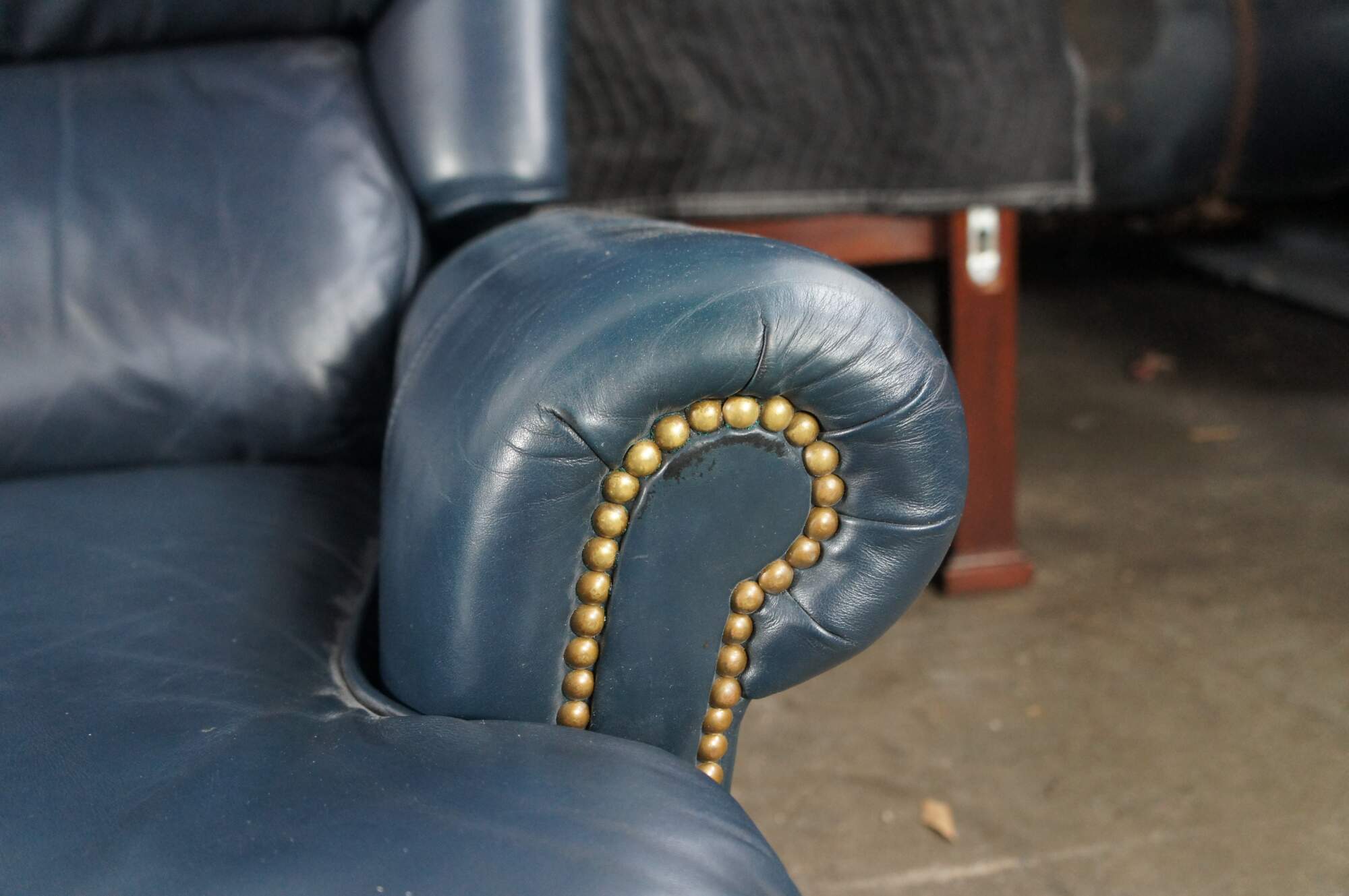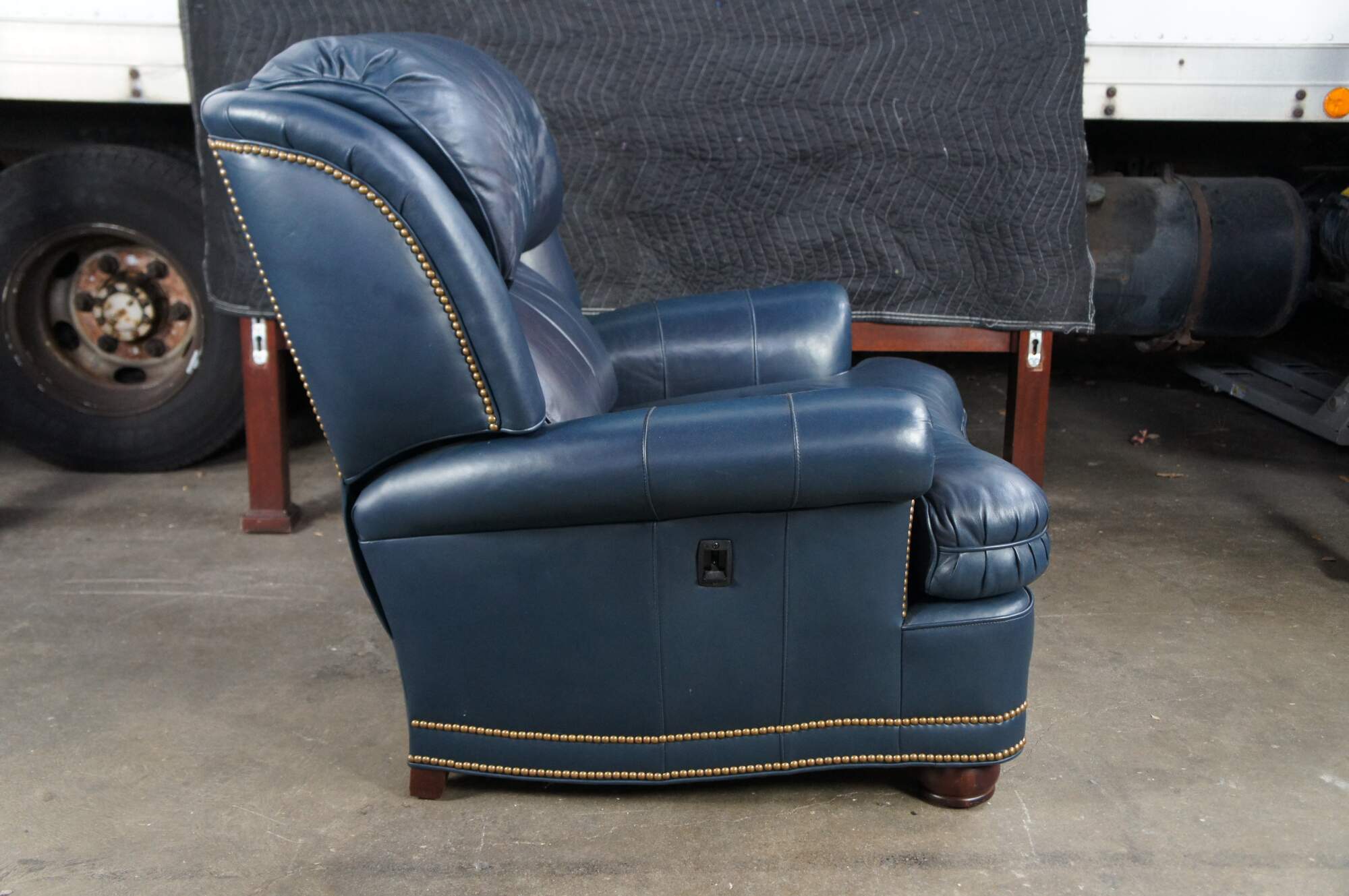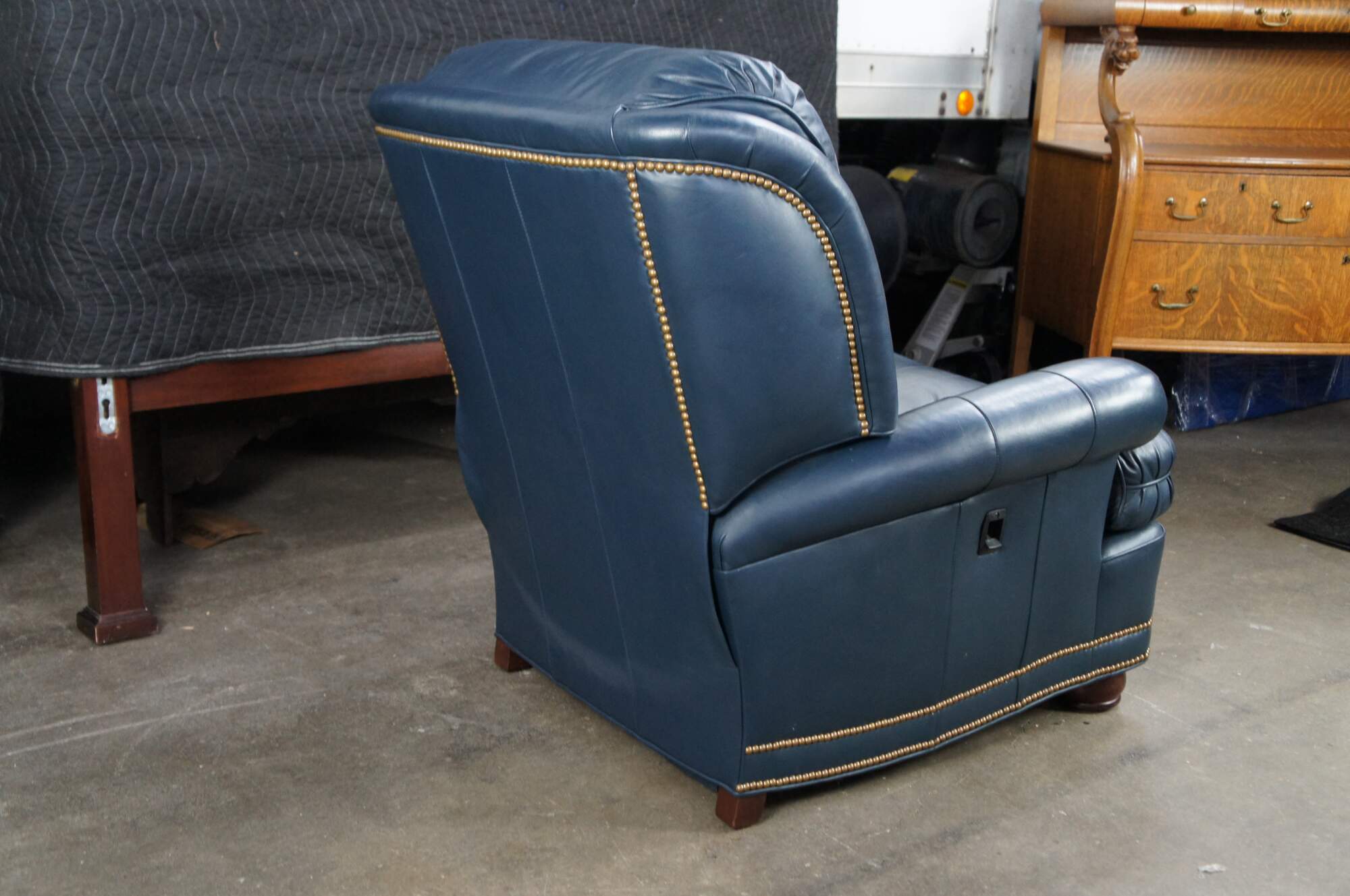 Early 21st Century Hancock & Moore Library Club Chair with Recliner. The Austin High Back features genuine Caress Dark blue leather upholstery with rolled arms, brass nailhead trim, and distressed walnut-finished bun feet. The chair reclines via a black switch on the right side beneath the arm. #2038NB