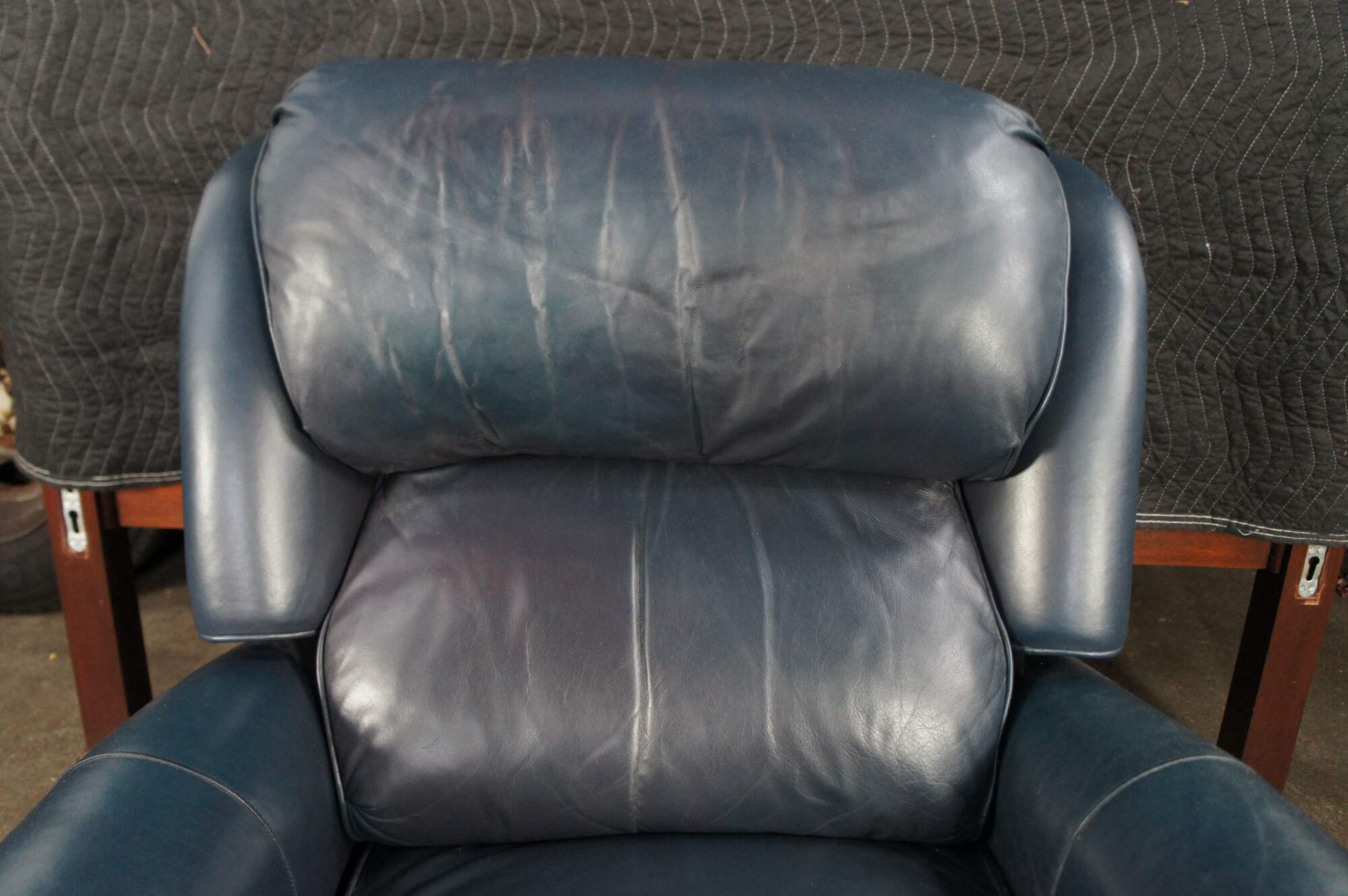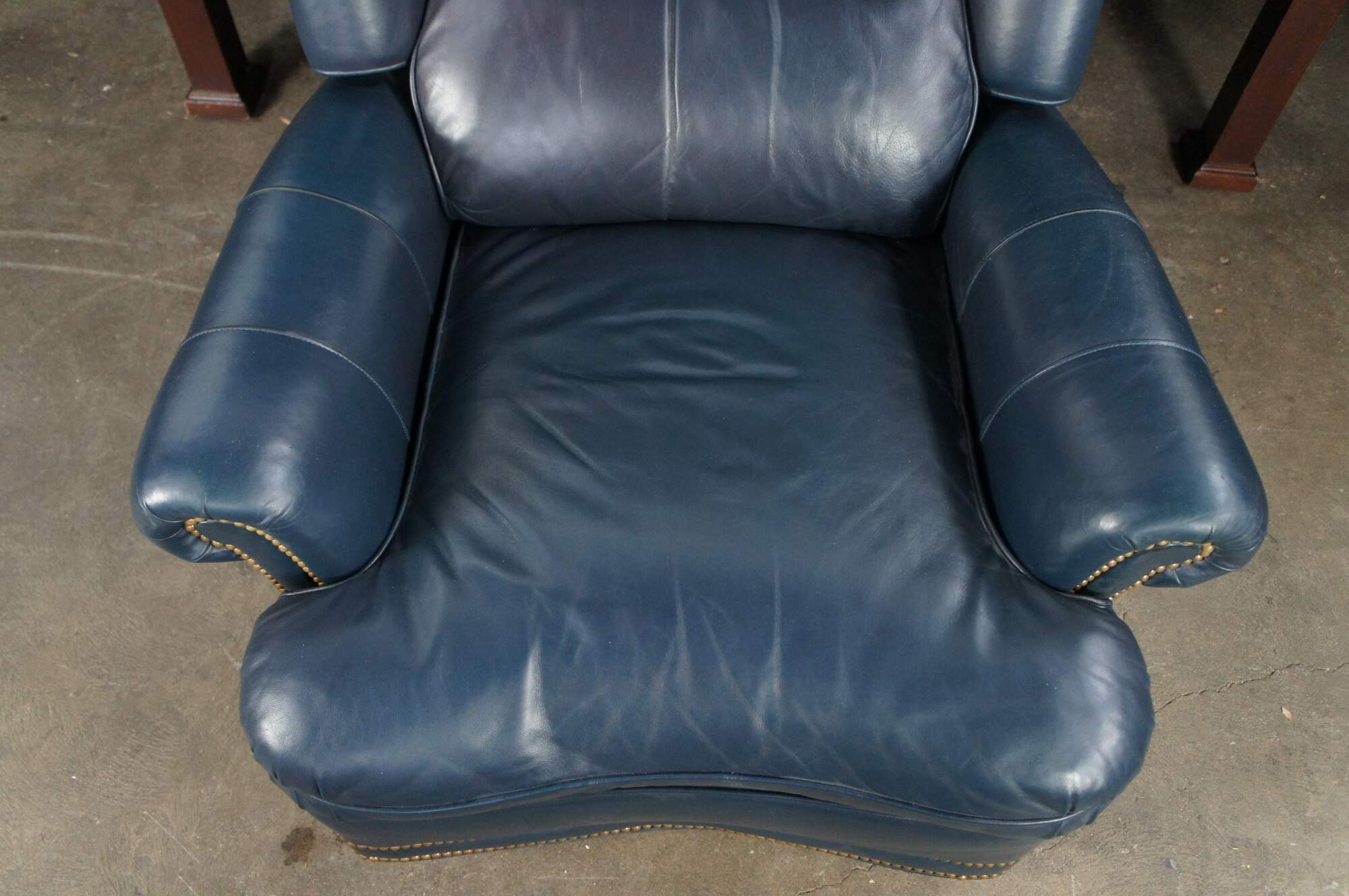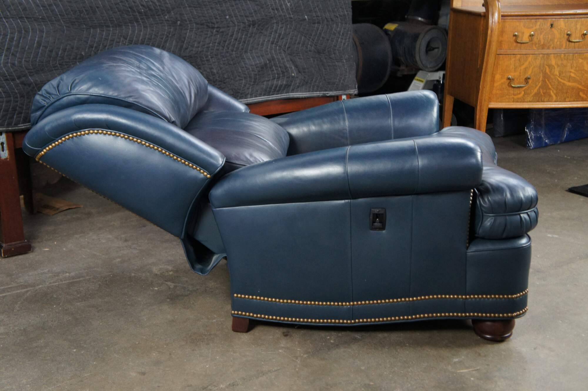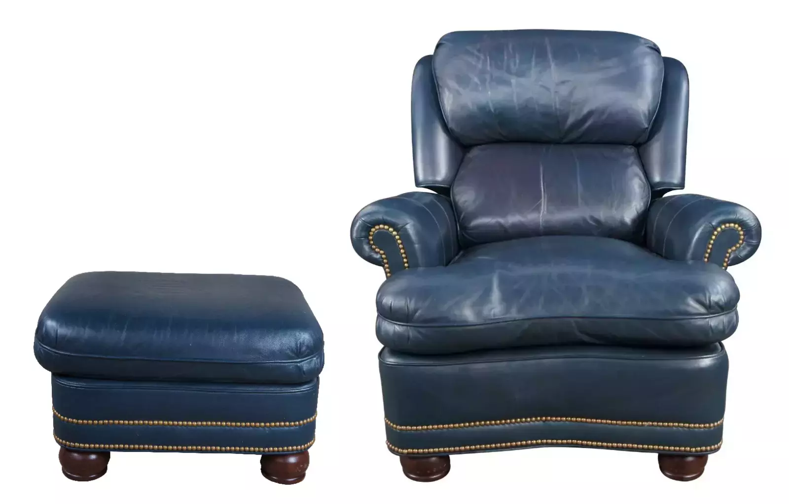 Early 21st Century Hancock & Moore Library Club Chair with Recliner. The Austin High Back features genuine Caress Dark blue leather upholstery with rolled arms, brass nailhead trim, and distressed walnut-finished bun feet. The chair reclines via a black switch on the right side beneath the arm. #2038NB
