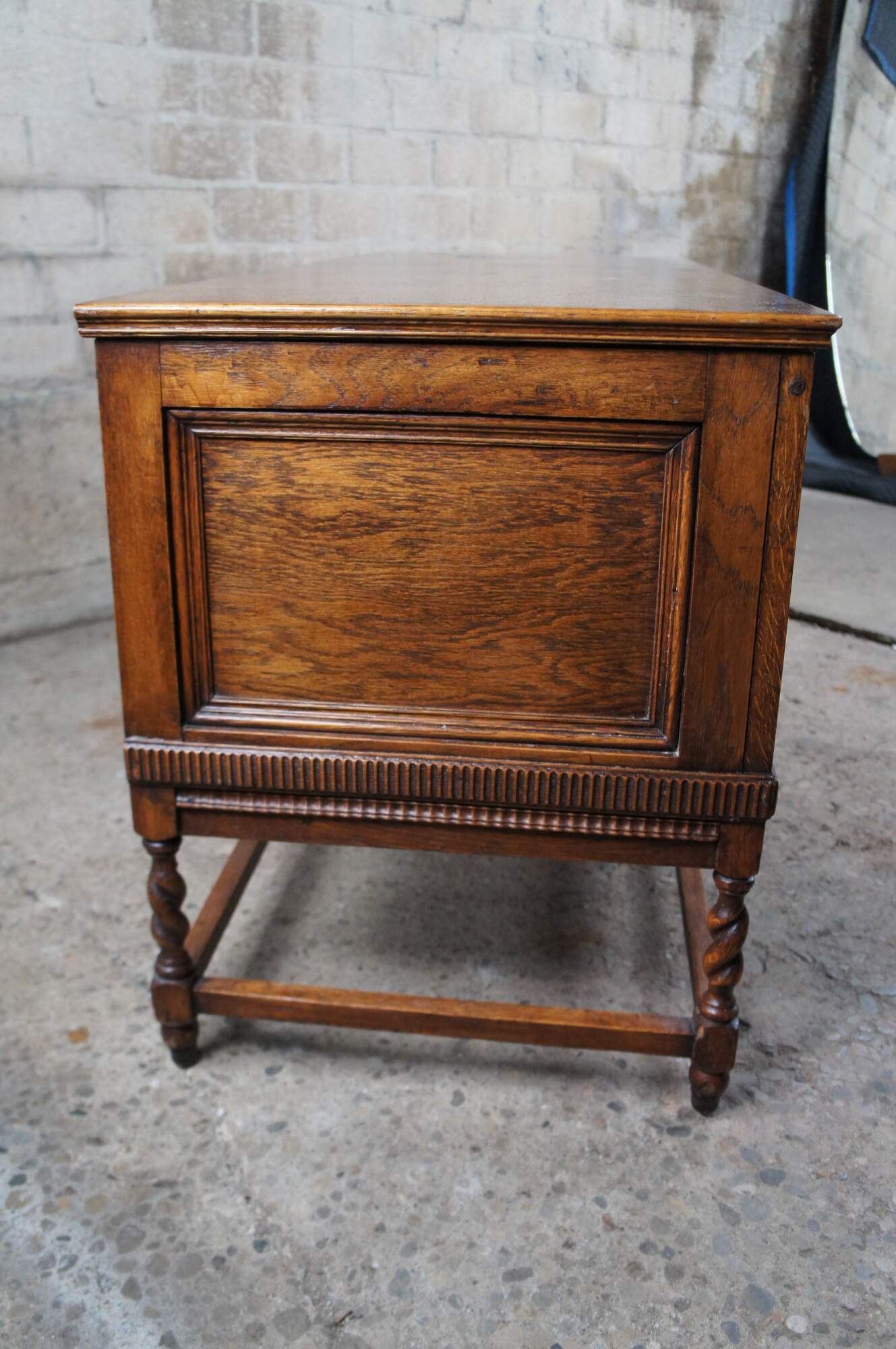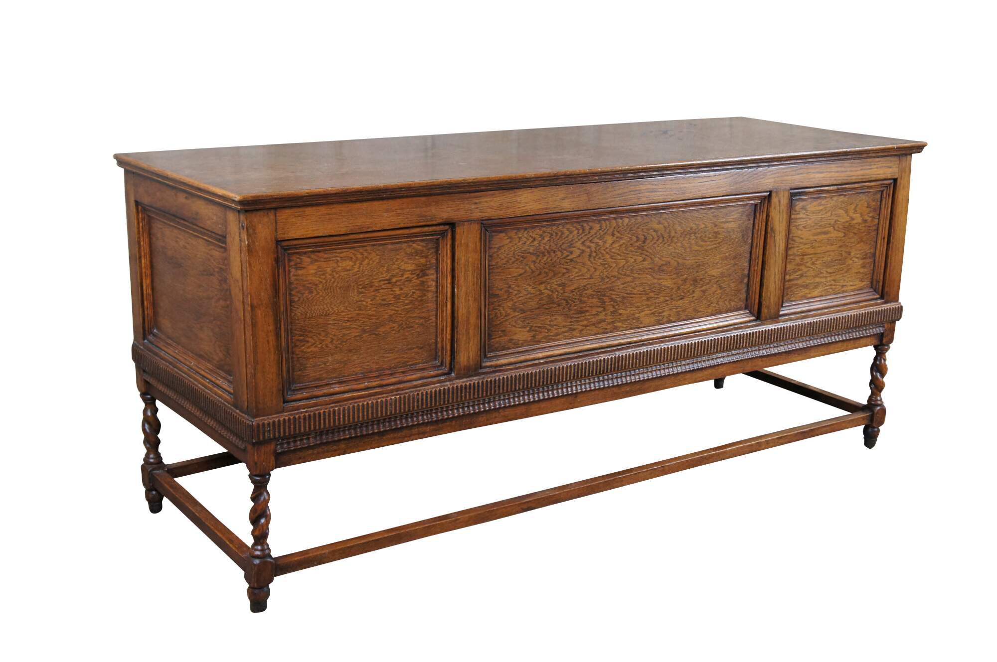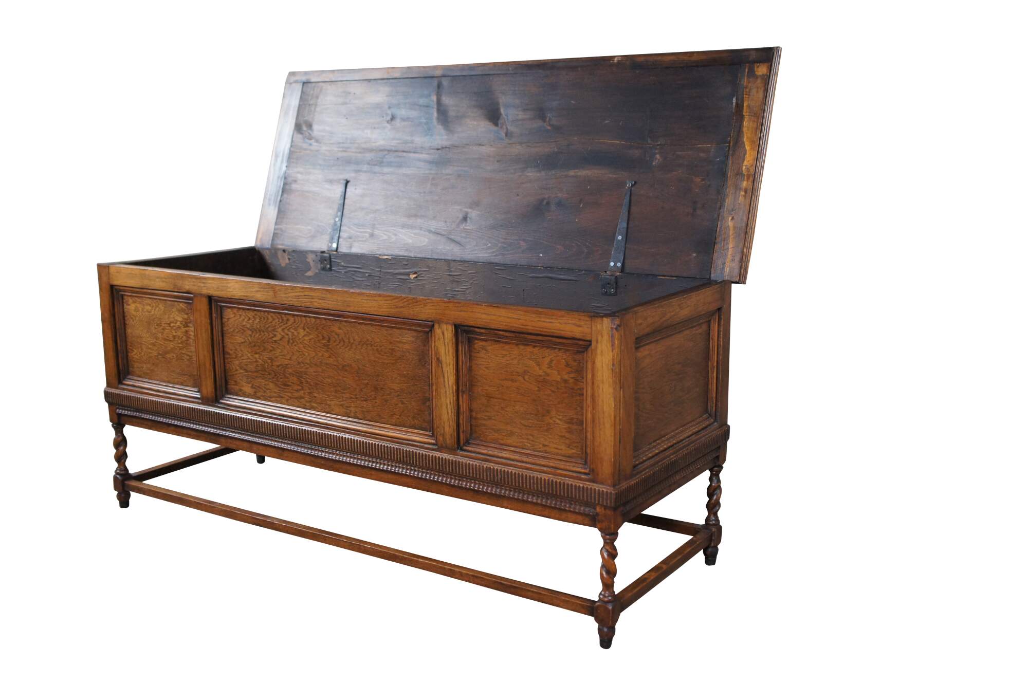 An exceptional American Victorian Oak blanket chest. French inspired with paneled front and sides over joined barley twist supports. The trunk opens via two large iron hinges.