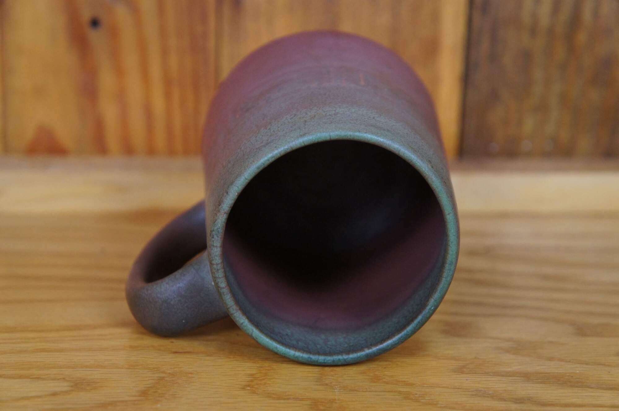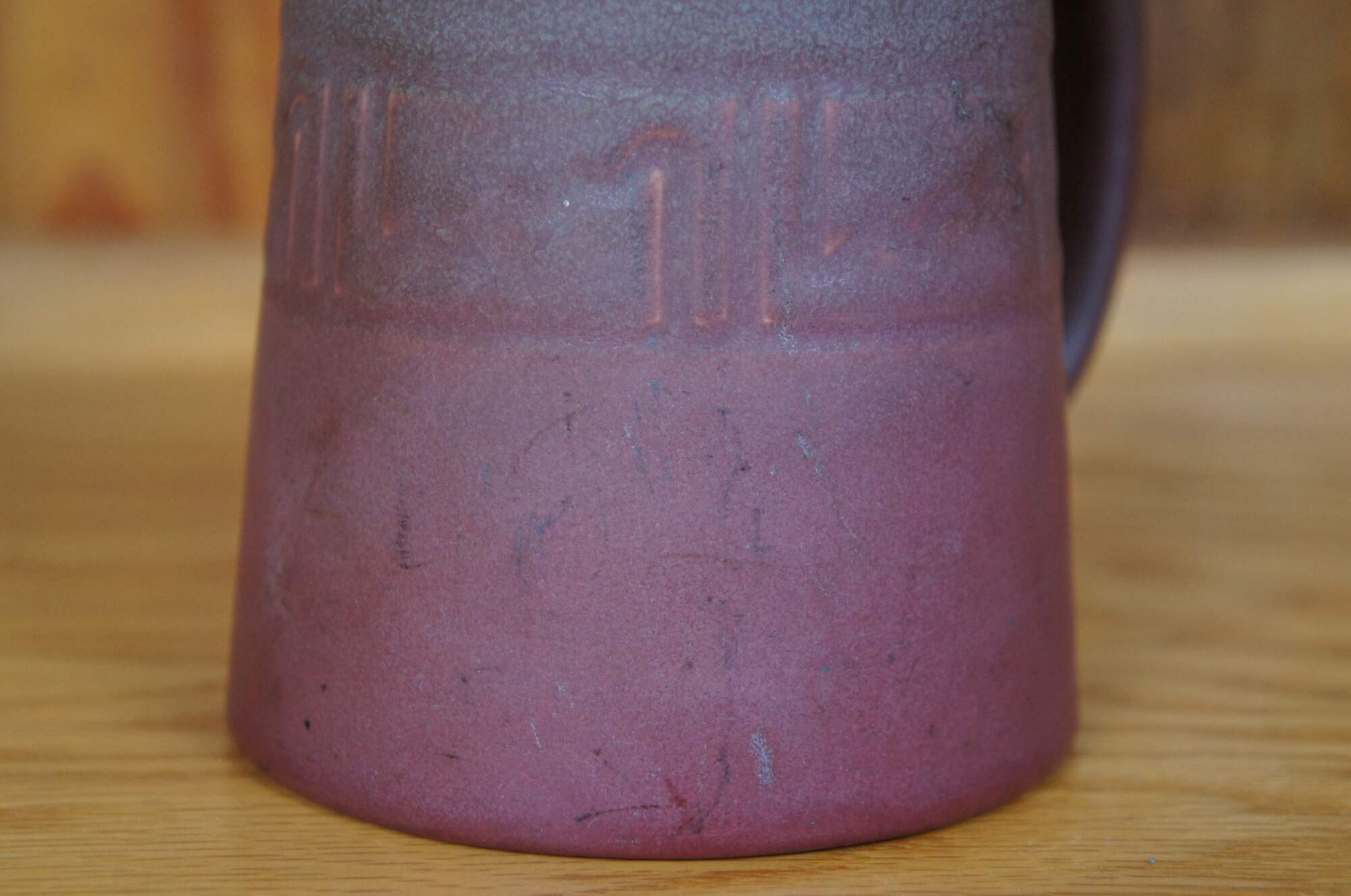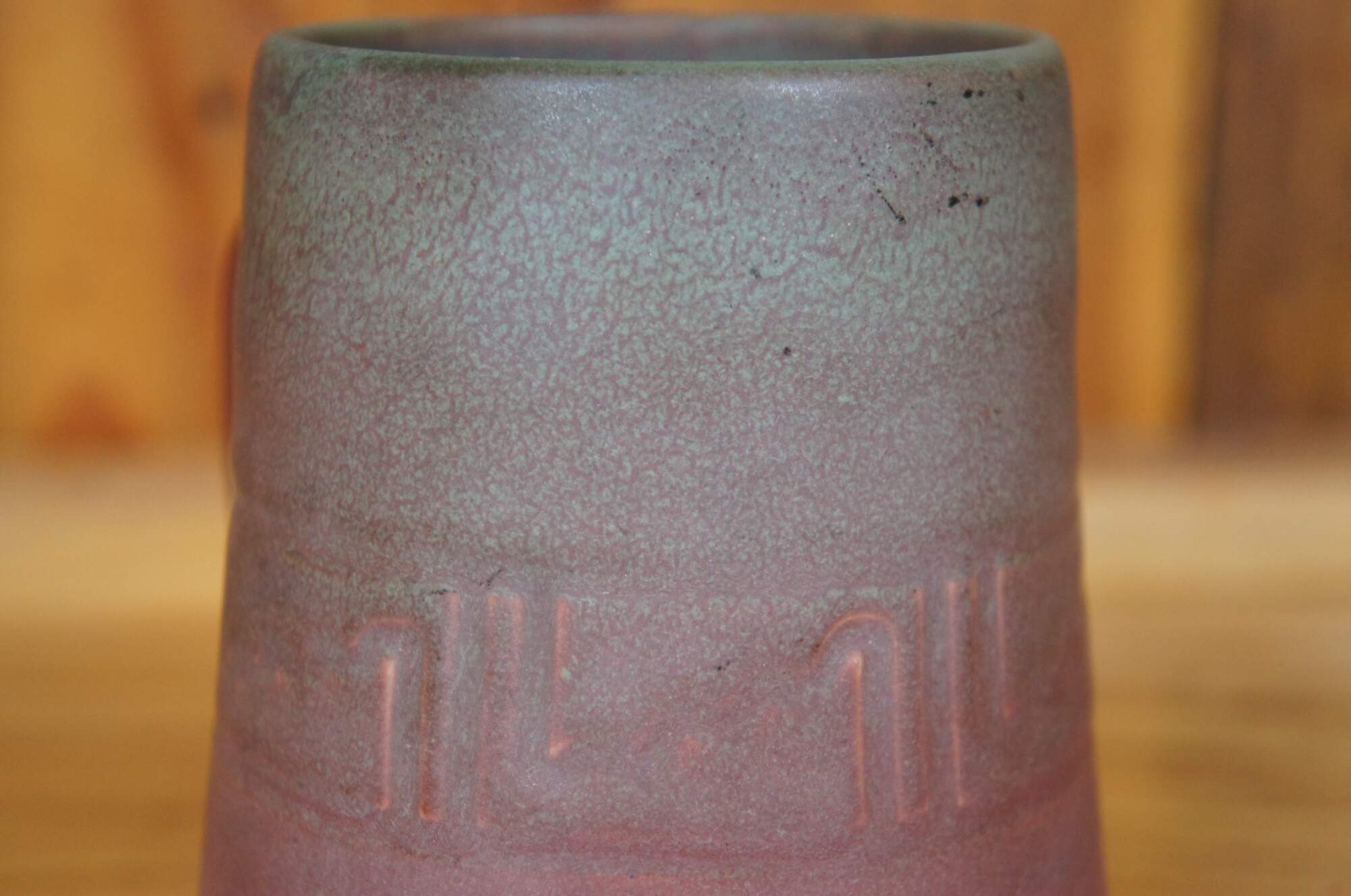 Antique Rookwood arts & crafts / art nouveau vellum glaze mug / stein featuring a mottled purple and blue undertone matte glaze cup with handle. Circa VII 1905, shape 587, size C.