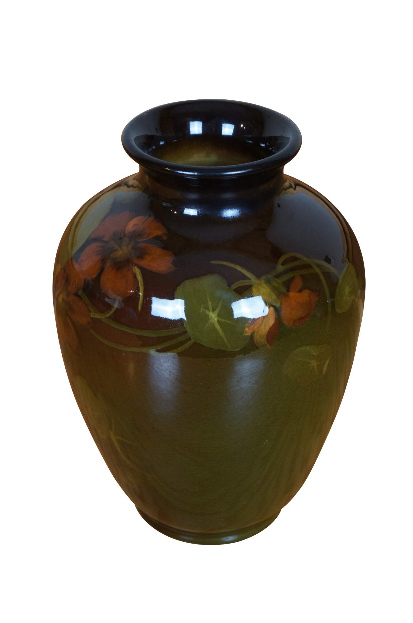 Antique Rookwood mantel vase or urn by Lenore Asbury. It features and Art Nouveau Autumn design of flowers and leaves. Circa 1902. Shape 814. Size A - large. Signed LA for Lenore Asbury.