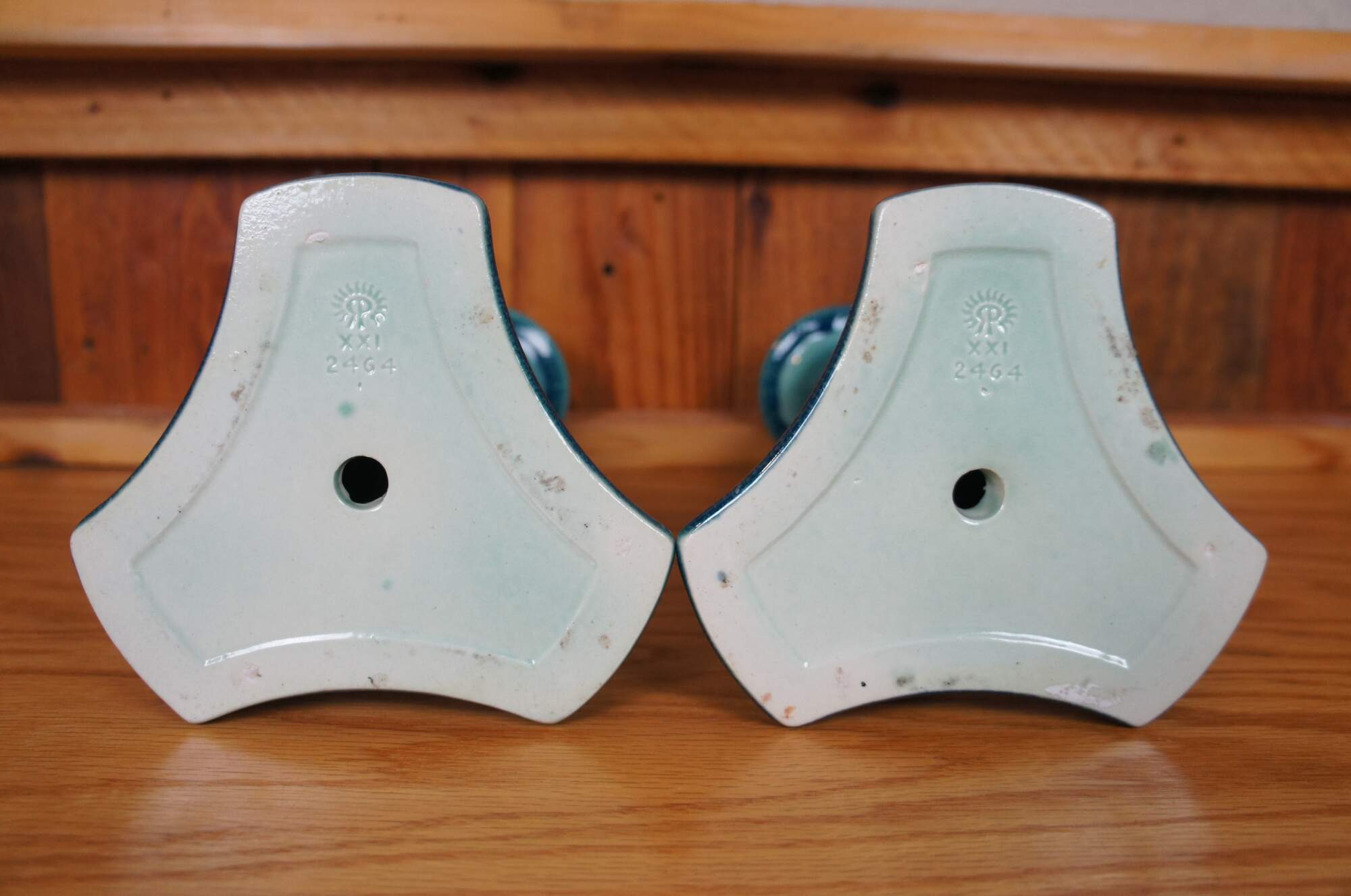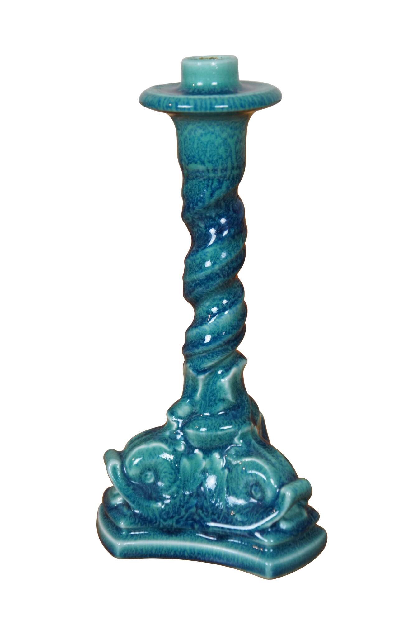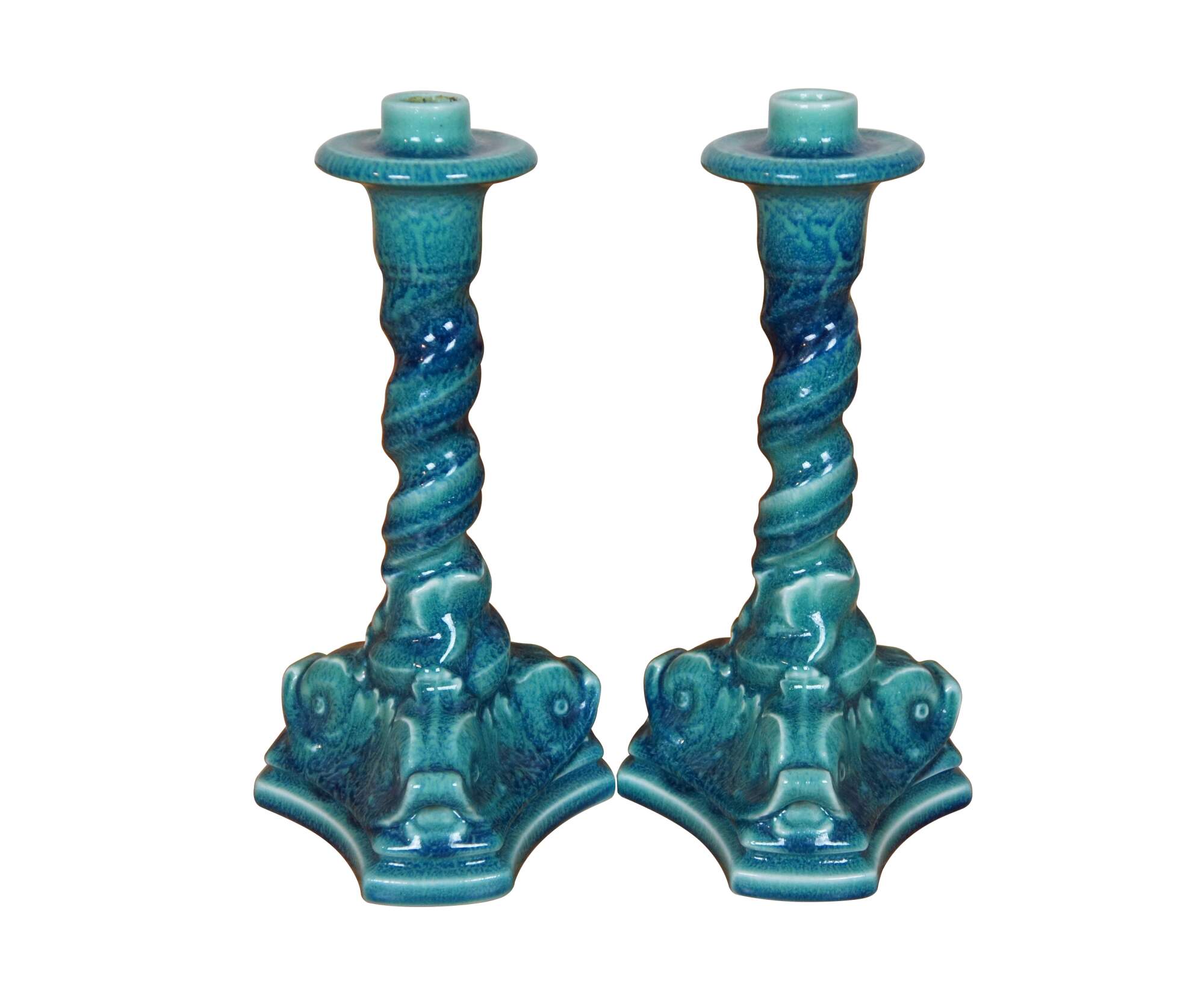 Antique Rookwood candlesticks or candle holders featuring a barley twisted design and triangular base with delphins / dolphins in a sharpe blue / turquouse glaze. Circa 1921. Shape 2464.