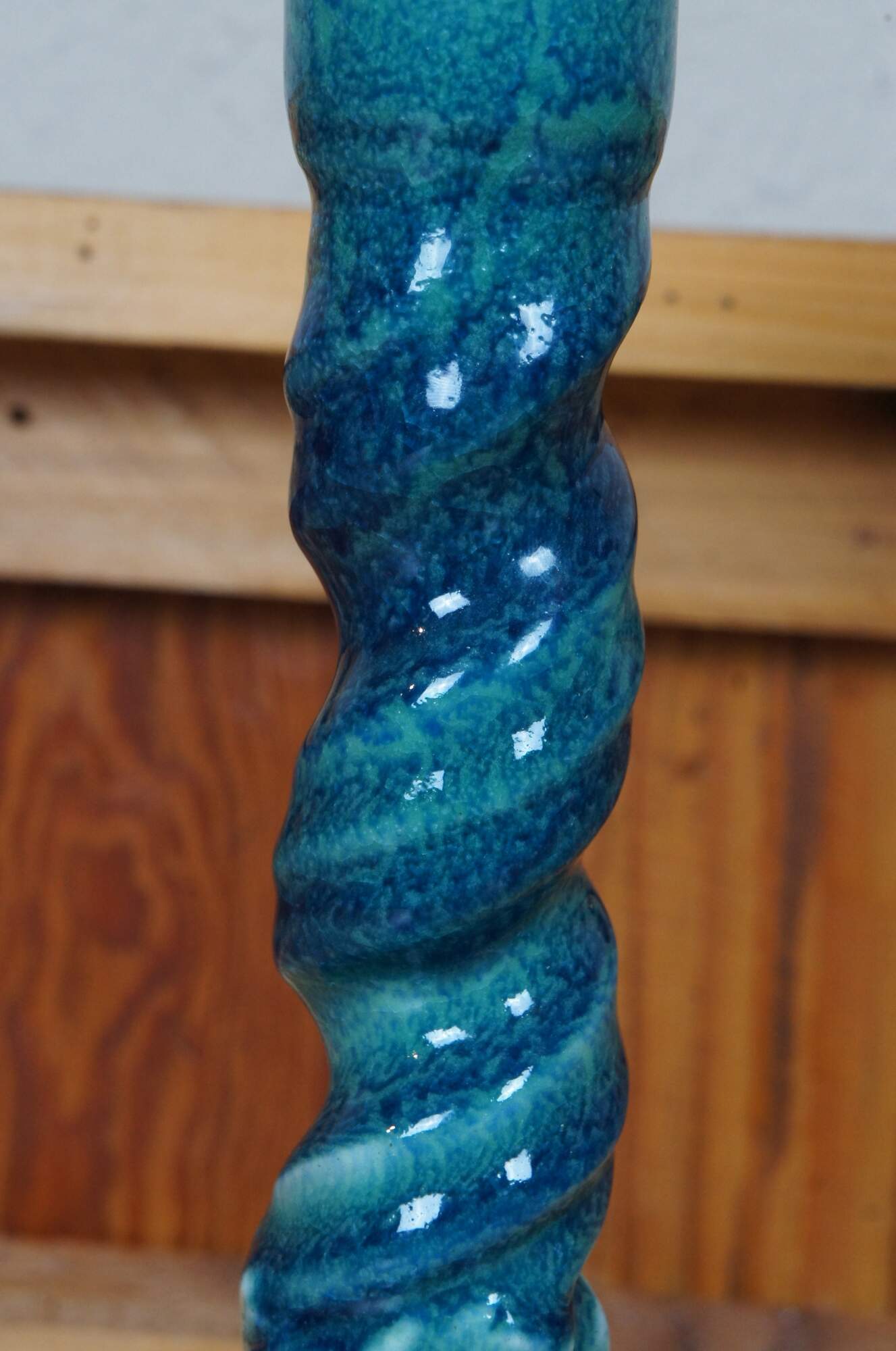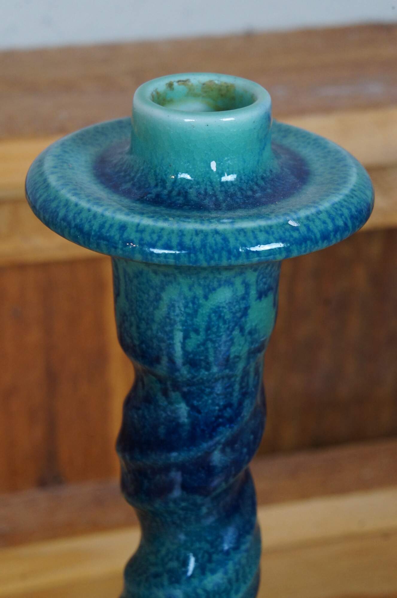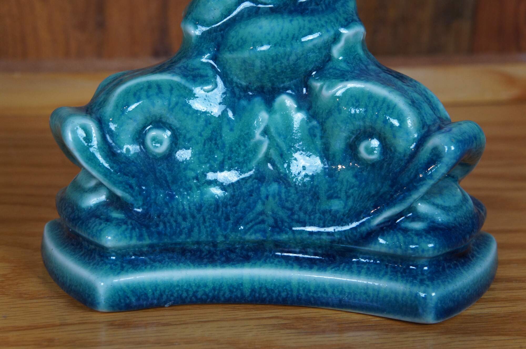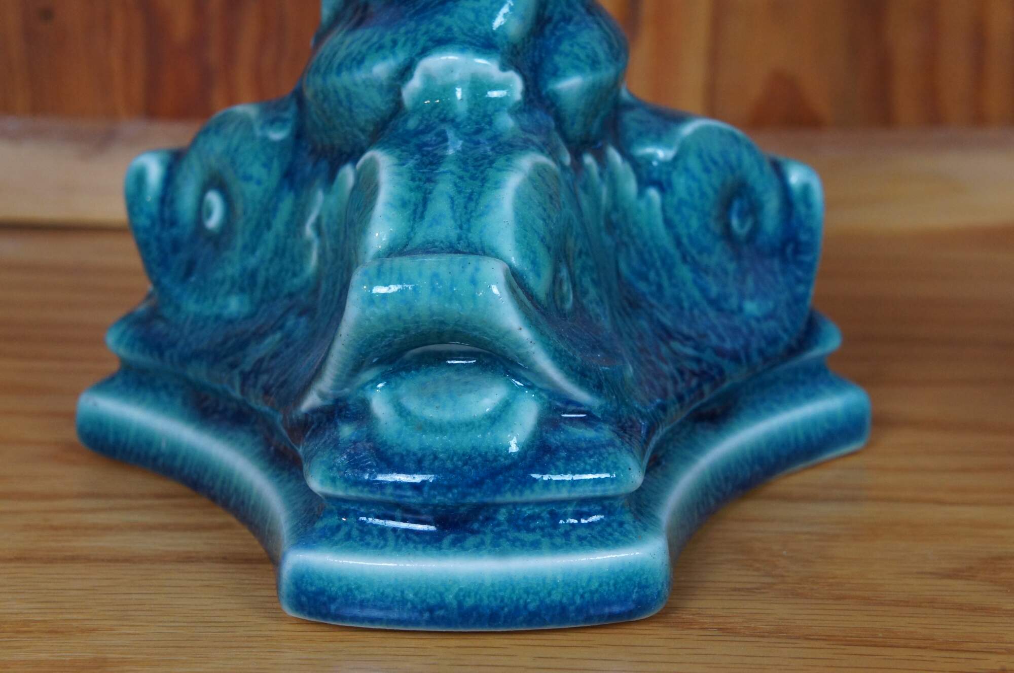 Antique Rookwood candlesticks or candle holders featuring a barley twisted design and triangular base with delphins / dolphins in a sharpe blue / turquouse glaze. Circa 1921. Shape 2464.