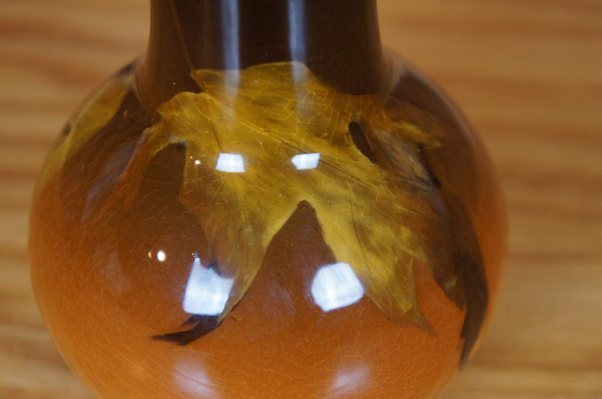 Antique Rookwood Irene Bishop vase or urn featuring Art Nouveau / Arts & Crafts styling with an Autumn Oak leaf motif of browns and orange glaze. Cirac 1901. Shape 40. Signed IB for Irene Bishop.