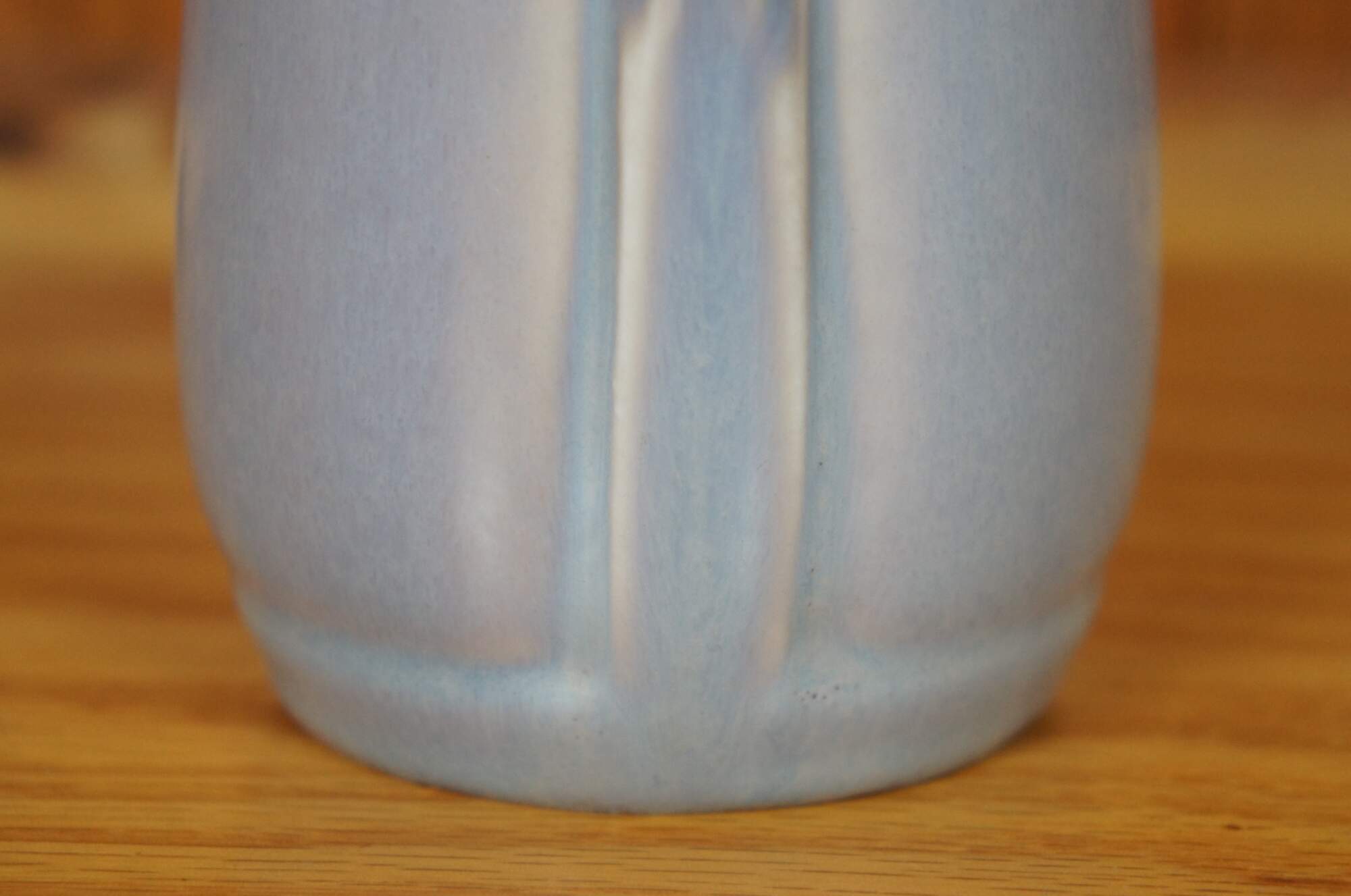 Antique Rookwood bud vase featuring Art Deco styling with three handles, finished in a soft lavender glaze
