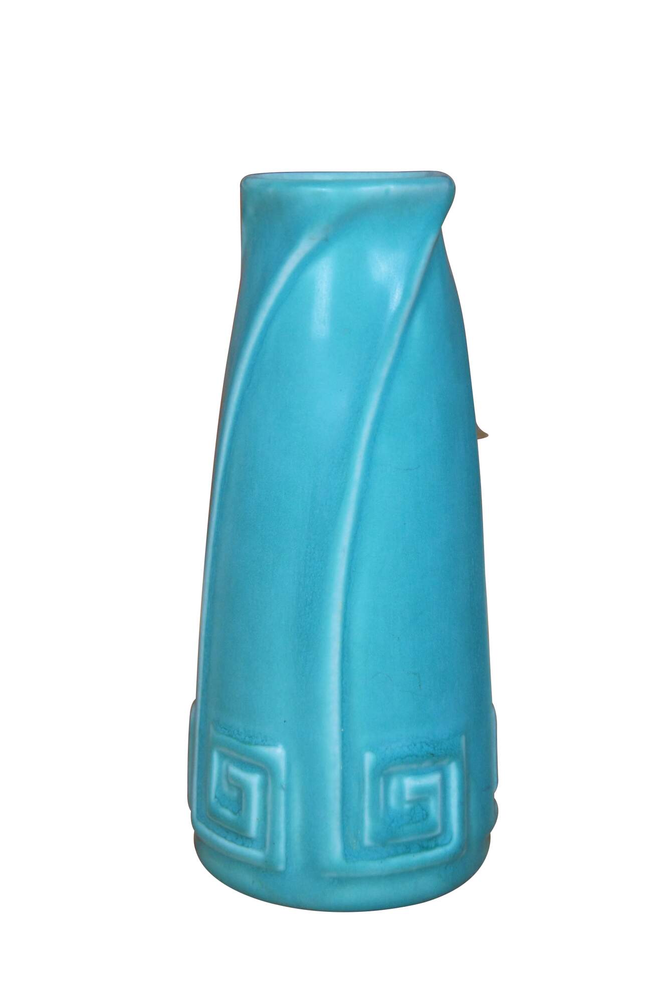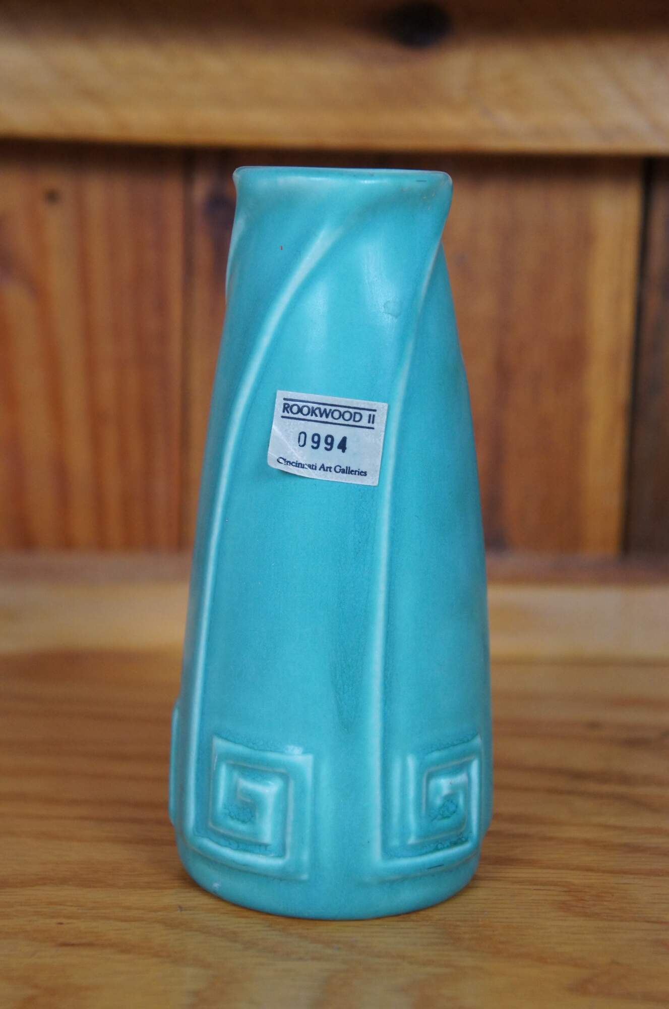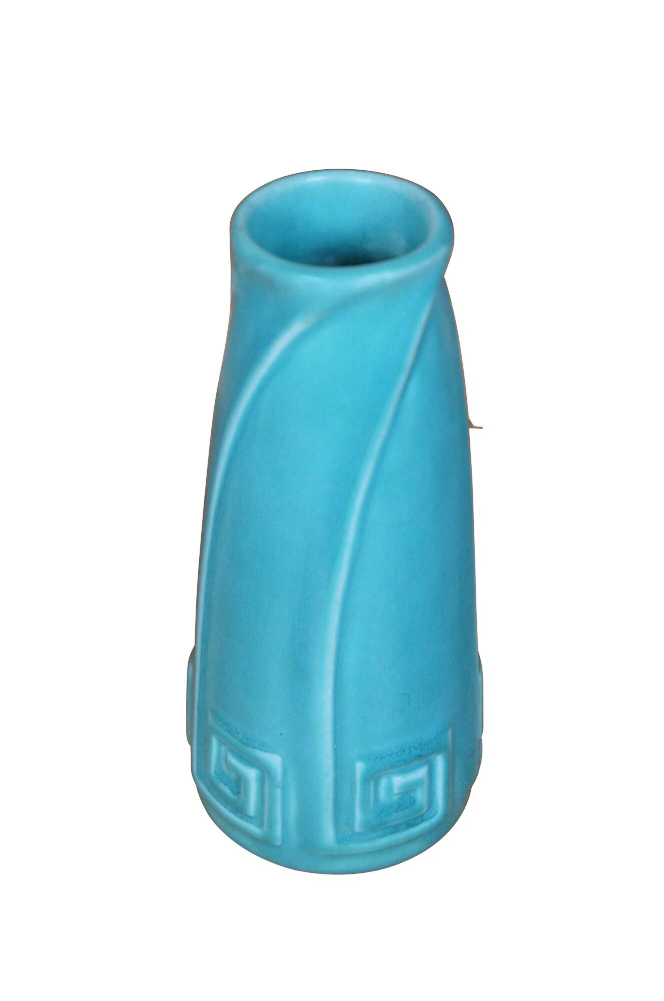 Antique Rookwood bud vase featuring Art Deco styling with geometric Greek Key design in teal / turquoise glaze. Circa 1930 XXX. Shape 2135. Makred with the special 50 year anniversary marking consisiting of a semicircular set of hash marks.