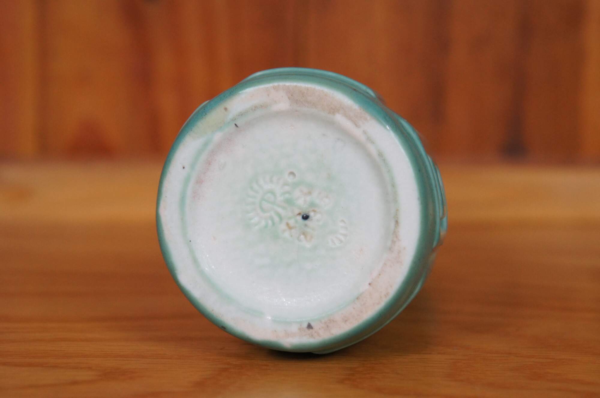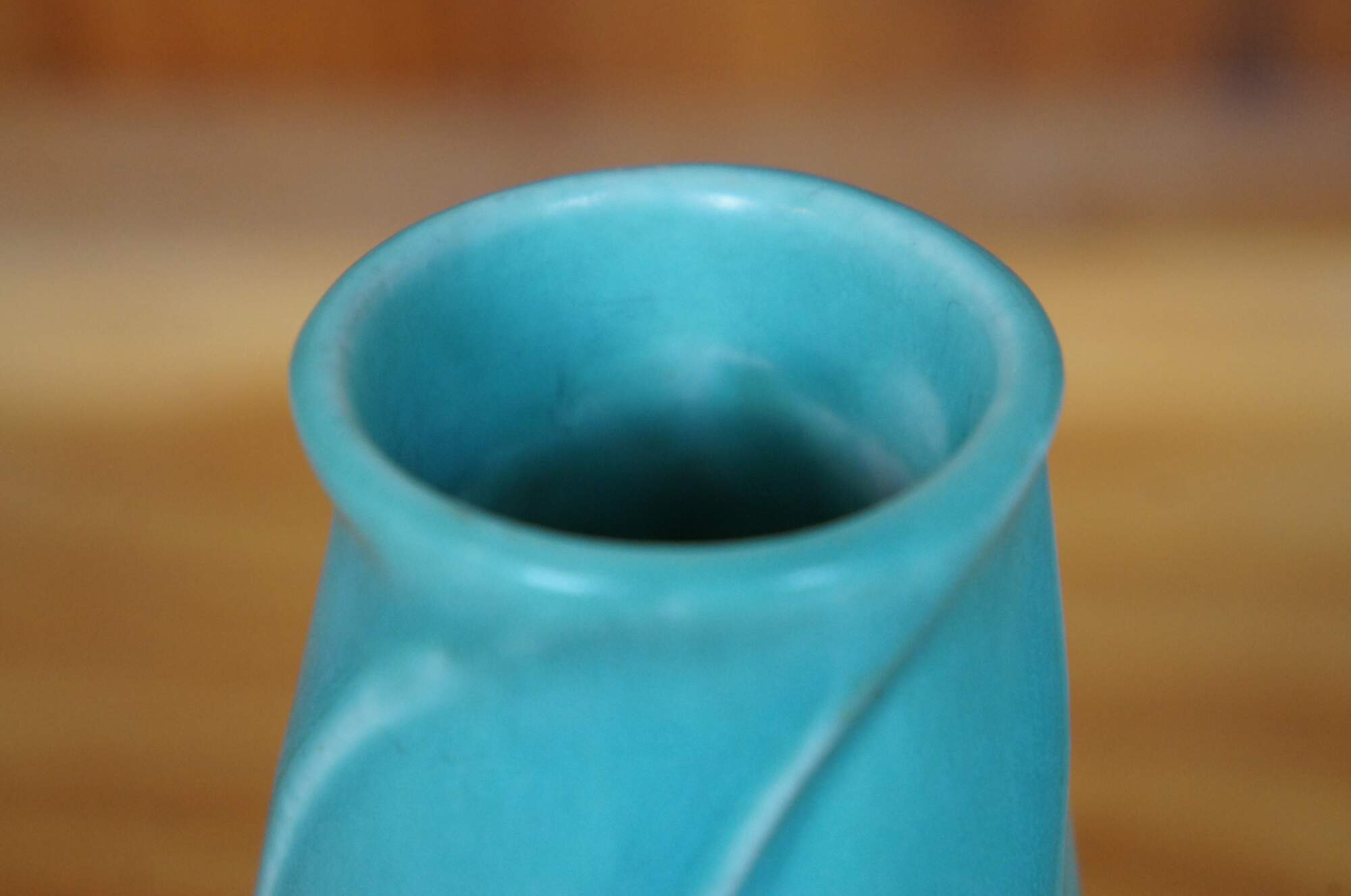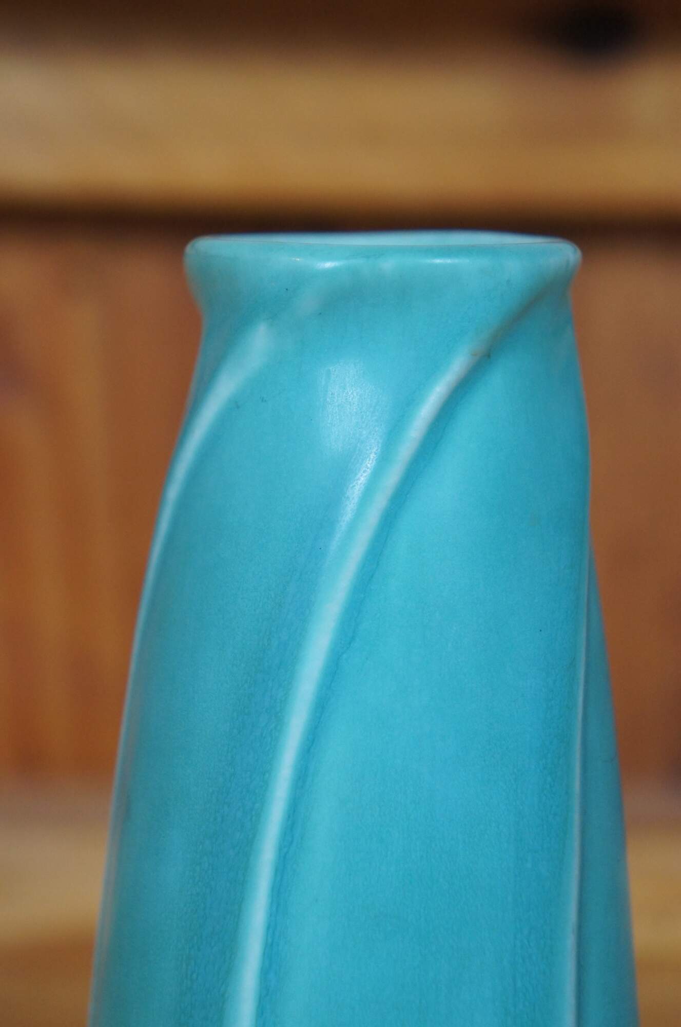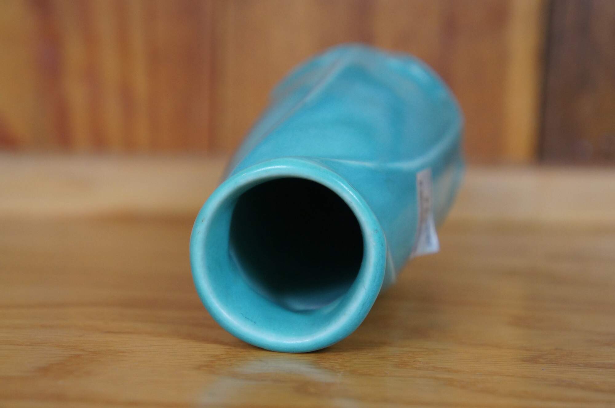 Antique Rookwood bud vase featuring Art Deco styling with geometric Greek Key design in teal / turquoise glaze. Circa 1930 XXX. Shape 2135. Makred with the special 50 year anniversary marking consisiting of a semicircular set of hash marks.