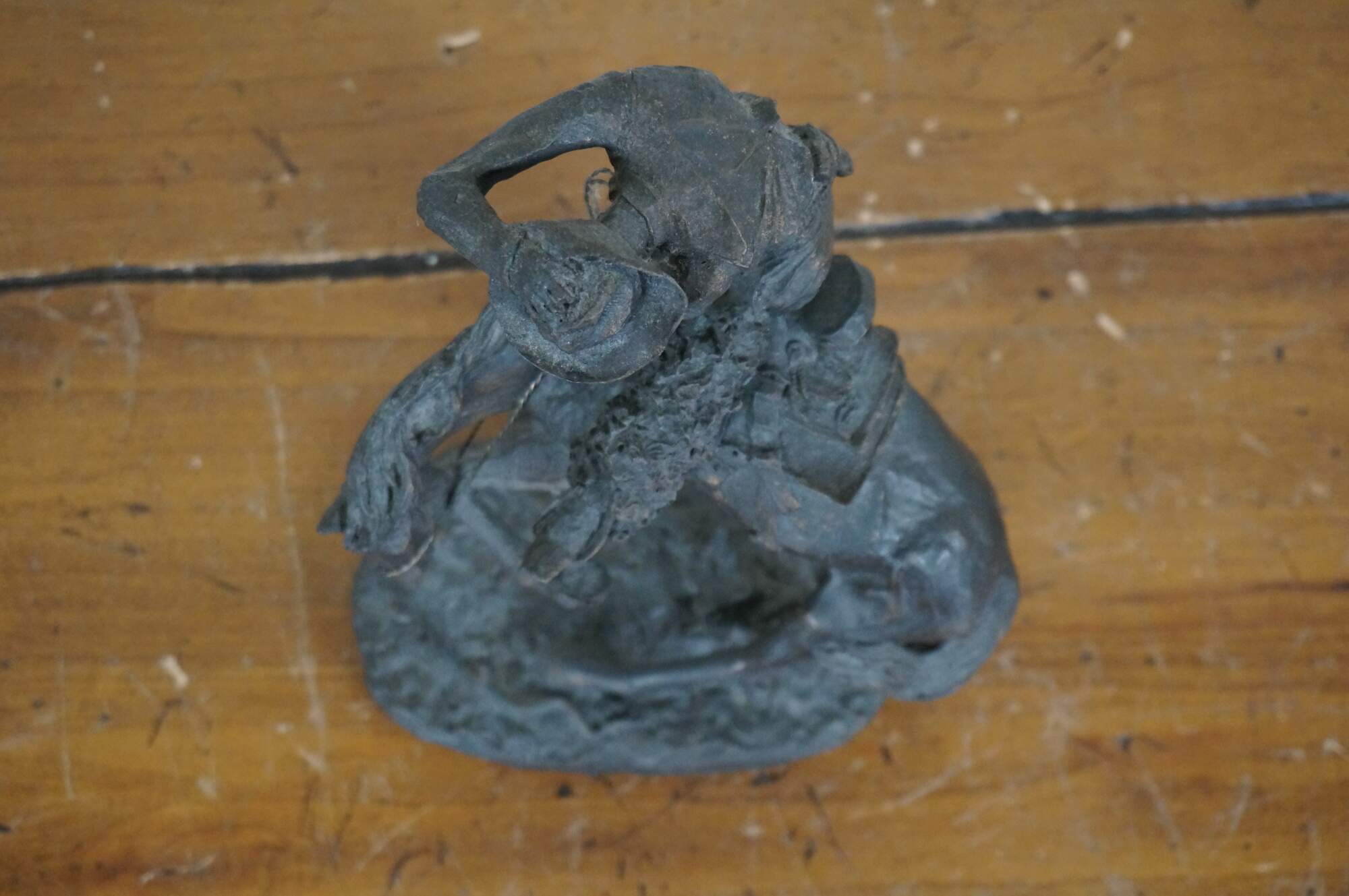 Late 20th century bronze Western equestrian sculpture / figurine after "The Rattlesnake" by Frederic Remington. Depicts a cowboy grippping his hat on a horse rearing away from a snake on the ground. Marked NE Copyright 1982 GRI along one side. Limited Edition issued by the New England Collectors Society, Serial Number 6084/9500.