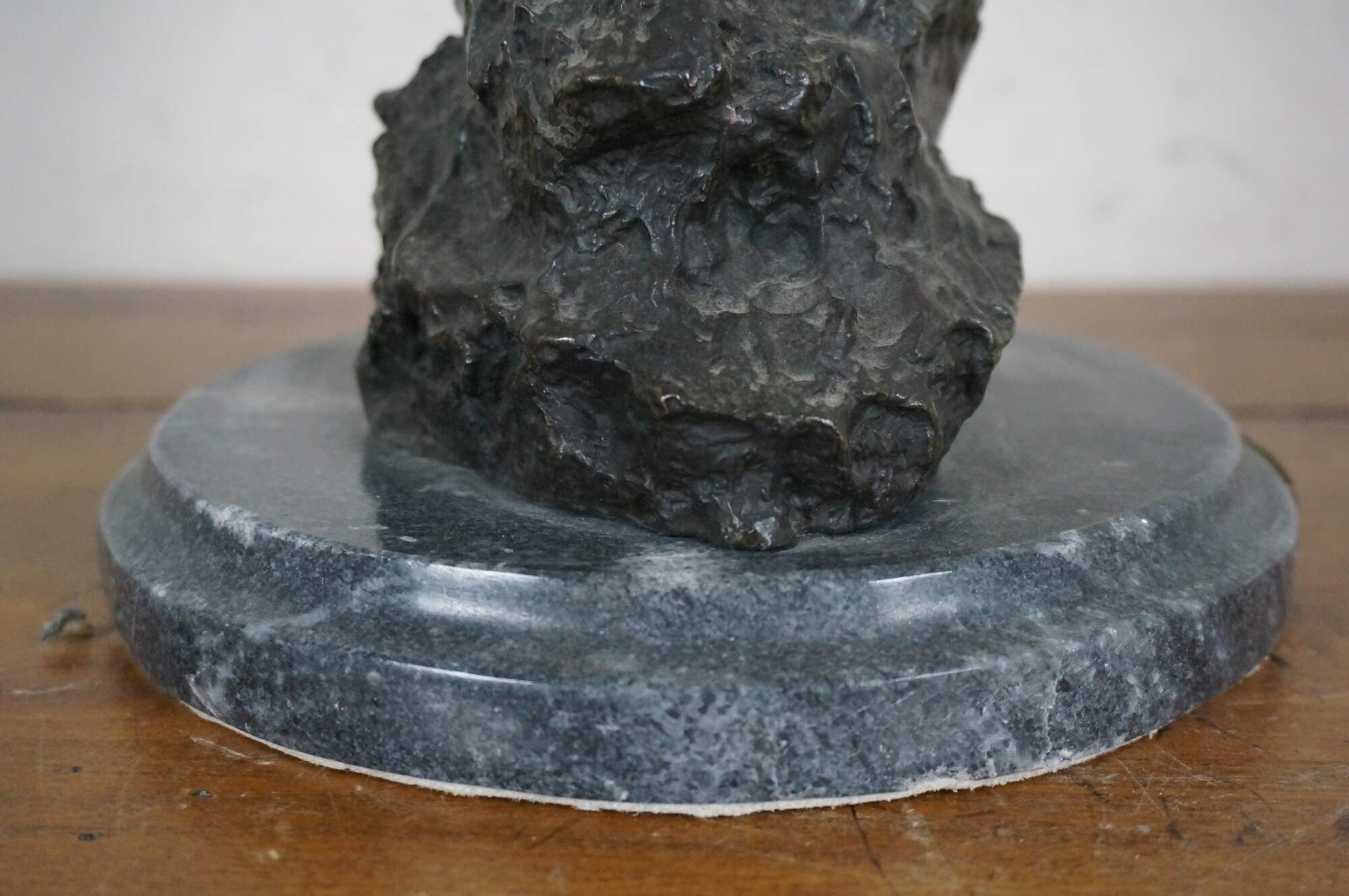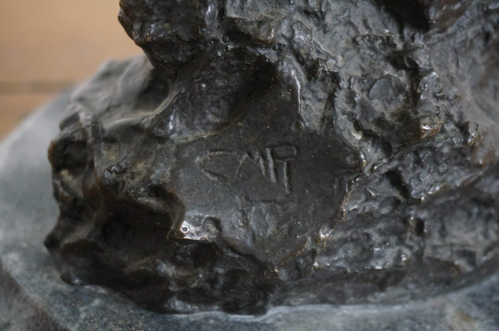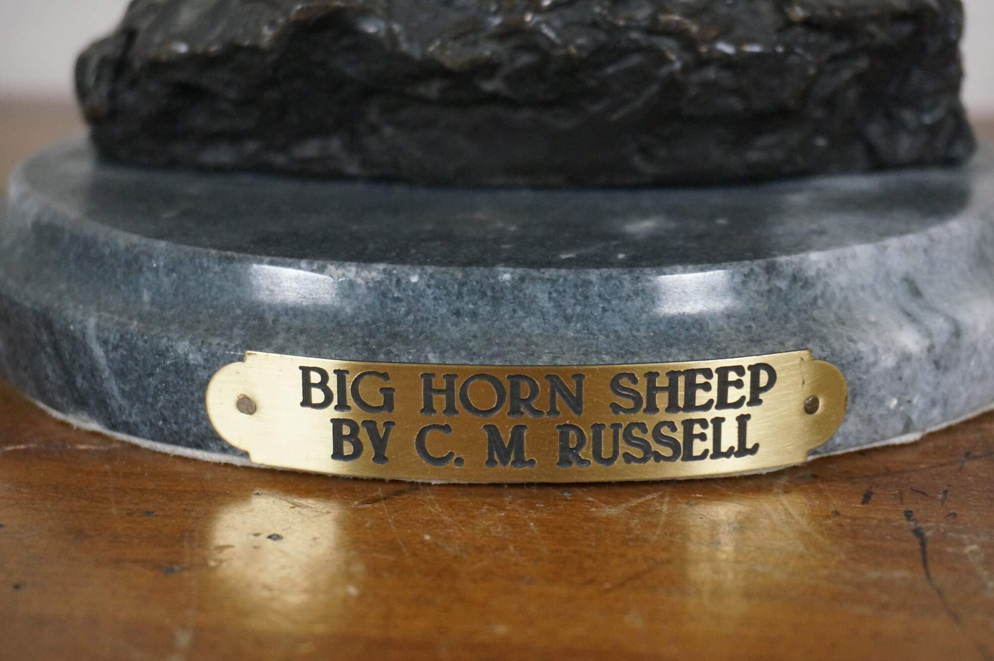 20th century bronze sculpture / figurine after "Big Horn Sheep" by C.M. Russell. Depicts a muscular big horn sheep standing proudly on a boulder. Marked CMR on one side. Gray marble base with felt bottom and brass name plate.