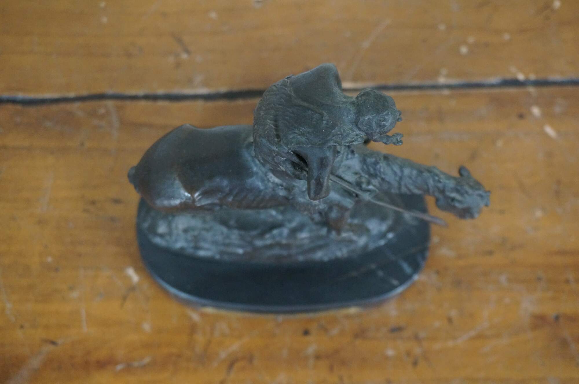 20th century bronze equestrian figurine / sculpture after "End of the Trail" by James Earle Fraser. Depicts a weary Native American man on an equally weary horse. Gray marble base with felt bottom and brass name plate.