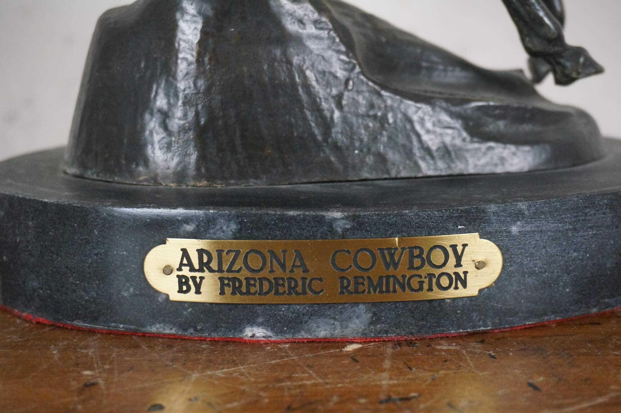 20th century bronze equestrian sculpture / figurine after "Arizona Cowboy" by Frederic Remington. Depicts an arizona cowboy / cavalry officer on a horse traversing a steep rock. Marked Frederic Remington 1897 H.B.B. around front hooves. Gray marble base with felt bottom and brass name plaque.