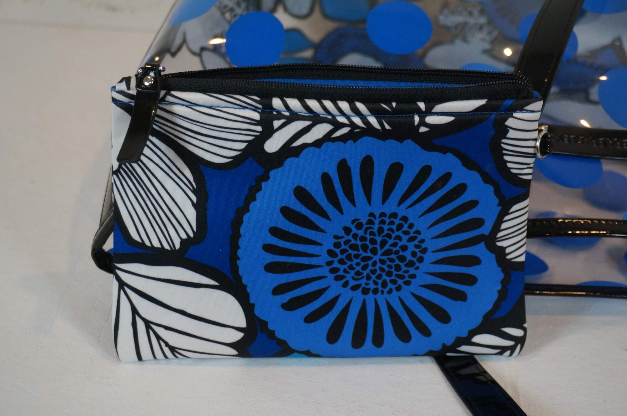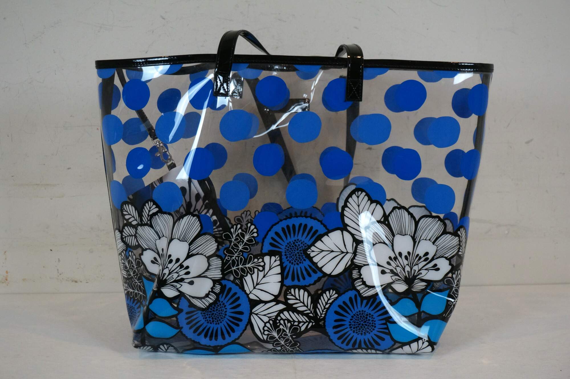 Vera Bradley Blue Bayou polka dot clear plastic beach bag/tote with clip-on neoprene wristlet.