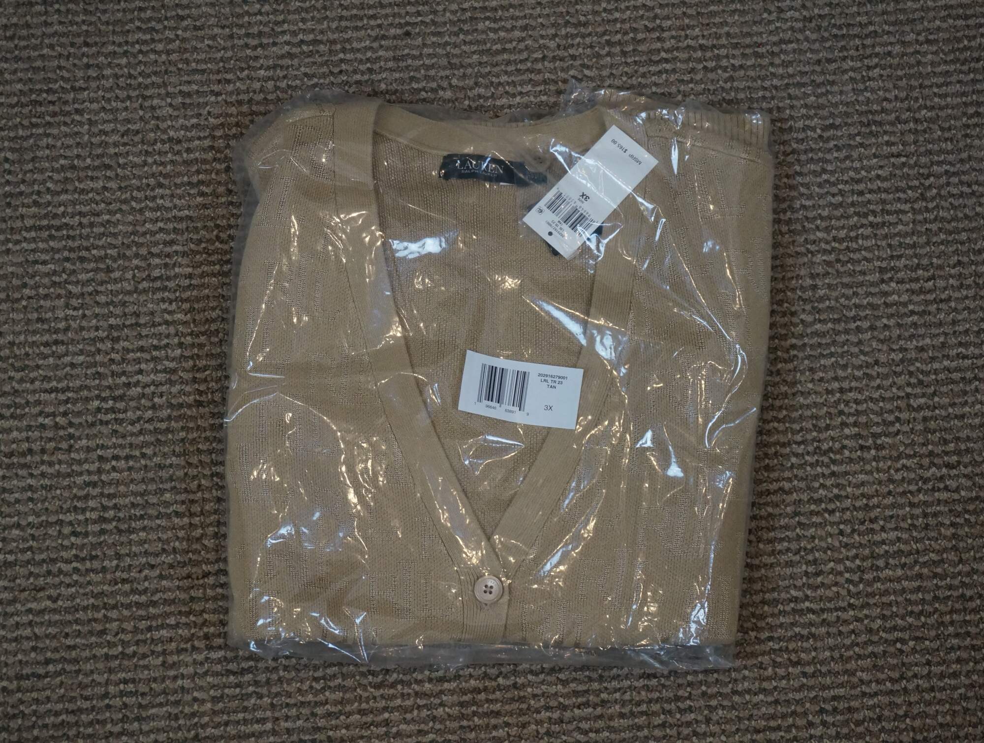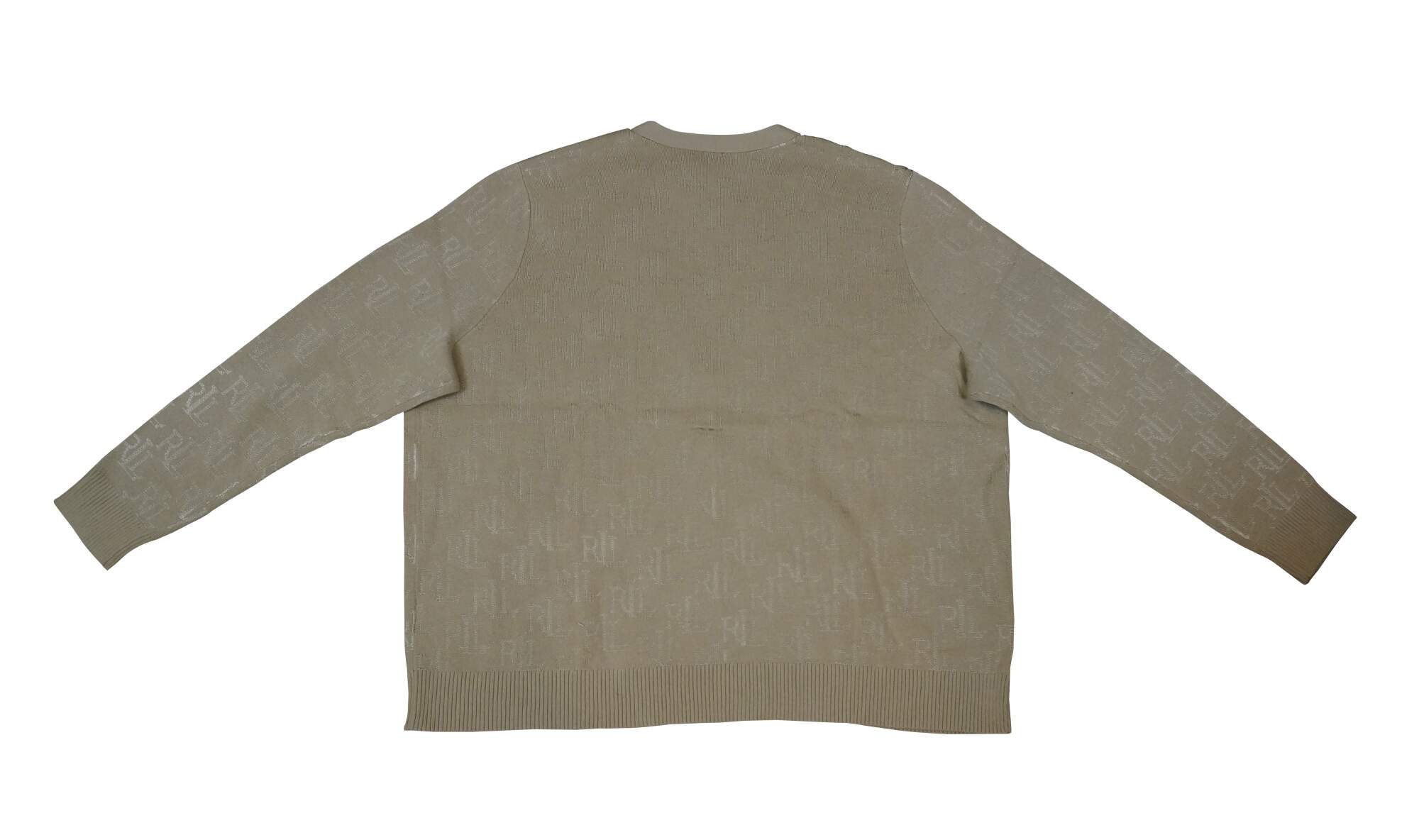 Lauren Ralph Lauren long sleeve women's cardigan sweater. V-neck, button closure. Tan with monogram pattern. Made in China.