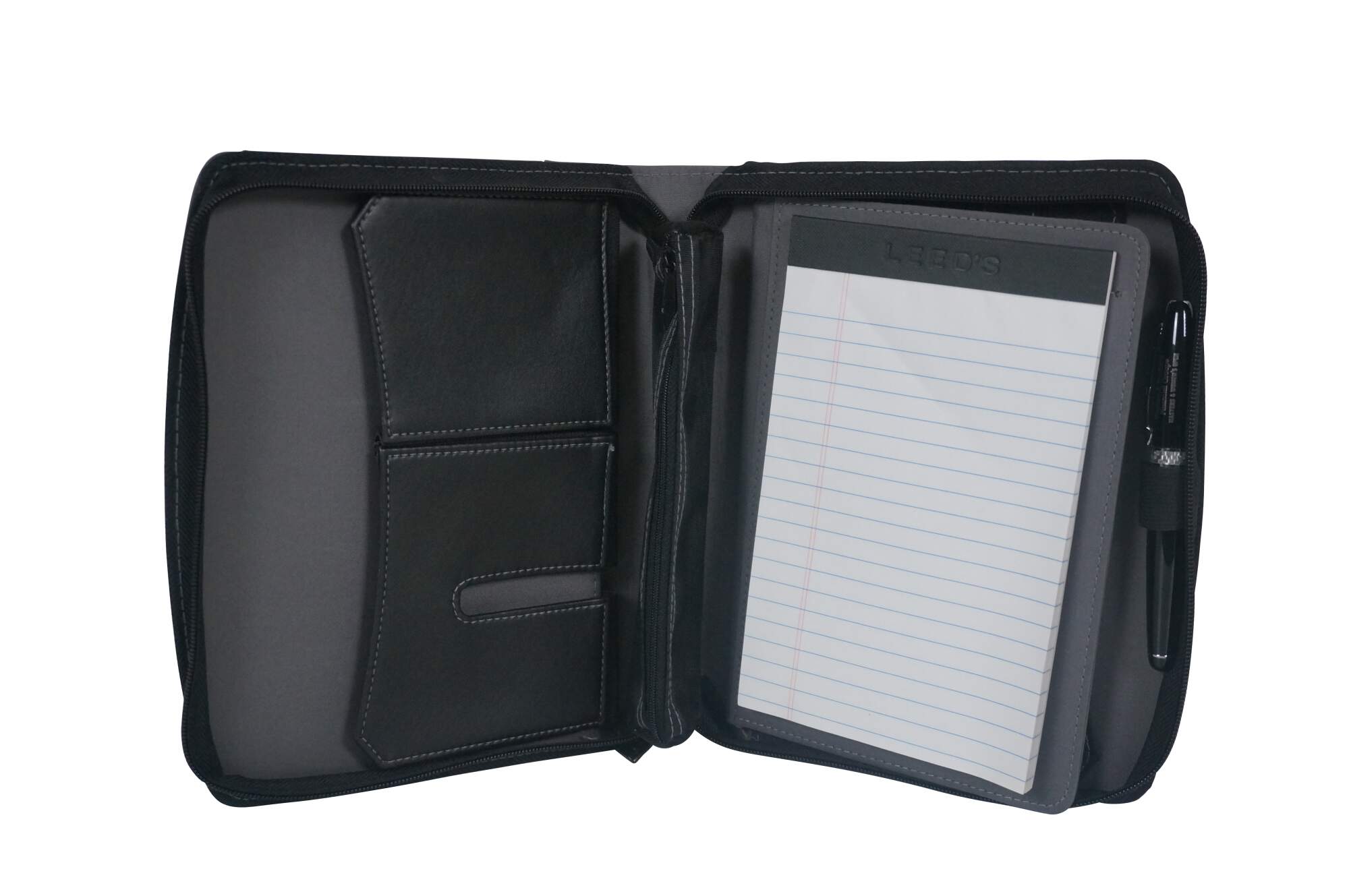 A5 size black and gray leather padfolio / organizer customized to commemorate the Cincinnati Open, sponsored by the Western & Southern Financial Group, circa 2002-2011. Front slip pocket, zippered closure, 11 assorted interior pockets, removable mesh pencil case, pen loop and re-fillable ballpoint pen, 5" x 8" note pad.
