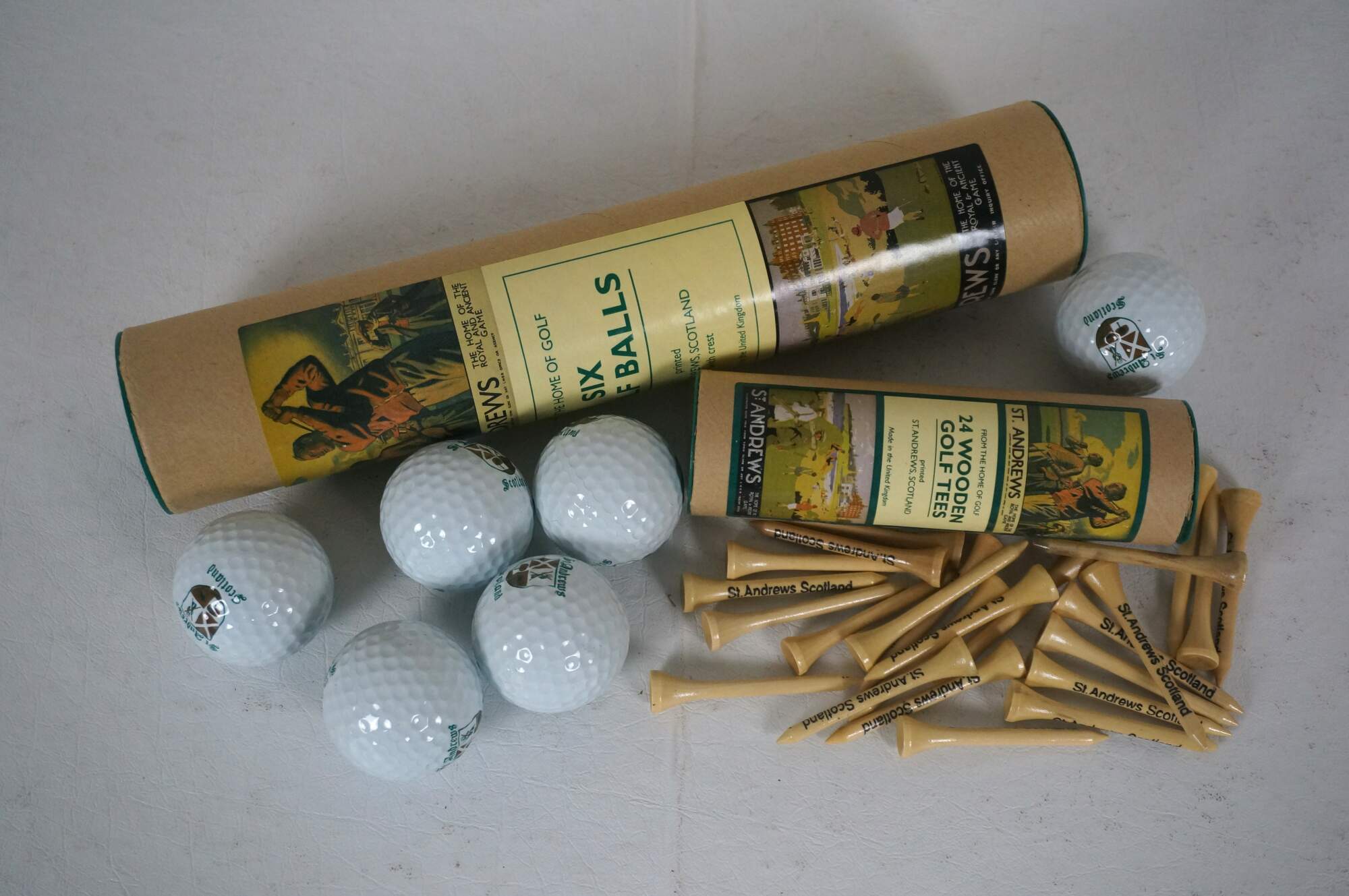 St Andrews Scotland 6 Golf Balls & 24 Wooden Tees Original Packaging Tubes