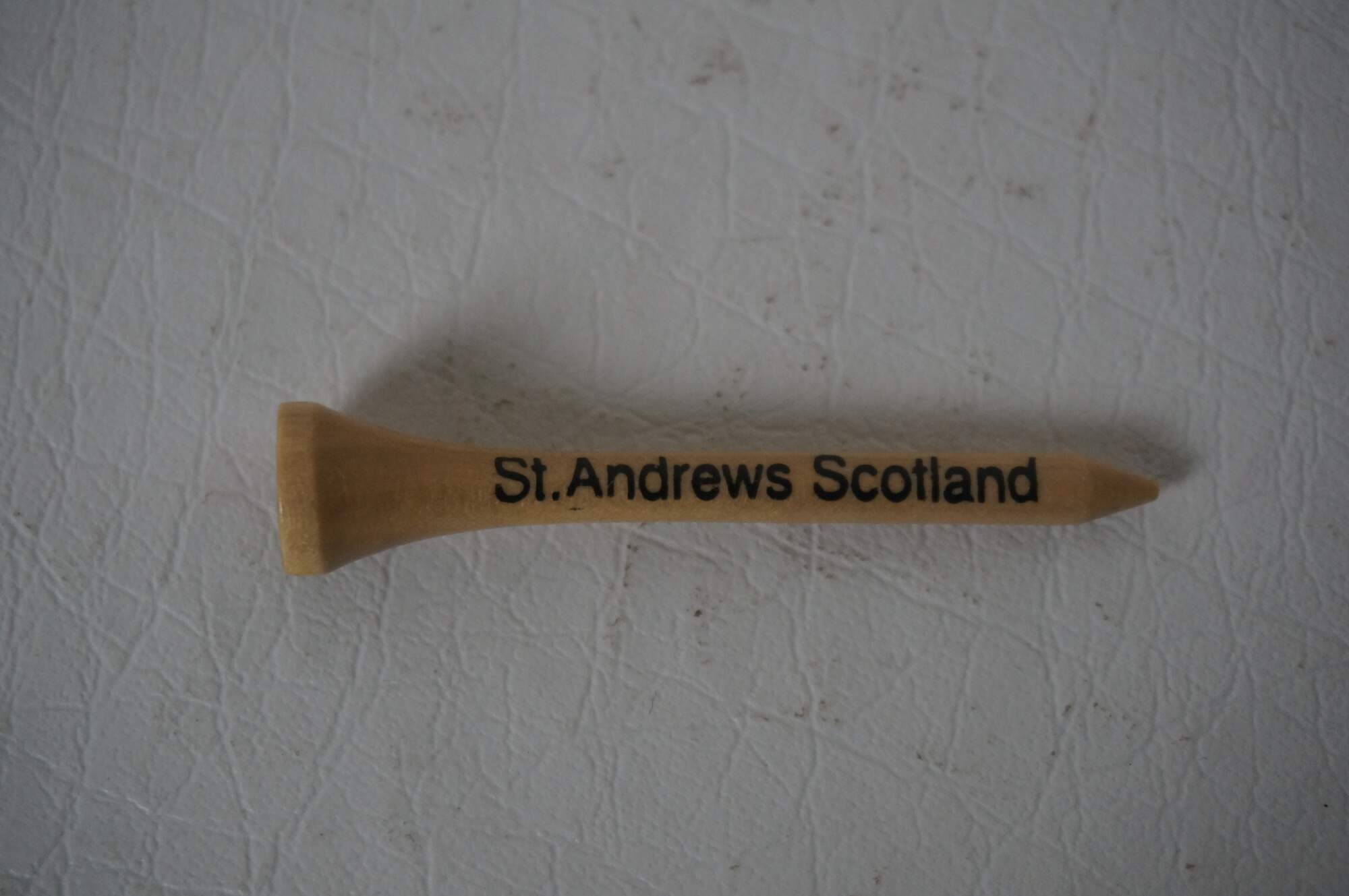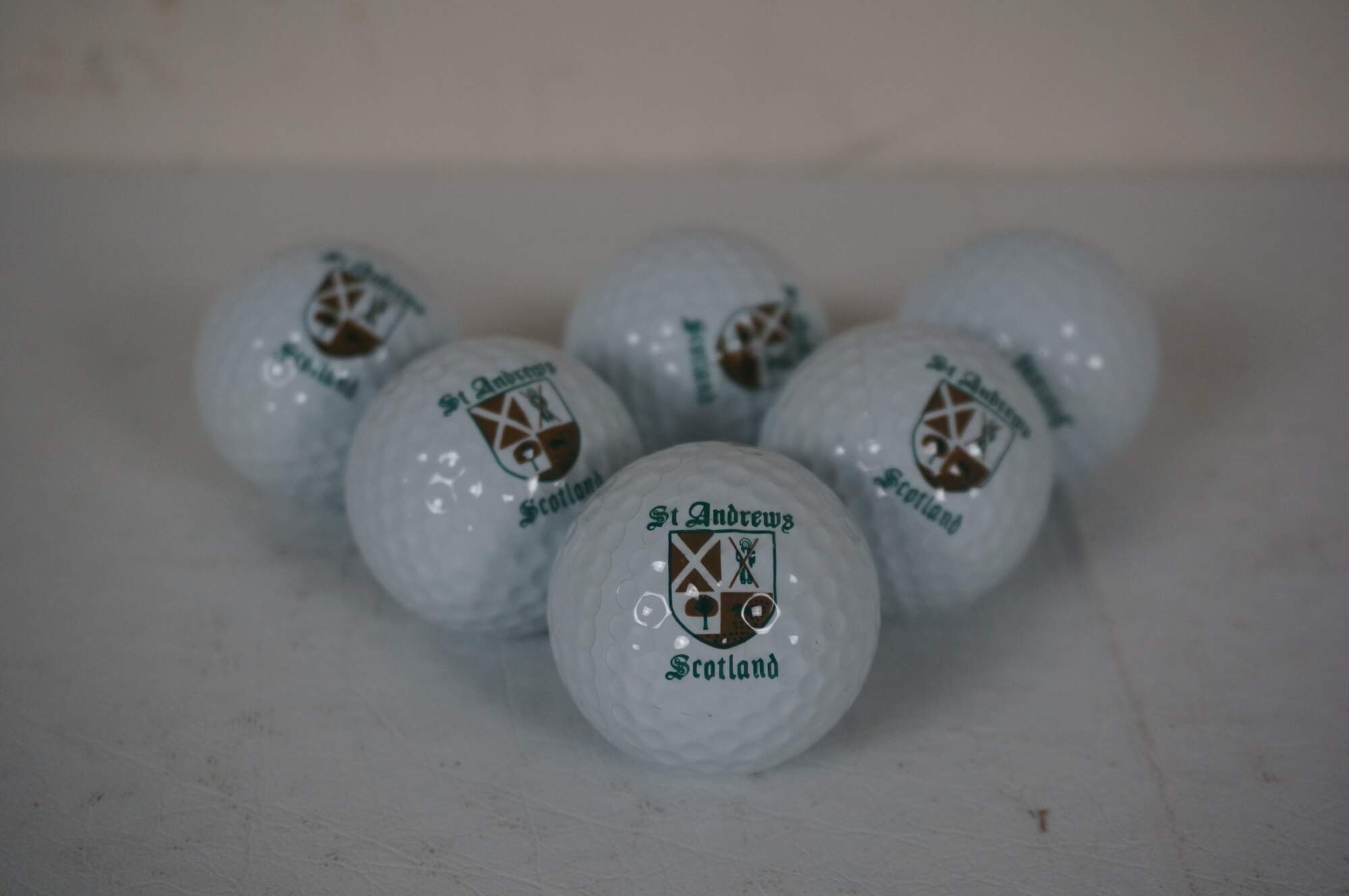 St Andrew's Scotland collectible gift set of six printed golf balls and 24 wooden golf tees in original packaging. Made in United Kingdom.