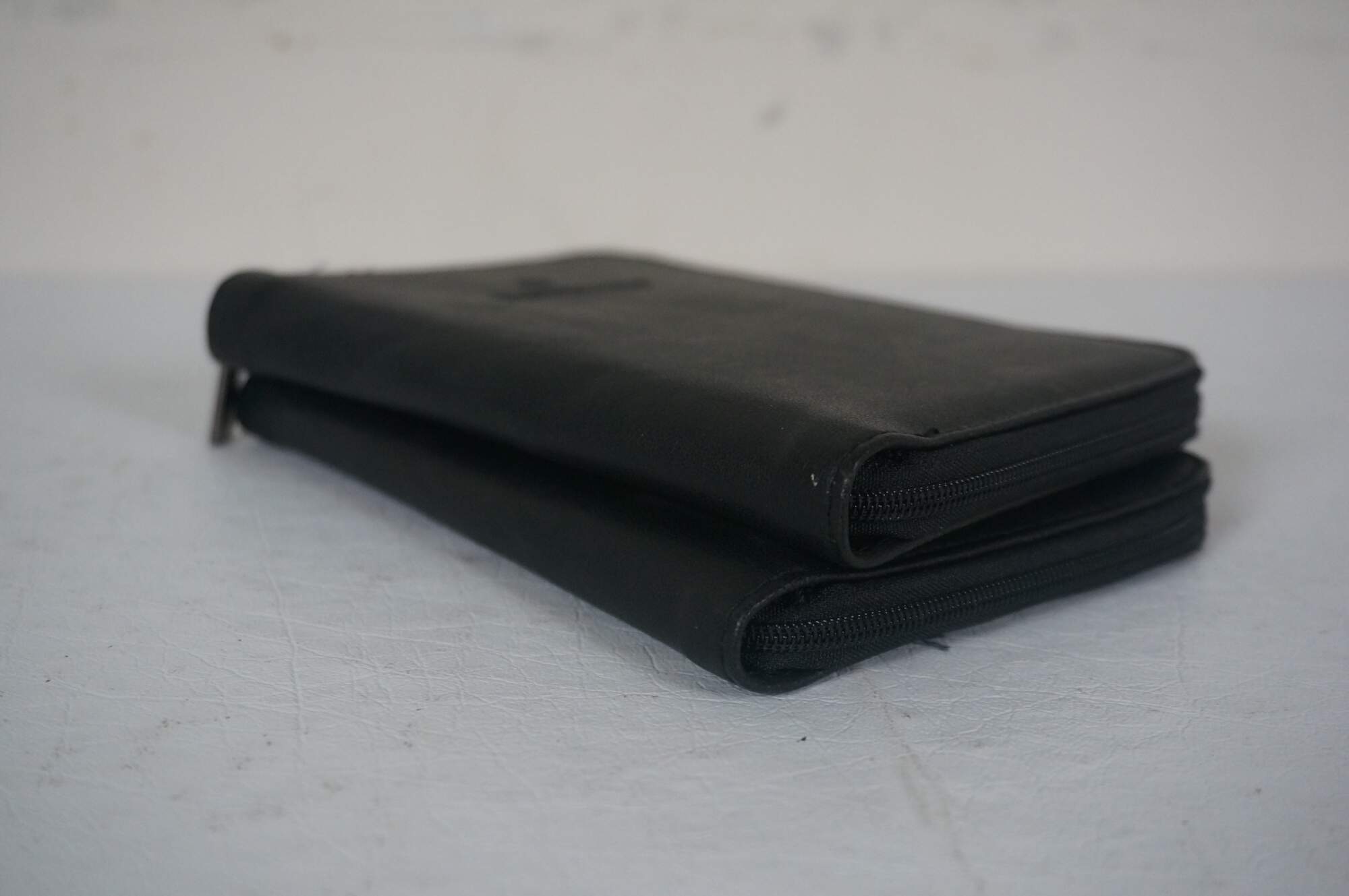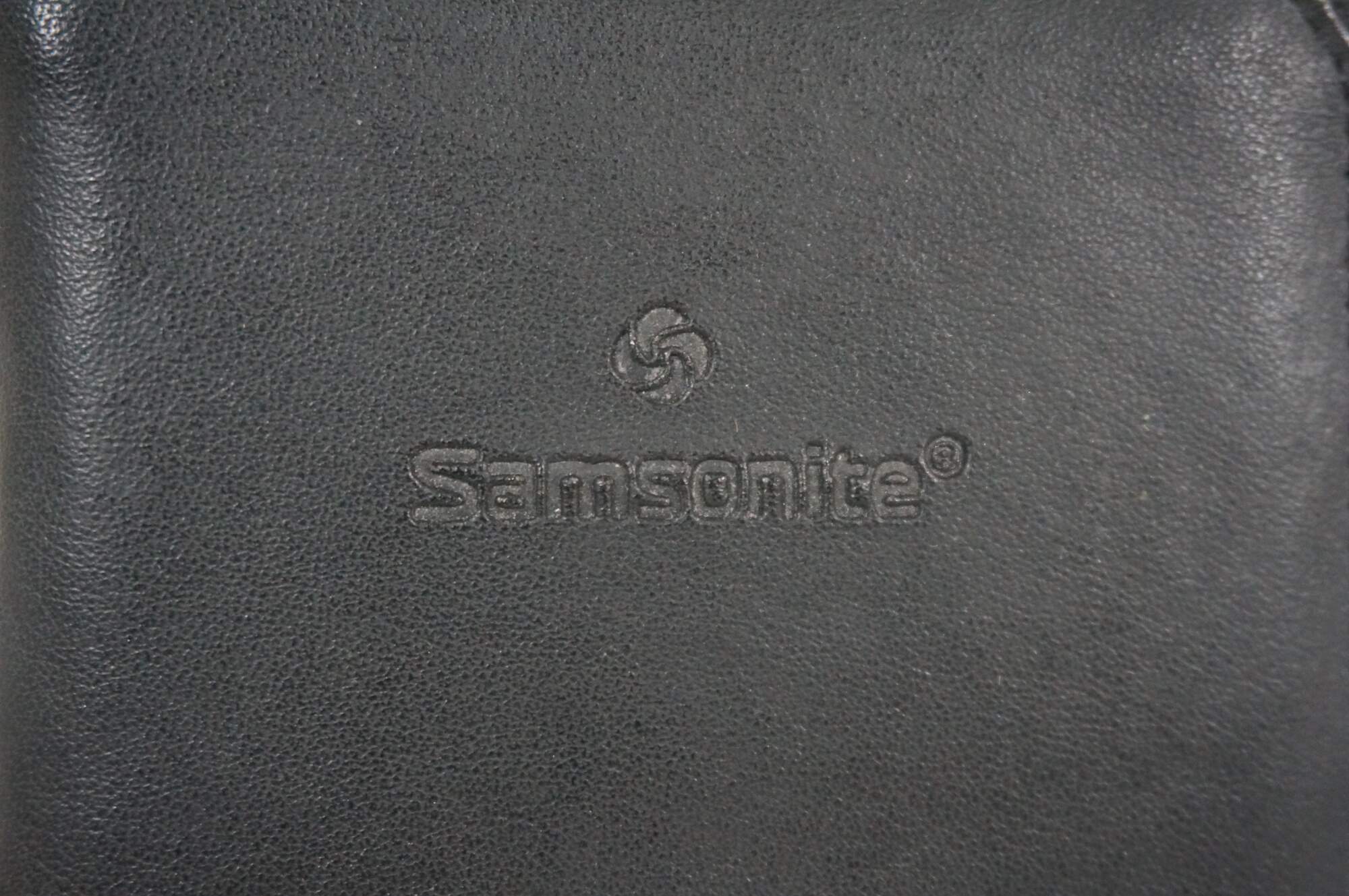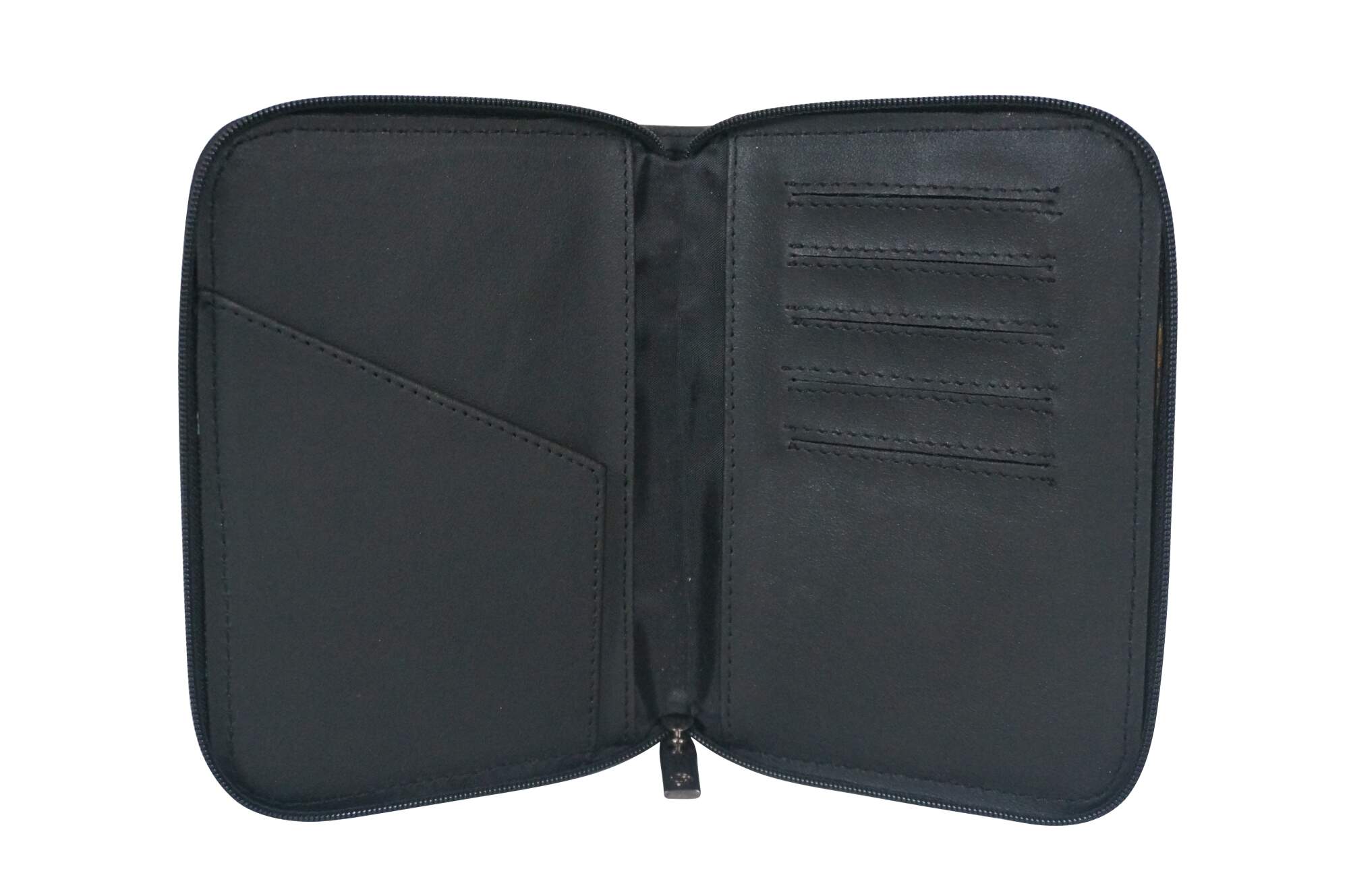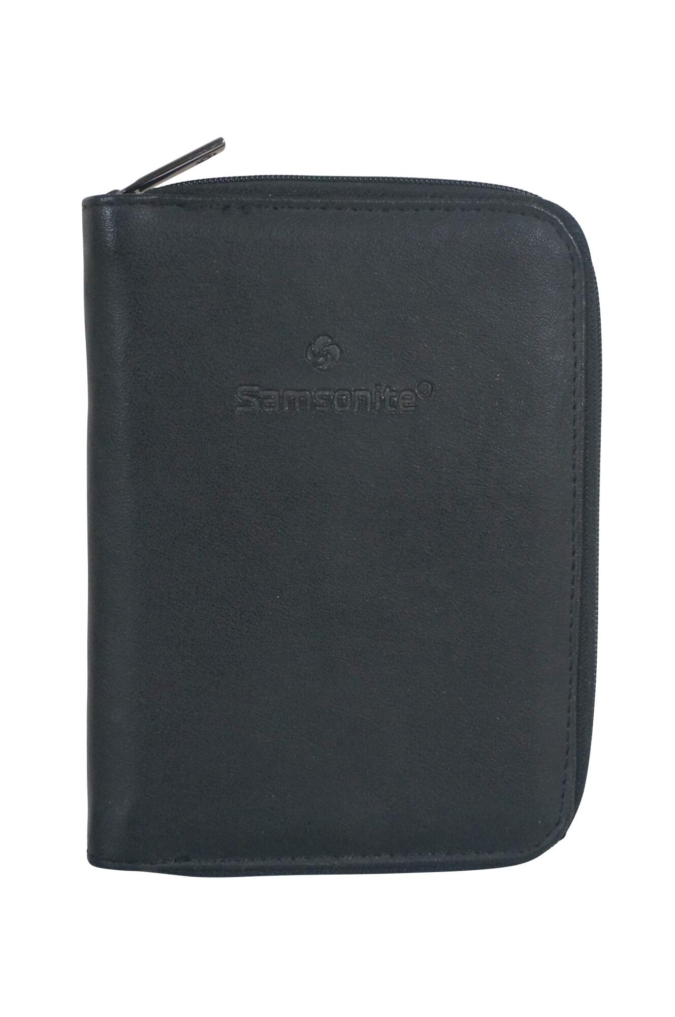 Pair of Samsonite black leather passport covers with slots for five credit cards and zippered closure.