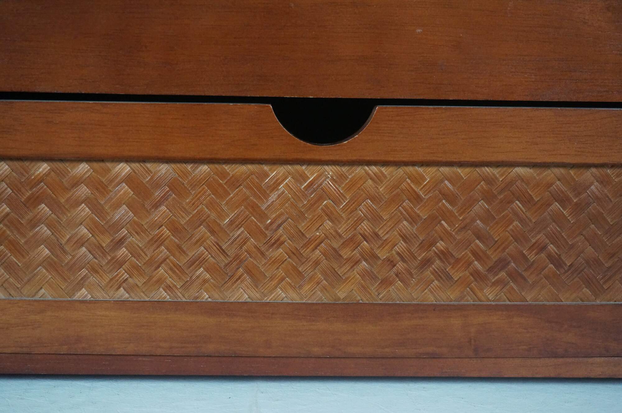 Vintage 20th century hardwood desk organizer with seven cubbyholes and one drawer with woven detail. Made in Thailand.