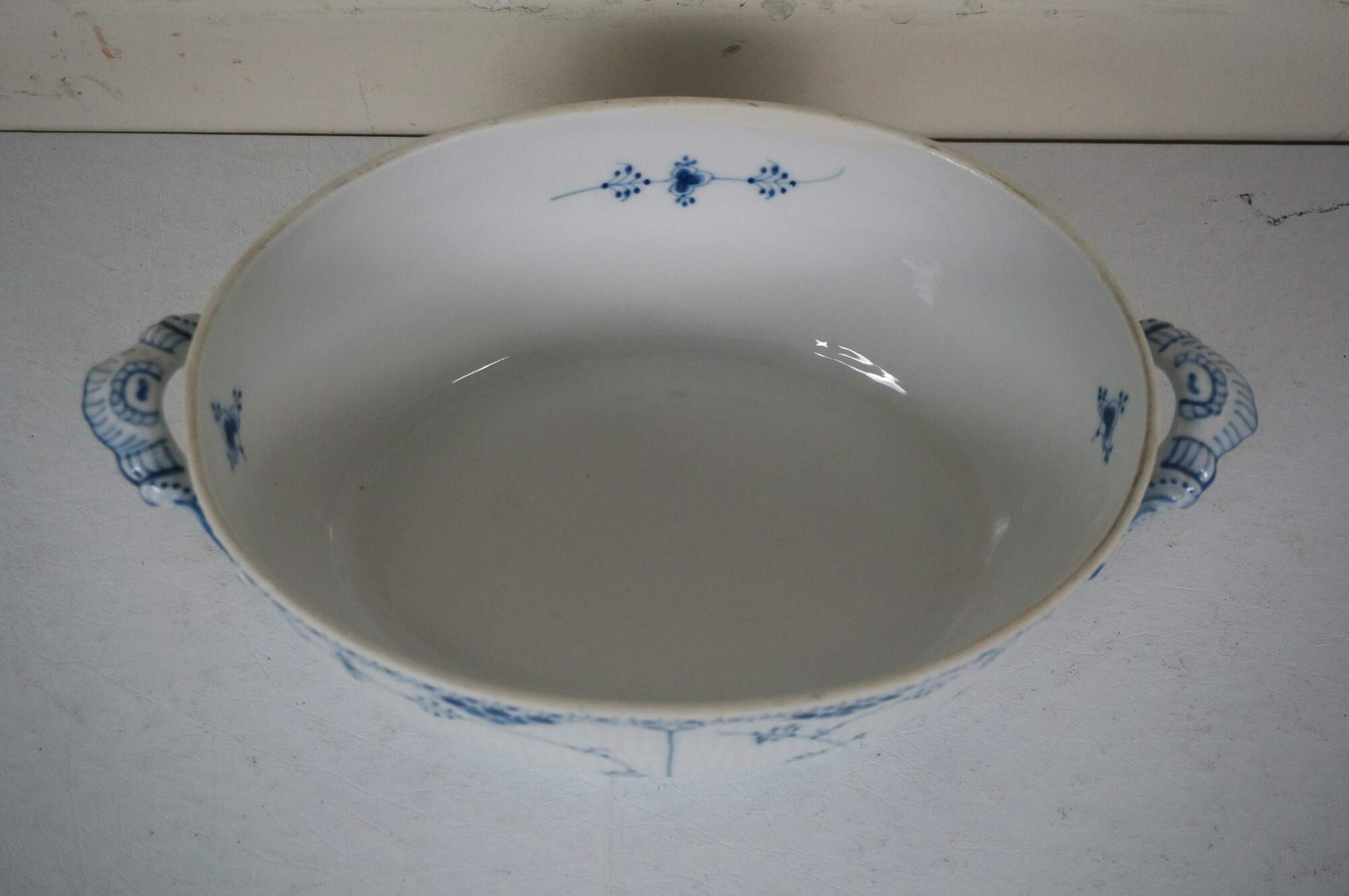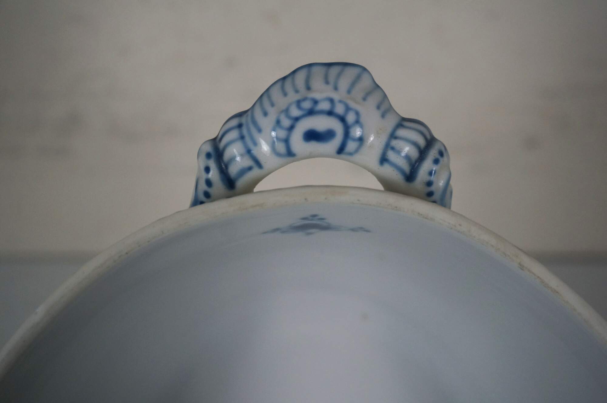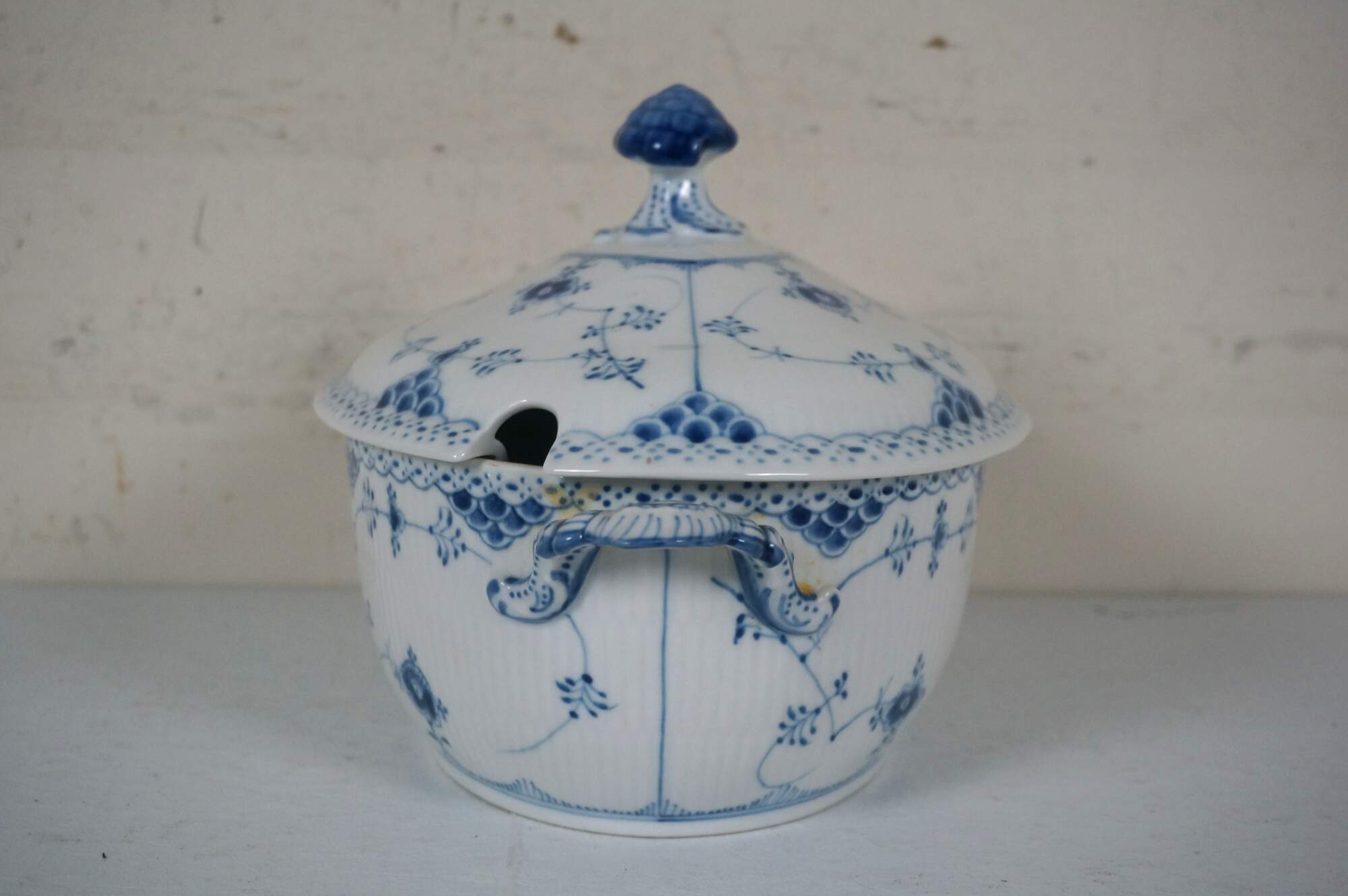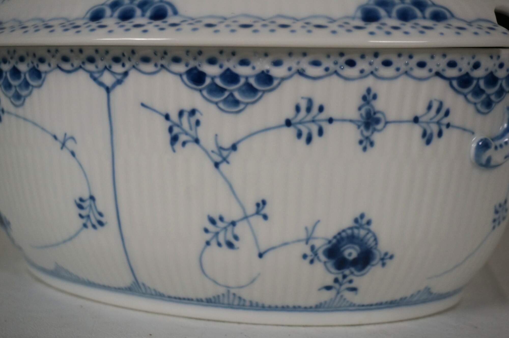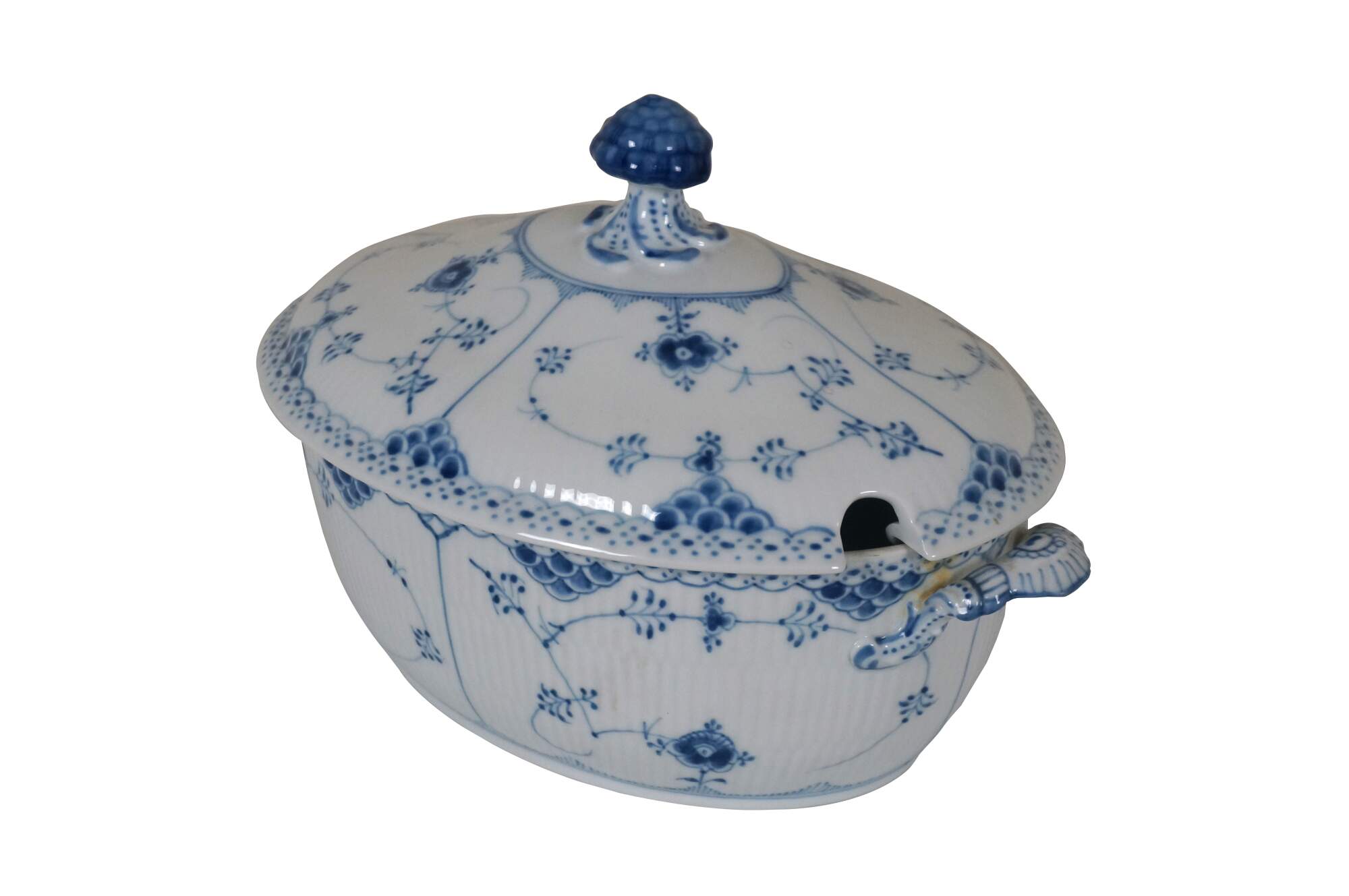 Mid 20th century lidded porcelain soup turreen by Royal Copenhagen in the Musselmalet aka Blue Fluted / Half Lace pattern. Oval shape with ribbed sides and scallop shaped handles and mushroom shaped finial. Blue and white hand painted floral and lace design. Green backstamp dated 1960 (indicated by line under R of Denmark on backstamp), blue factory mark and artists initials XQ, green item number 1/595.
