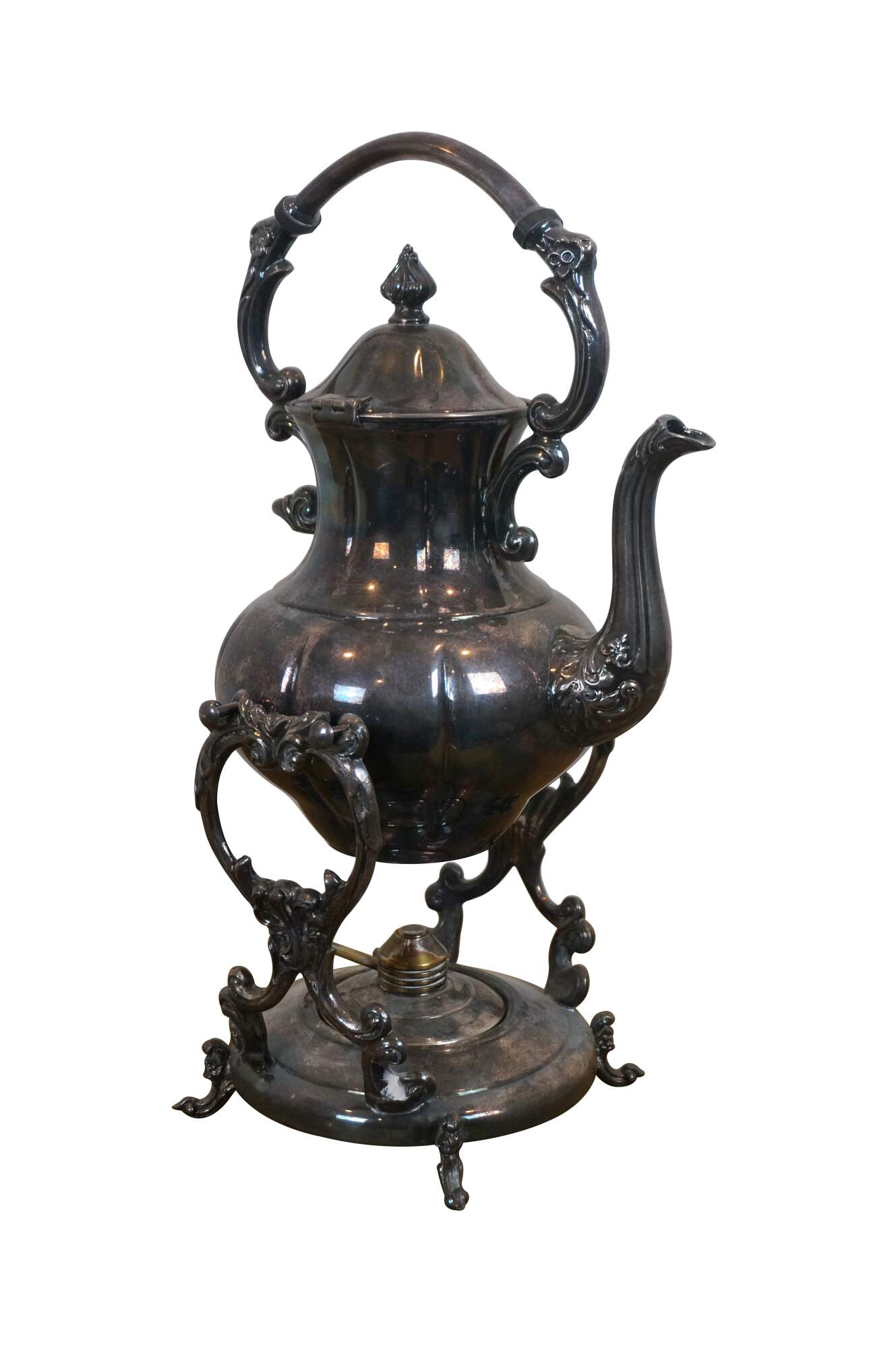 Mid to late 20th century silver plated tilting coffee / tea pot with stand and burner by Sheridan Silver Co. Design features scrolling foliates accented with small flowers.