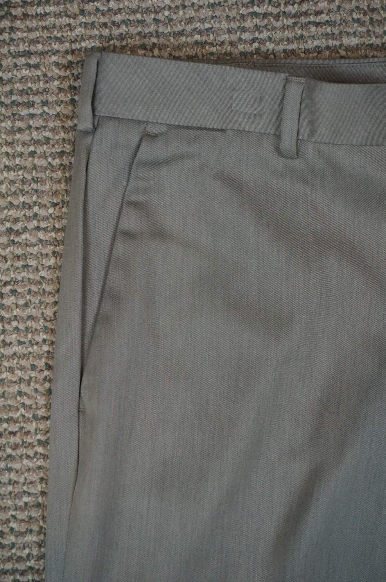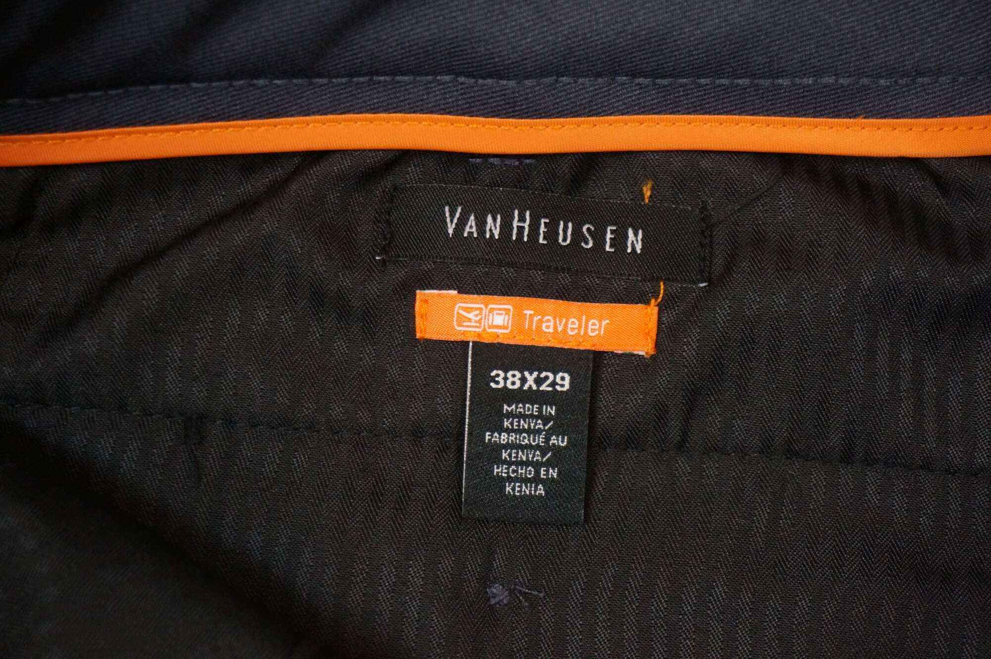 Two pairs of Van Huesen Ultimate Traveler men's pants. Ash Navy / Taupe HTR. Straight Fit - Sits Lower on the Waist - Straight Through the Leg - Straight to the Ankle - Flat Front. Premium No Iron with Soil Release, Wicking, UPF 50 Sun Protection, Flex Waistband, Permanent Crease and Machine Washable. 100% Polyester. Made in Kenya.