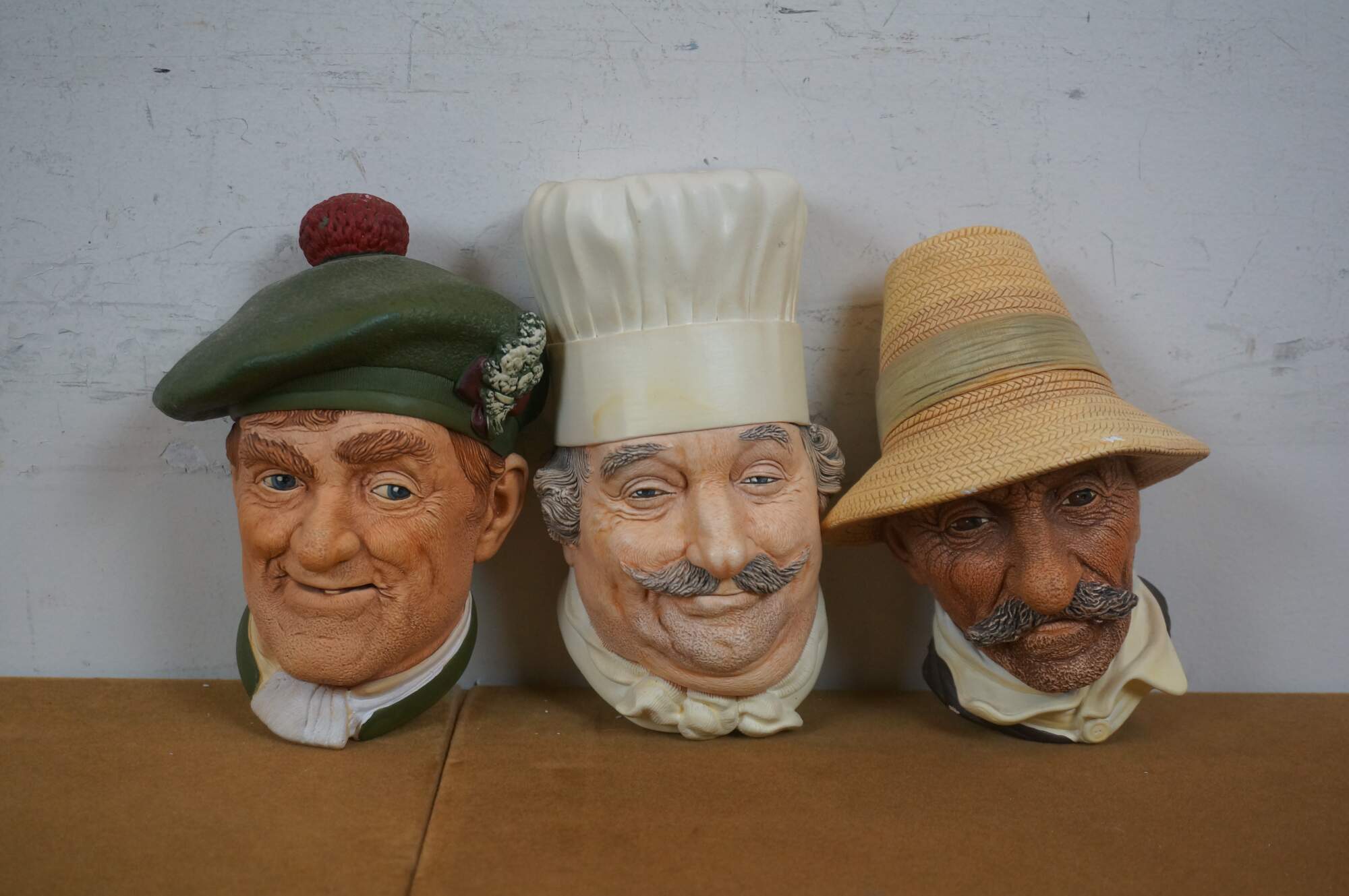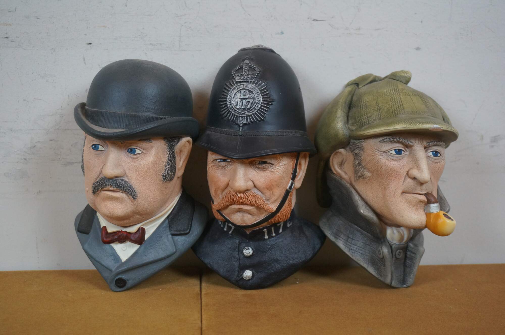 Lot of 27 mid to late 20th century Bosson's wall hanging chalkware busts / heads, representing a variety of characters including characters from literature such as Sherlock Holmes, historical figures like King Henry VIII and Anne Boleyn, folkloric heroes and assorted common folk of many regions and professions. Made in Congleton, England. Some include original tags.