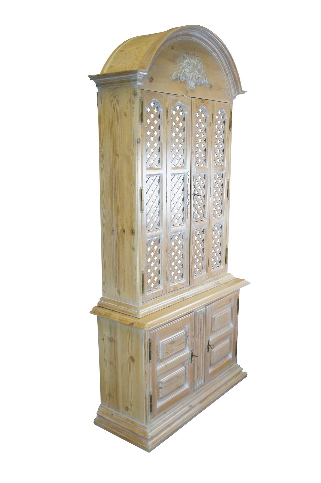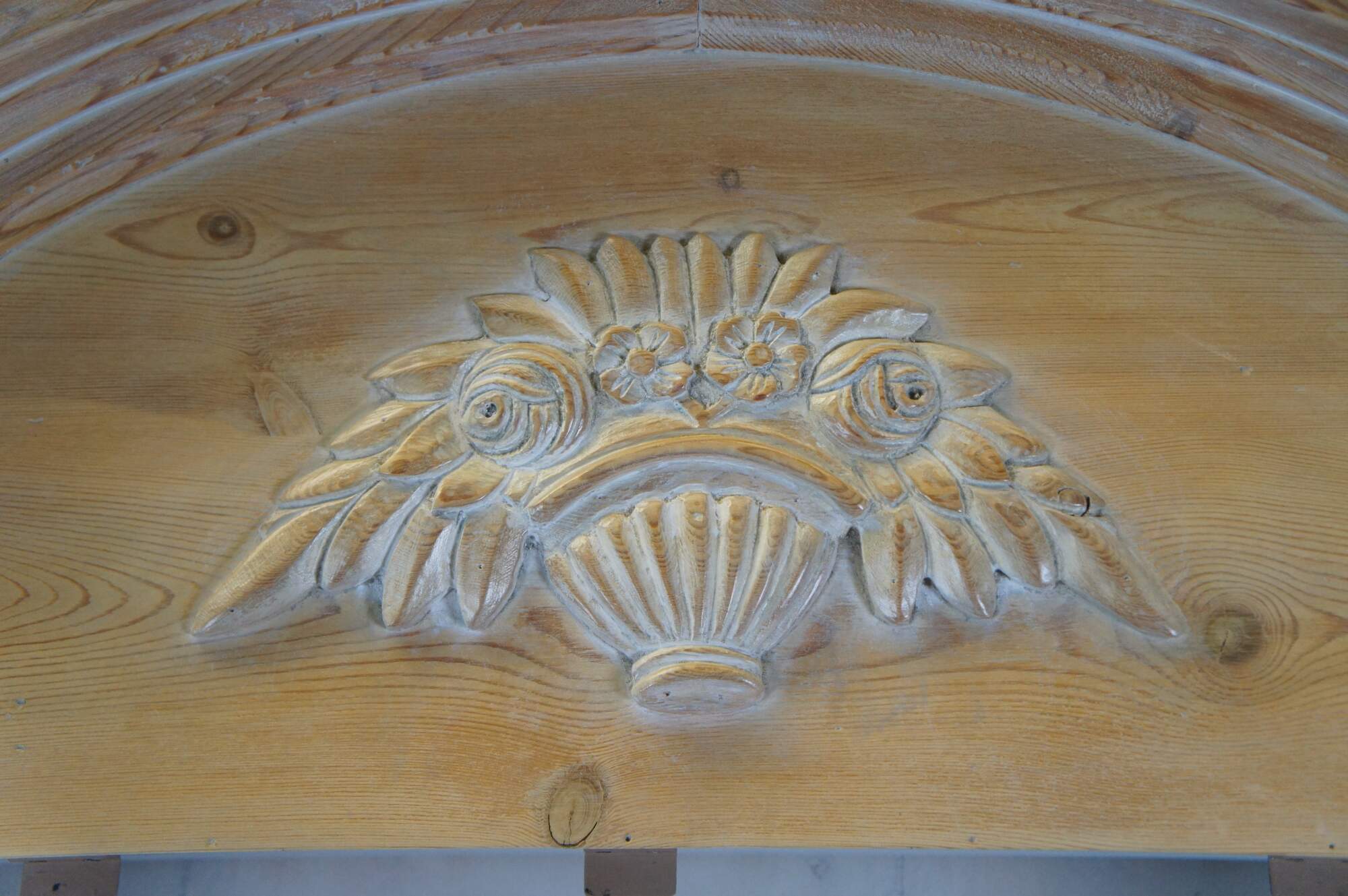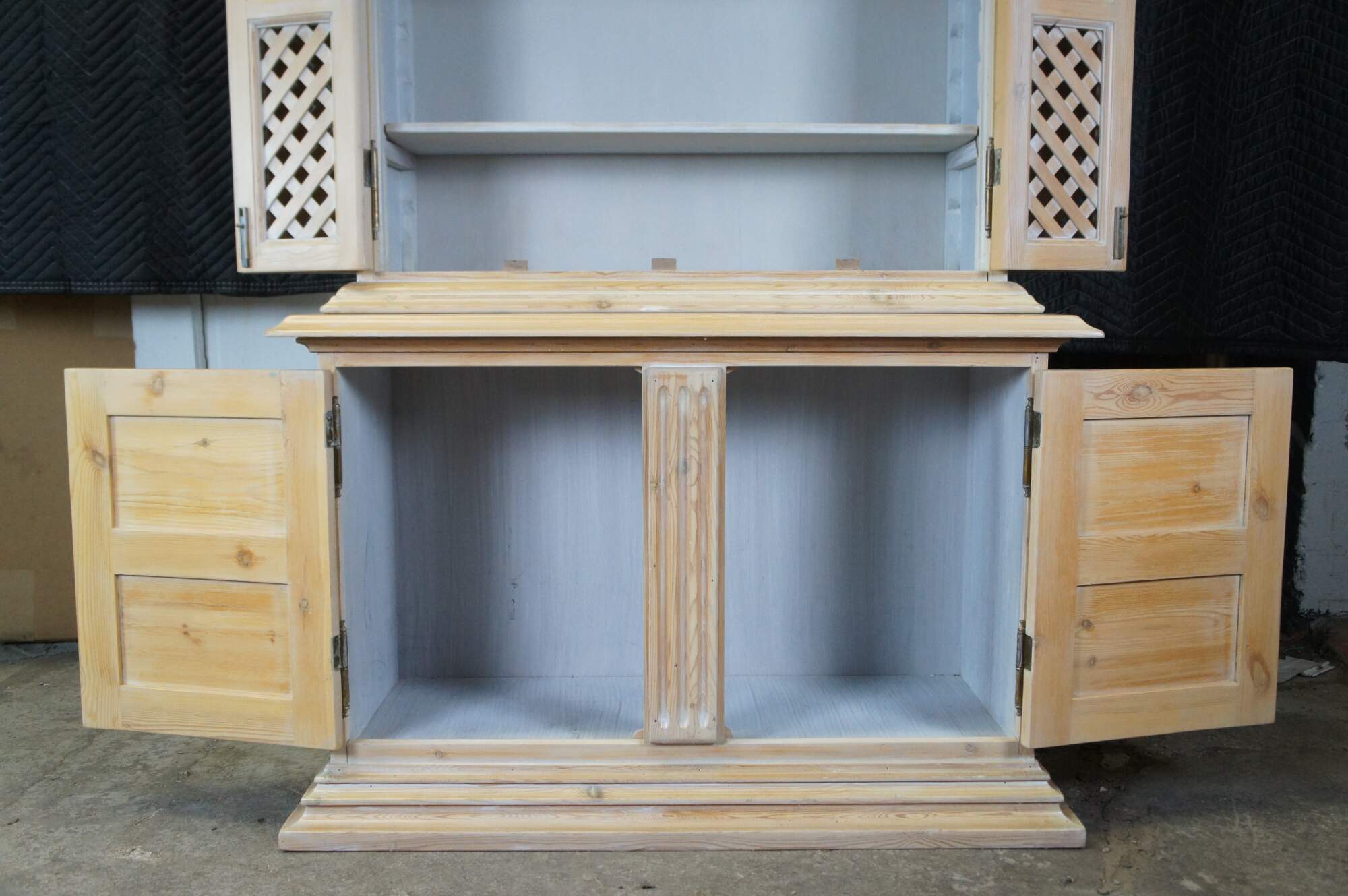 Vintage pine china hutch / vaisselier / bookcase by Chapman, circa 1980s. Features a French Country or buffet deux design with lattice doors, an arched top with floral carving and plenty of shelving for storage. Includes working keys.