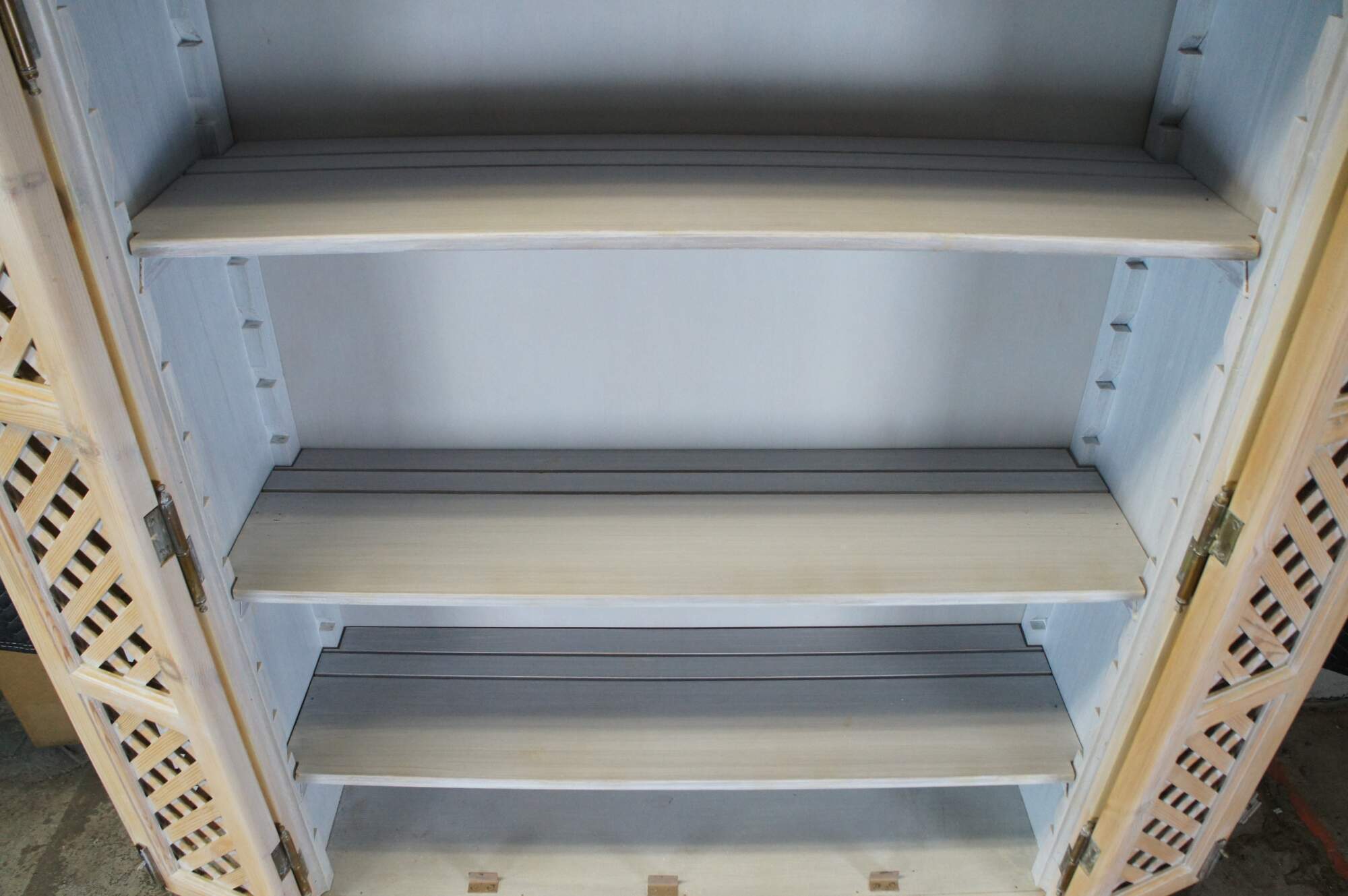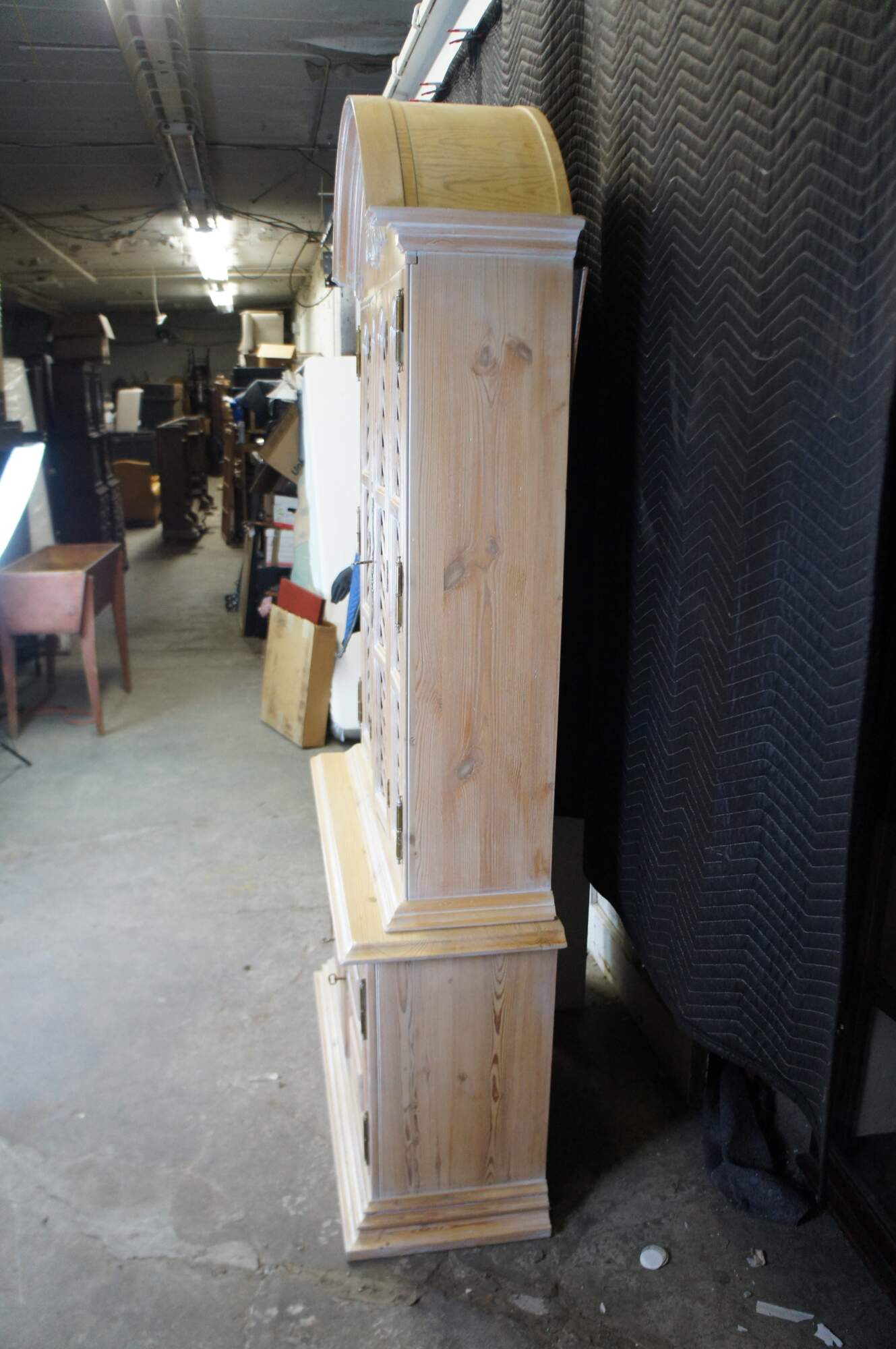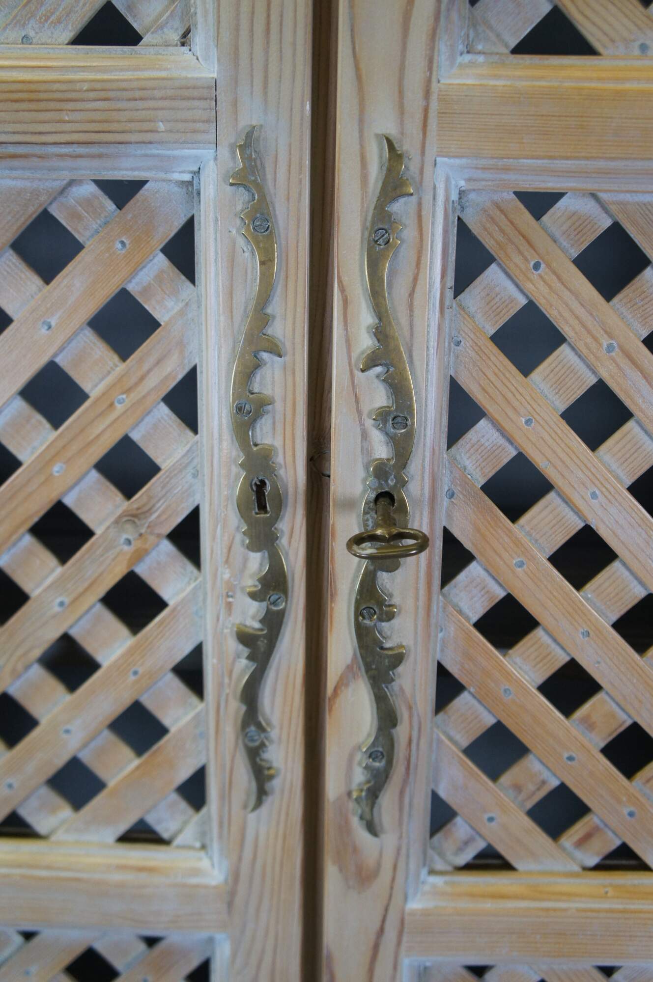 Vintage pine china hutch / vaisselier / bookcase by Chapman, circa 1980s. Features a French Country or buffet deux design with lattice doors, an arched top with floral carving and plenty of shelving for storage. Includes working keys.