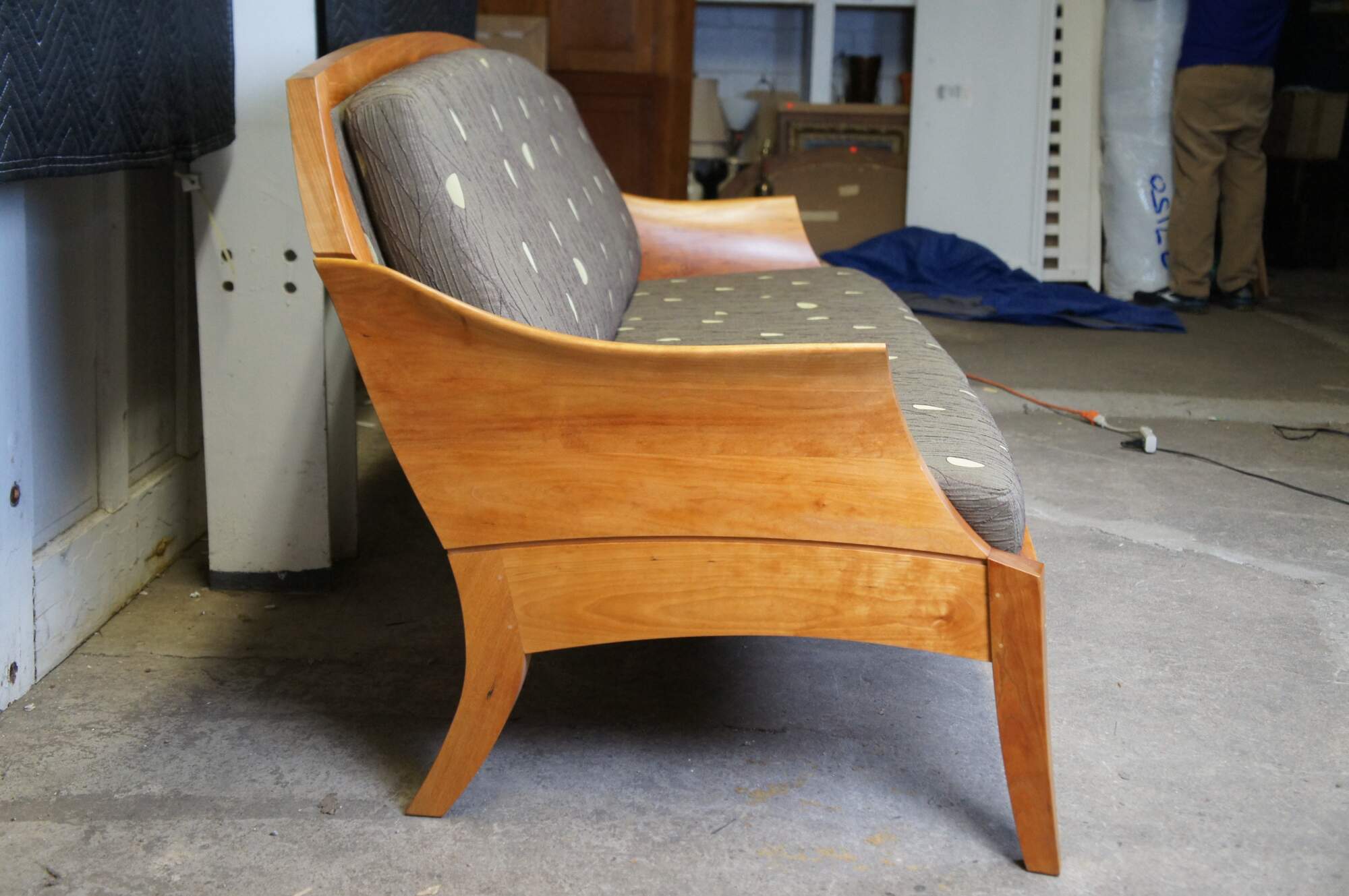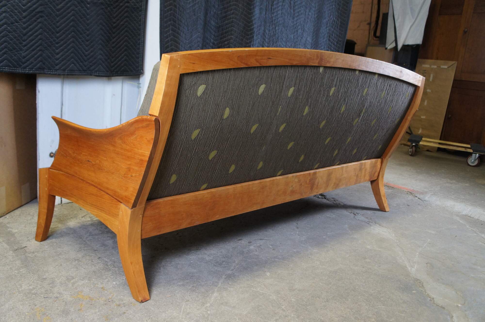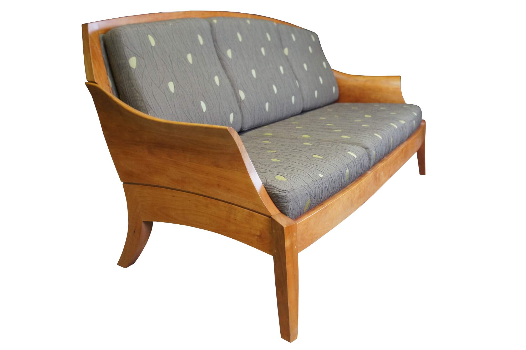 Vintage Thos Moser cherry Three Place Wing Sofa. With curved arms sculpted from grain matched solid wood, the Wing Three Place Sofa marries our handcraft and hallmark aesthetics with true comfort. Tracing its lineage back to an 18th-century Queen Anne chair, the sofa brings new relevance to old forms, coaxing solid cherry into freestanding art. The Wing Three Place Sofa is the satisfying result of artfully integrating both wood and upholstery to create a piece that both complements and defines the space it occupies. Made by Jasper Brann circa 2007. Thomas Moser Cabinetmakers Auburn, Maine.